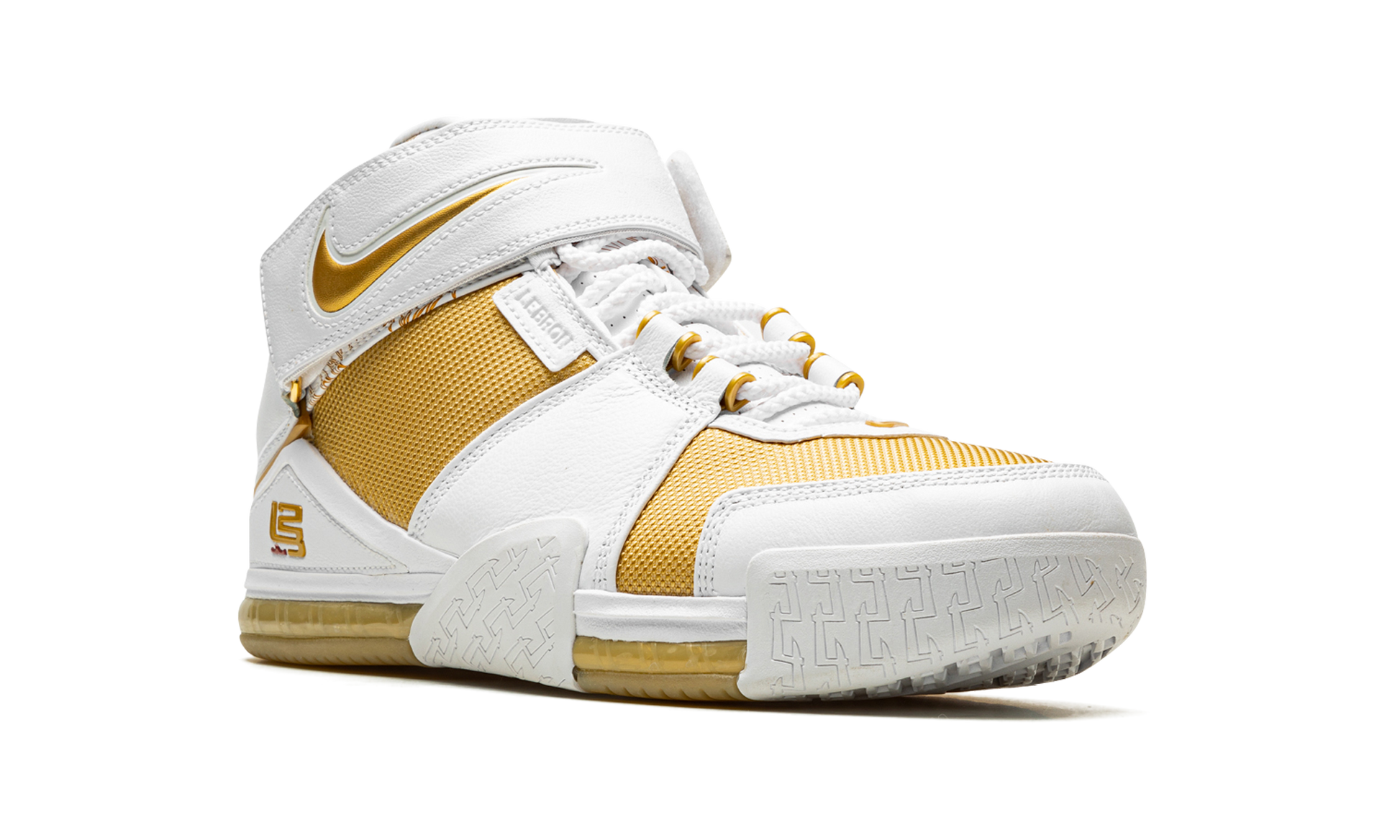 The Nike LeBron 2 “Maccabi Tel Avivâ€?is a former Player Exclusive colorway of LeBron James's second signature shoe with Nike Basketball that was given an official retail release in 2022. The “Maccabi Tel Avivâ€?colorway was worn by LeBron only once in his basketball career. during an exhibition game against Maccabi Elite Tel Aviv in 2004. Details include a golden textured upper with white leather overlays. The adjustable white leather ankle strap features gold “NIKEâ€?branding. LeBron's signature Nike Basketball logo appears on the lateral side of the white leather overlay above the midsole and on the medial side of the collar strap. A full-length Zoom Air cushioning system underfoot provides a responsive ride whether on or off the hardwood. Release date: September 23. 2022