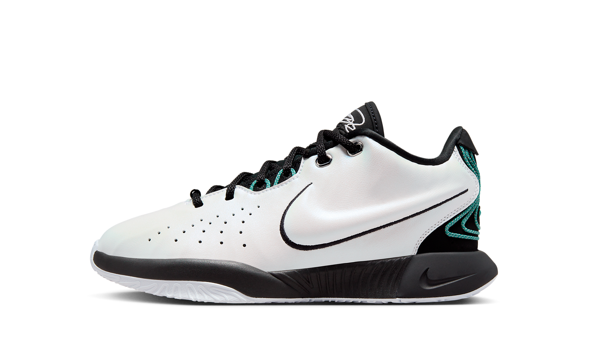 The Nike LeBron 21 GS “Conchiolinâ€?is the youth sizing of the colorway of LeBron James's twenty-first signature shoe inspired by the mollusk shell of the same name. Undoubtedly. the Nike LeBron 21 “Conchiolinâ€?is one of the most creative colorways in the Nike Basketball collection for the 2023-2024 NBA season. The upper features a white leather construction with a pearlescent finish. Black accents appear on the tongue. collar. and lateral Swoosh. while teal-colored detailing can be found on the medial Swoosh. eyestay loops. and heel. LeBron's signature branding is seen in orange on the tongue. Release date: December 19. 2023