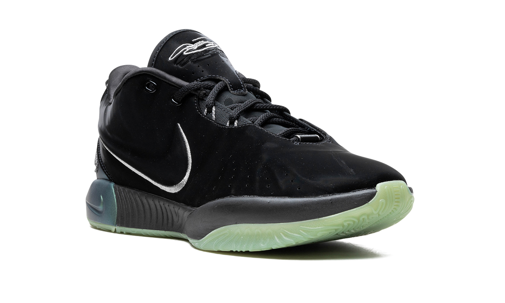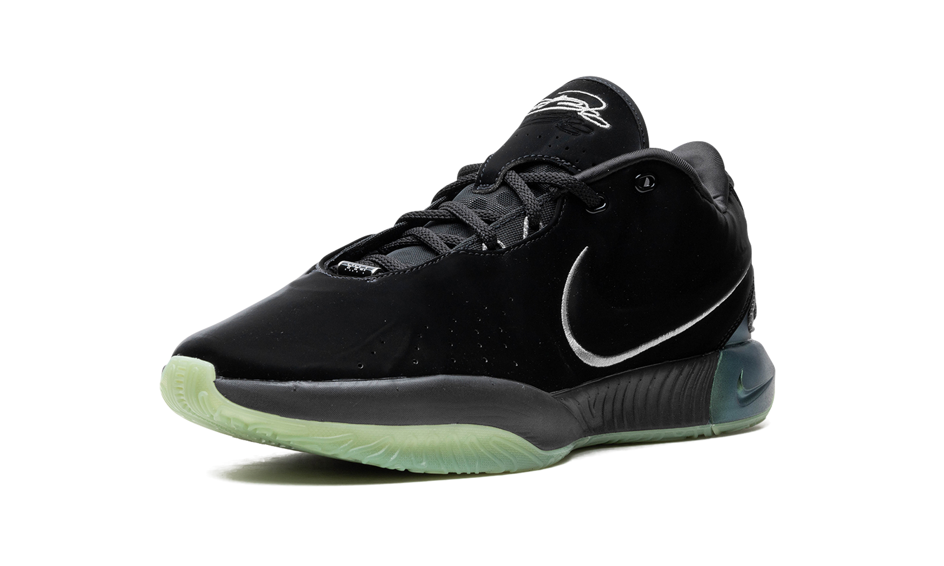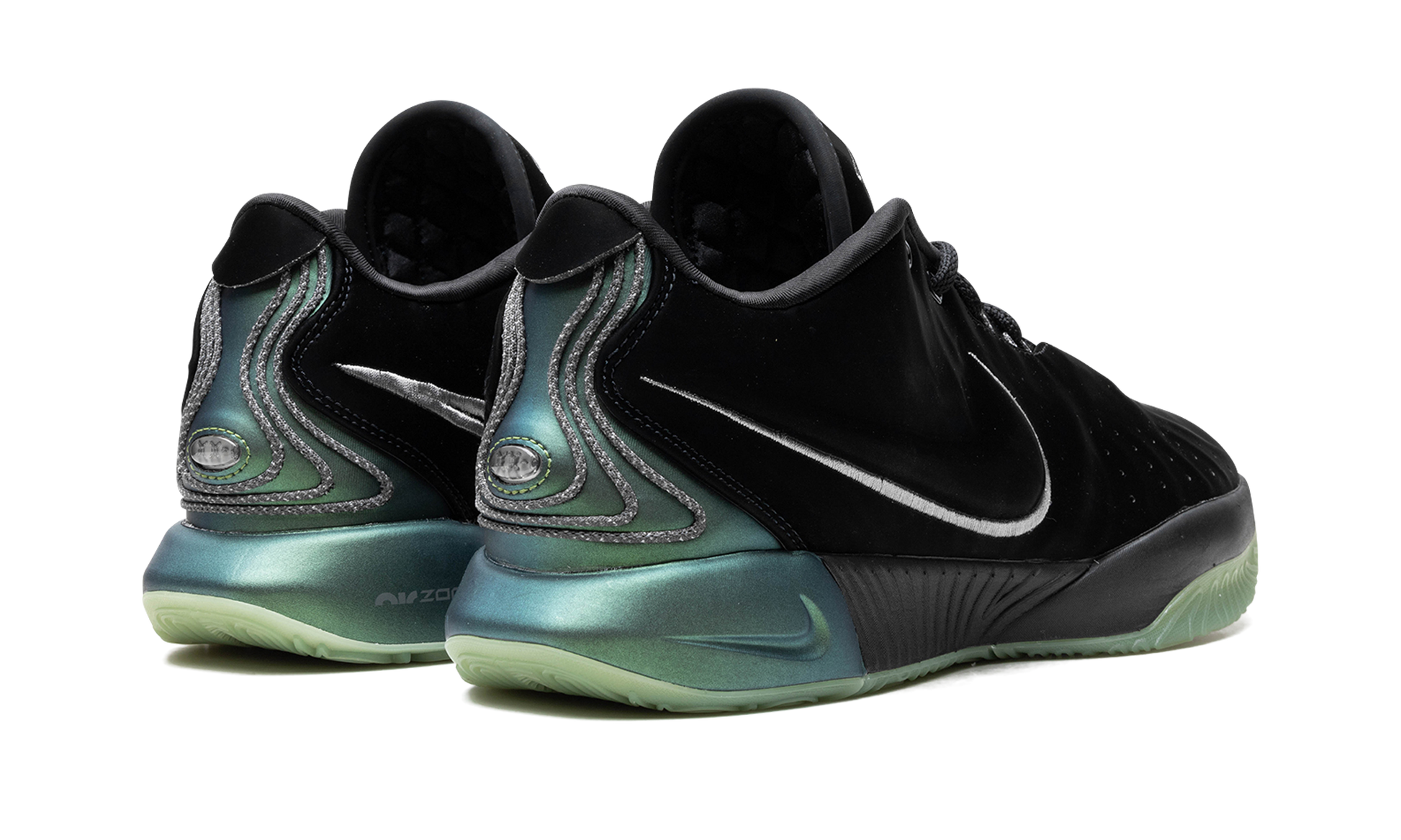 The Nike LeBron 21 "Tahitian" is a colorway of LeBron James's twenty-first signature shoe with Nike Basketball with iridescent features. The “Tahitianâ€?colorway features iridescent accenting on the heel and midsole that represent the glow of Tahitian pearls. The upper has a black. velvet-like synthetic construction with a shiny finish for a luxe look and feel. Underfoot. a black midsole and semi-translucent green outsole complete the look. Release date: November 3. 2023
