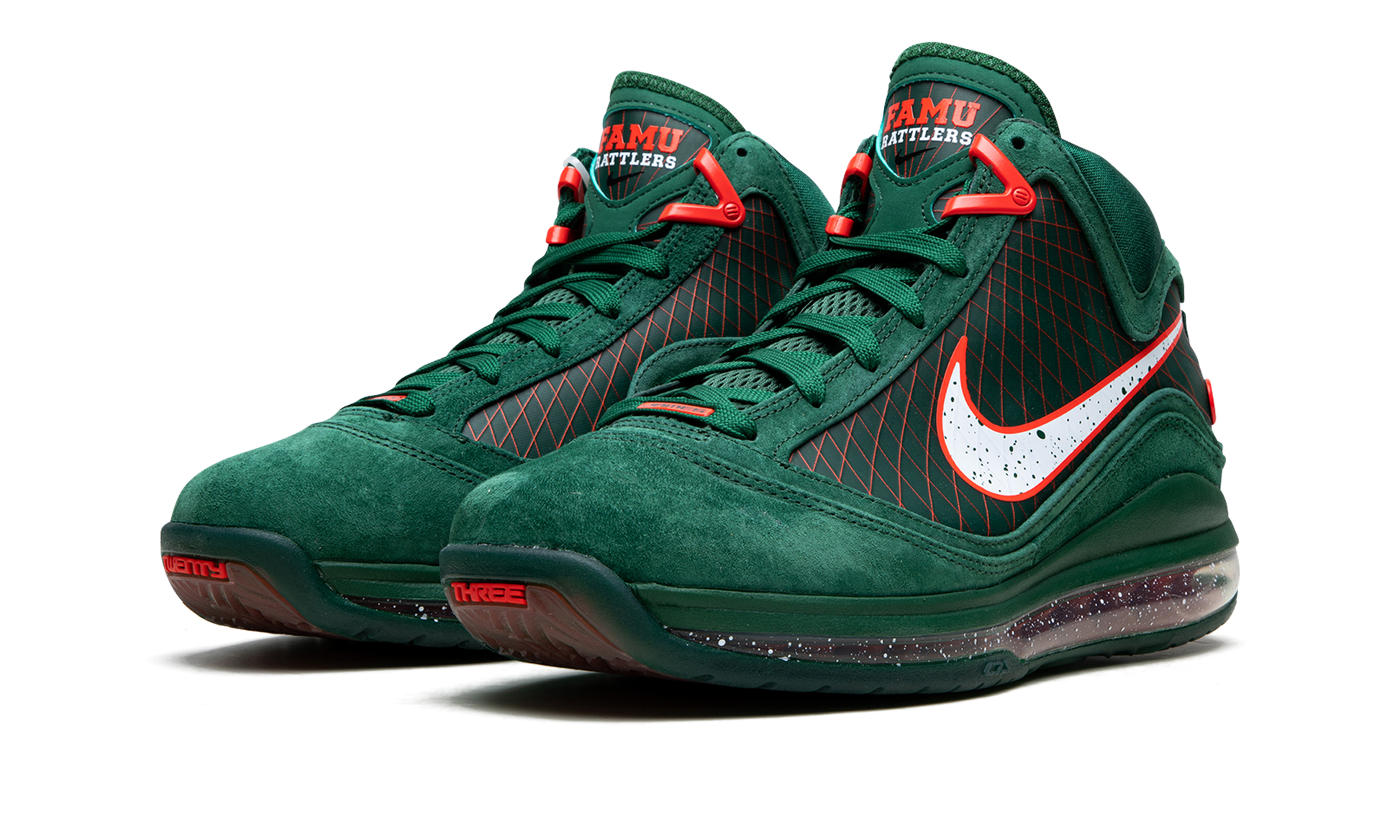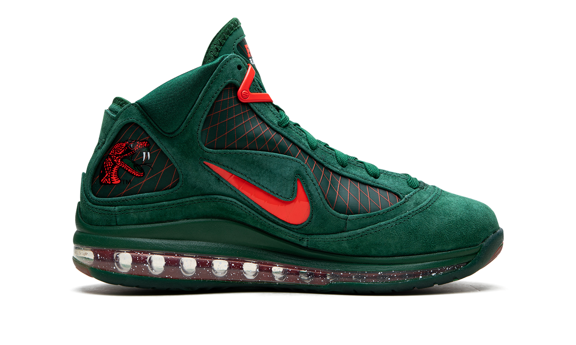 The Nike LeBron 7 “Florida A&Mâ€?is a colorway of LeBron James's seventh signature shoe with Nike Basketball that shows love to the University of Florida A&M and its athletic programs. The “Florida A&Mâ€?design features the team uniform colors found on the Historically Black University's sports teams. A buttery soft Gorge Green suede mudguard meshes with tonal suede overlays throughout. Orange Flywire detailing is embedded within the base. A white Swoosh with green speckle detailing and orange trim appears on the mid-panel. a mini orange “L23Jâ€?emblem covers the heel and LeBron James's signature dots the tongue. Heel-to-toe visible Air provides comfort whether on the court or the streets. Release date: March 1. 2023