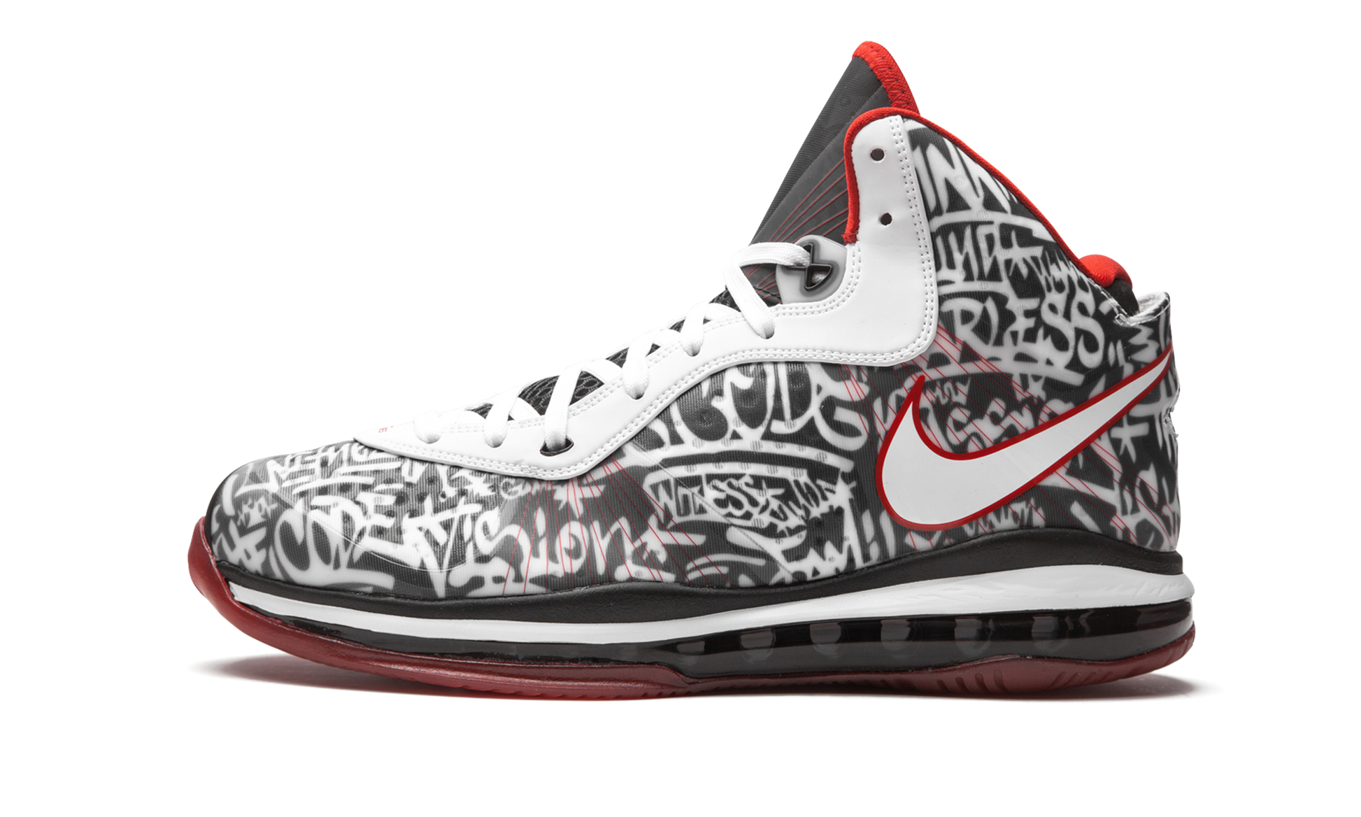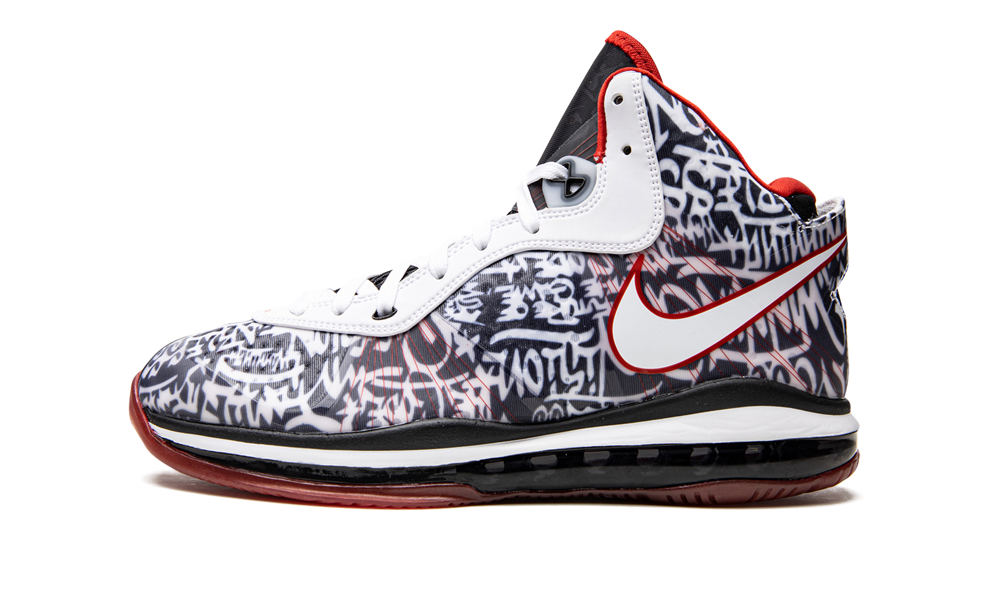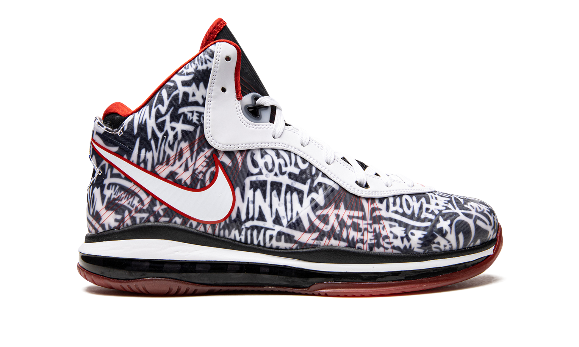 The Nike LeBron 8 QS “Graffitiâ€?is a January 2021 release of LeBron James's eighth signature shoe with Nike Basketball in a colorway that James debuted as part of the #LeBronWatch campaign. Established in 2018. #LeBronWatch gives sneaker collectors the opportunity to wear Player Exclusive colorways of various Nike LeBron models. including the LeBron 8 “Graffiti.â€?which launched the 2021 #LeBronWatch series in earnest when “King Jamesâ€?teased the shoe on his Instagram page. LeBron had previously worn the Nike LeBron 8 “Graffitiâ€?back in 2011 during an exhibition game between the Goodman League and Melo League. The "Graffiti" motif originally appeared on the LeBron 4. As for the design of this shoe. various graffiti-style slogans adorn the upper. Phrases like “winningâ€?and “fearlessâ€?appear in the black and white pattern. A red accented Swoosh logo can be found on either side of the shoe and white leather detailing is located along the eyelets. Underfoot. full-length Air Max cushioning provides all-day comfort. Release date: January 23. 2021.