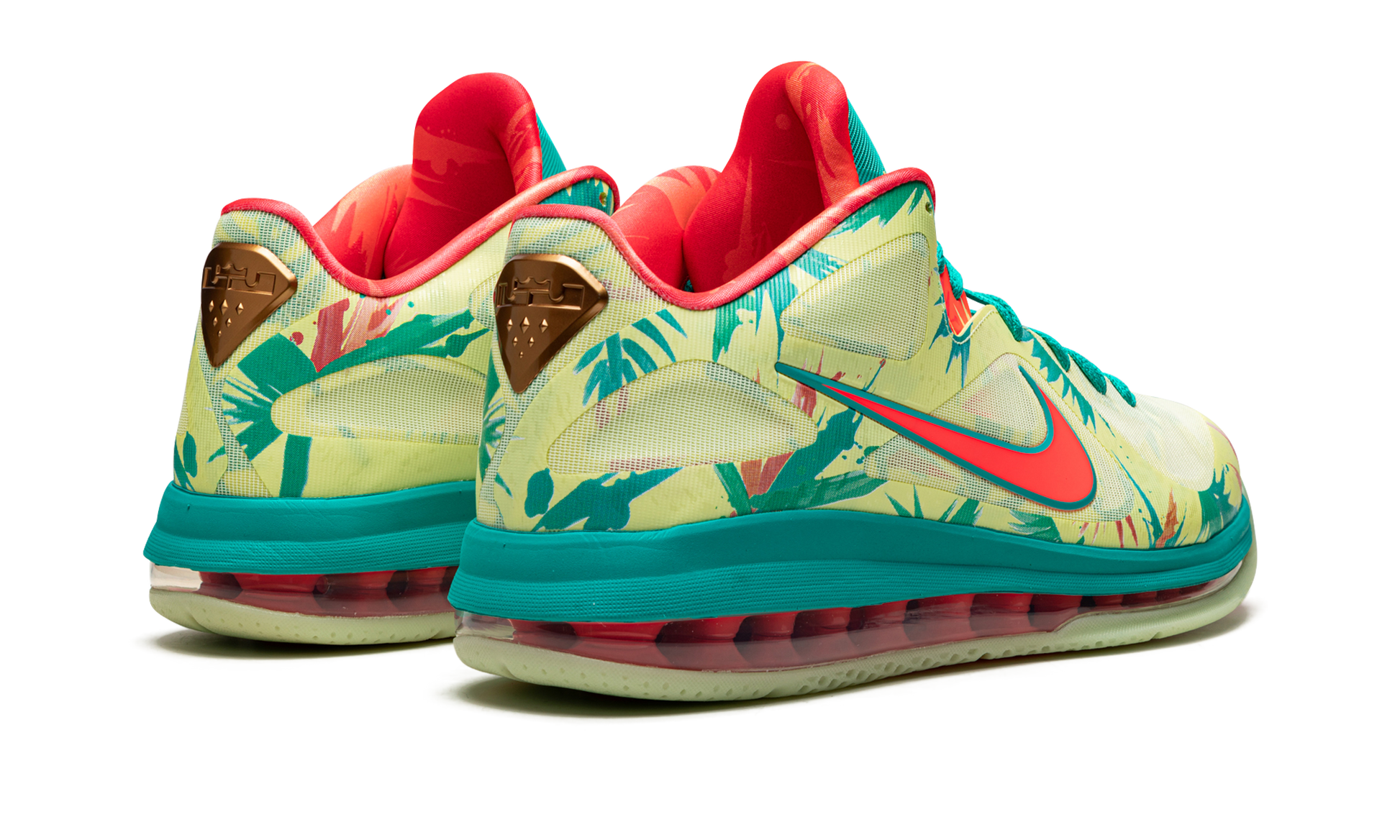 The Nike LeBron 9 Low “LeBronald Palmerâ€?is a modern re-release of the former Player Exclusive colorway of LeBron James's ninth signature shoe that he wore in 2012. The Nike LeBron 9 Low “LeBronald Palmerâ€?is one of several former Player Exclusive shoes from the 2011-2012 era of Nike LeBron footwear to be brought back in the present day. joining the Nike LeBron 9 “Watch the Throne.â€?and more. The “LeBronald Palmerâ€?colorway is inspired by LeBron's favorite beverage. the Arnold Palmer. which combines iced tea and lemonade. The design features a vibrant green and orange tropical look with an orange Swoosh on either side. Teal green accents come into play on the foam midsole. on the laces. and on the mesh tongue. Elsewhere. orange detailing can be found on the interior. LeBron's signature is printed on the tongue. Underfoot. a full-length visible Air cushioning system completes the look.