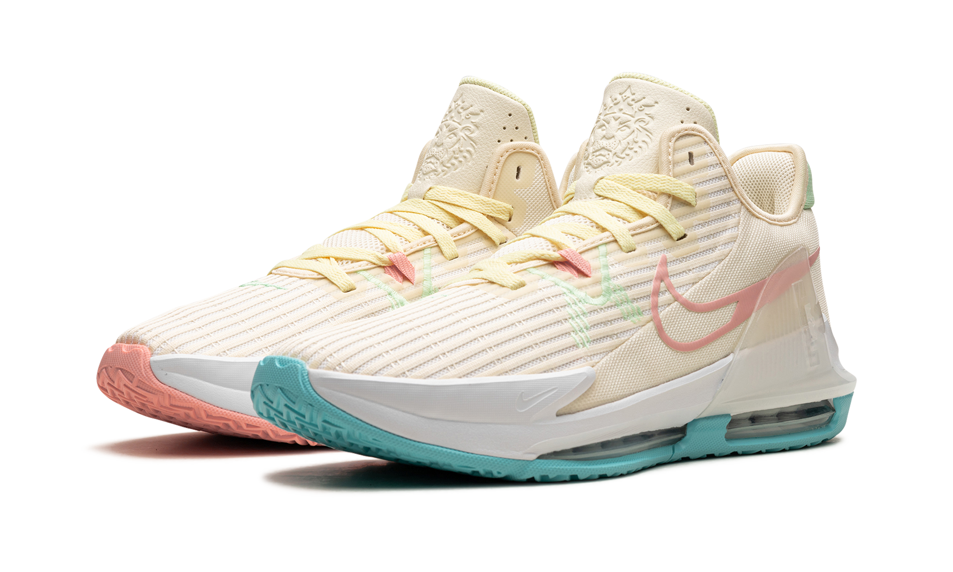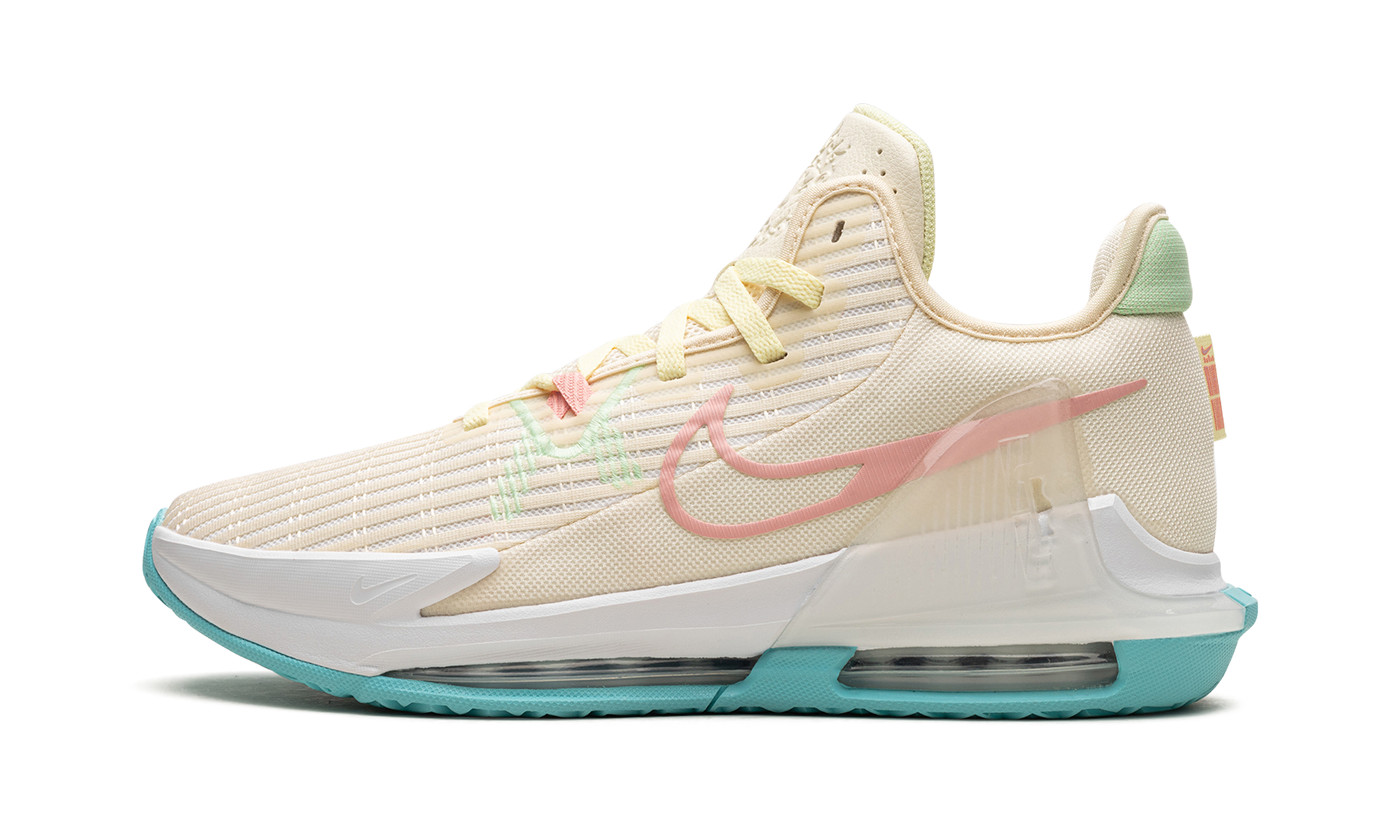 The Nike LeBron Witness 6 “Easterâ€?is a colorway of the alternate version of LeBron James's sixth signature basketball shoe with an Easter-inspired look. The colorway is complete with a yellow ribbed mesh upper that's contrasted with pastel hues throughout the design. A pastel pink outline Swoosh appears on both sides. Pastels in pink and green are incorporated onto different design elements. Underfoot. the white rubber midsole with full-length Air Max cushioning is contrasted with a teal rubber outsole on the left shoe and a pink rubber outsole on the right shoe. Release date: May 1. 2022