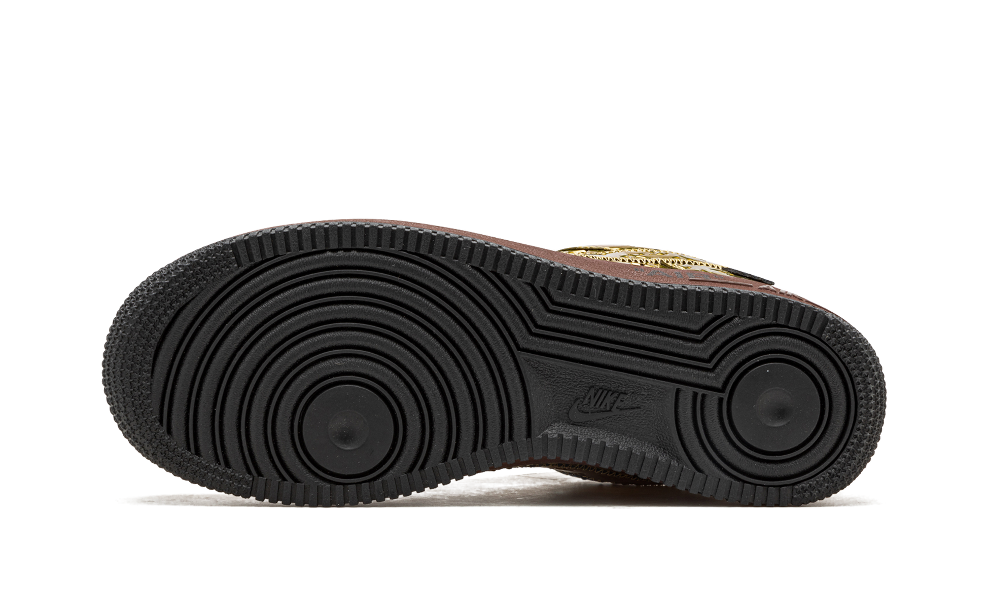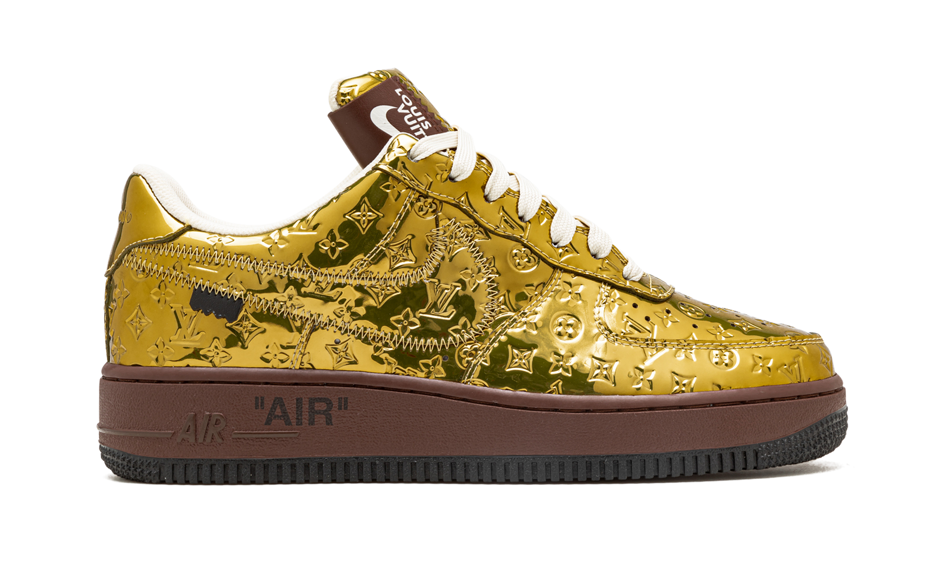 The Louis Vuitton x Nike Air Force 1 Low “Metallic Gold is the coveted golden colorway included in the special collaboration between the storied high fashion house and Nike that was directed by the late Virgil Abloh. One of multiple colorways of the Air Force 1 produced by Louis Vuitton. Nike. and Abloh in 2022. the “Metallic Goldâ€?features a monochromatic gold leather upper with Louis Vuitton's famous monogram print stamped into the material. A stitched Swoosh outline appears on both sides of the shoe. Signature details include a reworked “Louis Vuitton Air Force 1â€?logo on the side of the tongue. and a brown tab on the lateral side of the Swoosh on the mid-panel. The shoe rides on a brown rubber sole. Made in Italy.