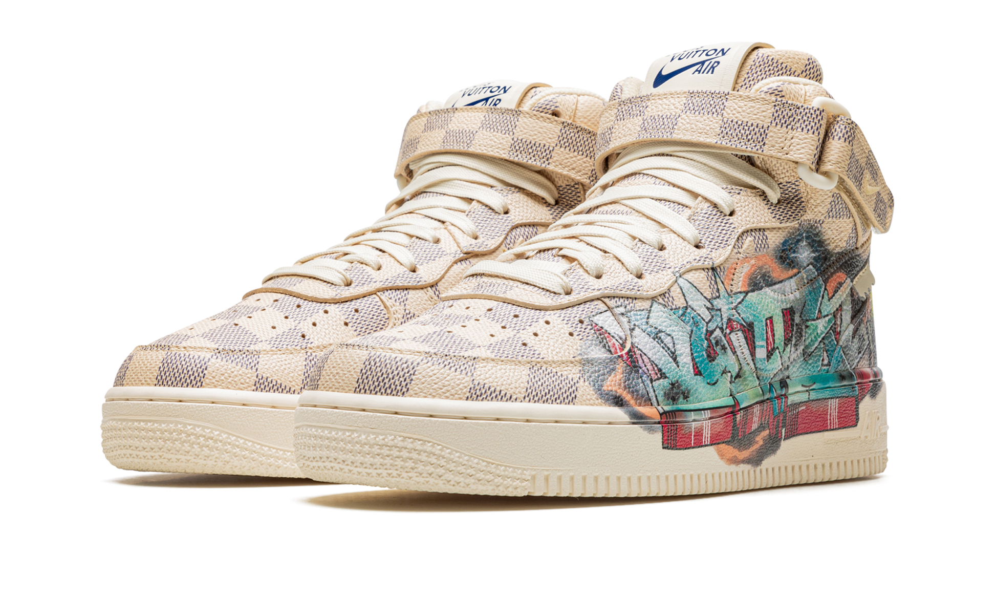 The Louis Vuitton x Nike Air Force 1 Mid “Graffitiâ€?is a desirable colorway of the classic sneaker from the collaboration by the storied high fashion brand that was directed by the late Virgil Abloh. The “Graffitiâ€?is one of multiple colorways of the Air Force 1 produced by Louis Vuitton. Nike. and Abloh in 2022. and unequivocally one of the most sought after releases of the year. as well. As for the shoe's design. it features a monochromatic cream-and-grey leather upper with Louis Vuitton's famous monogram print stamped into the material. A Swoosh outline appears on either side of the shoe. but is hidden underneath original artwork by Ghusto Leone on the lateral side. Other design elements include a reworked “Louis Vuitton Air Force 1â€?logo on the side of the tongue and a white tab on the lateral side of the Swoosh on the mid-panel. The shoe rides on a brown rubber sole. Made in Italy.