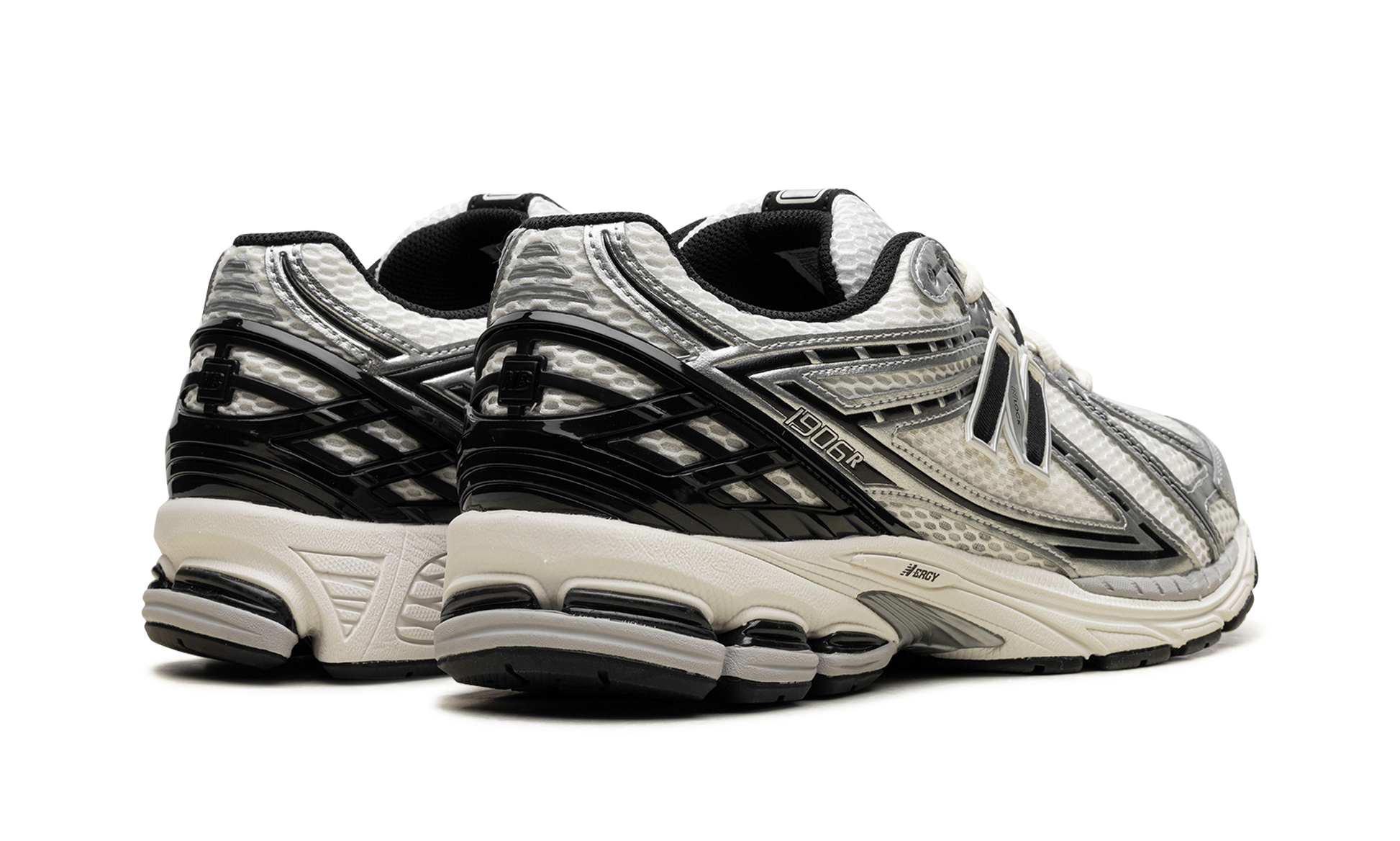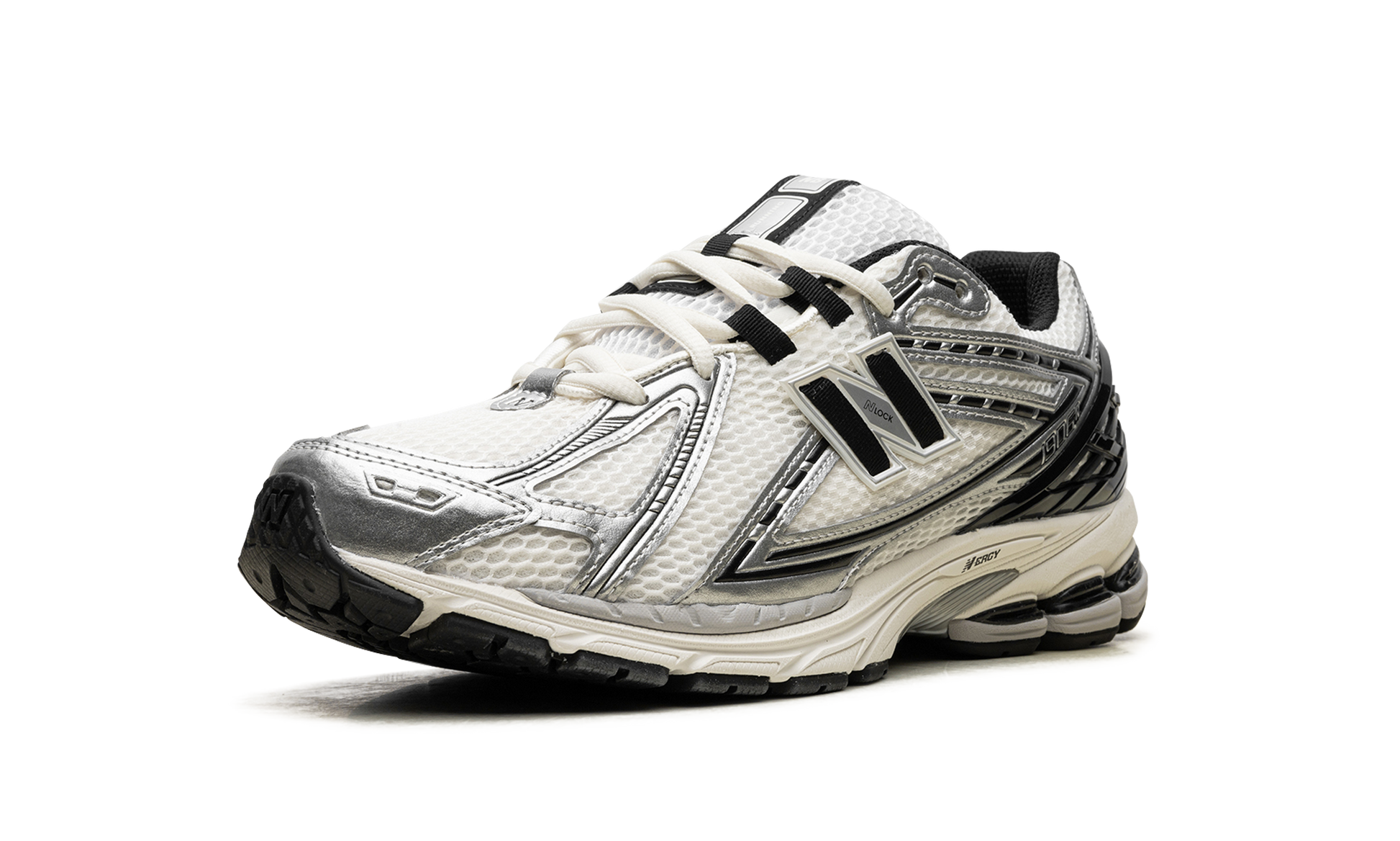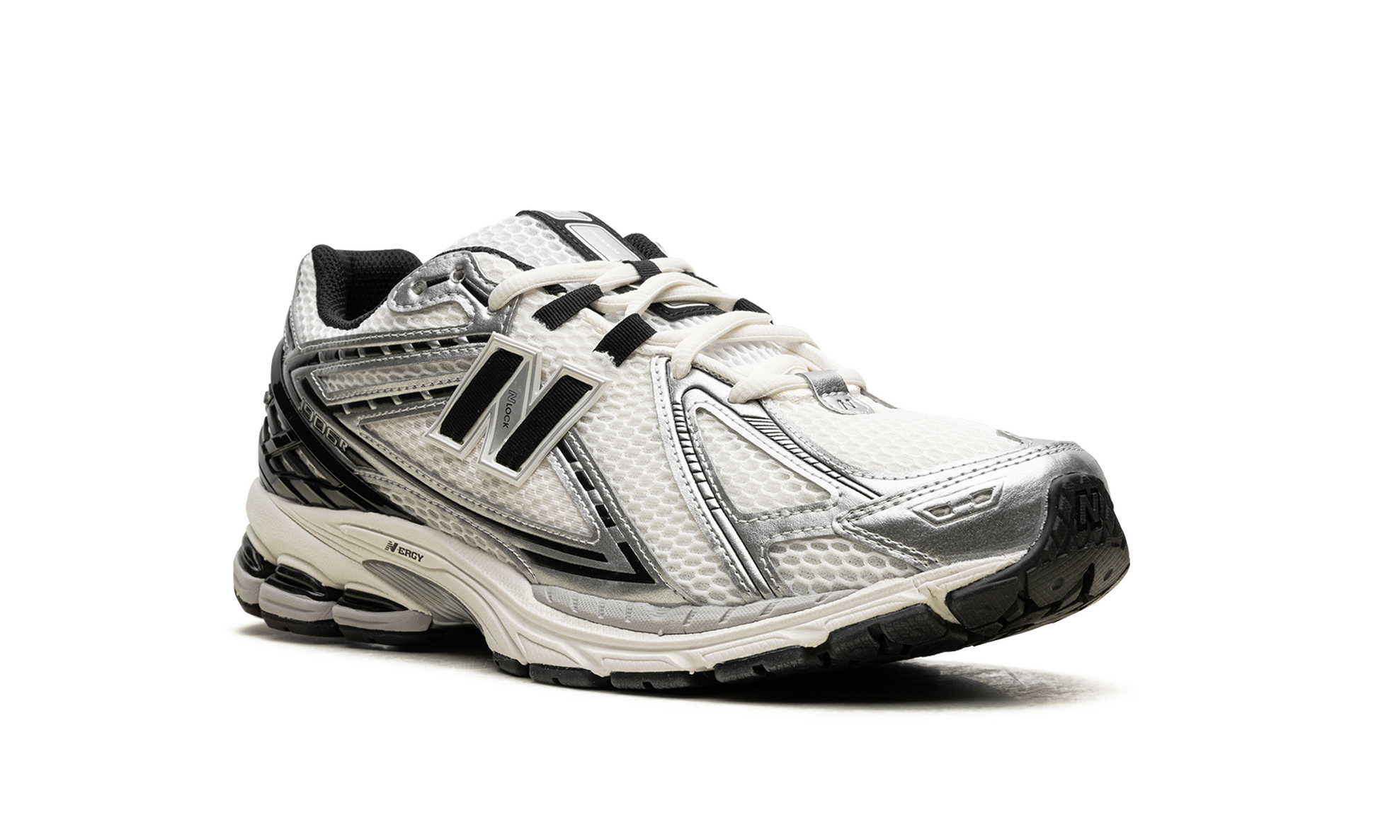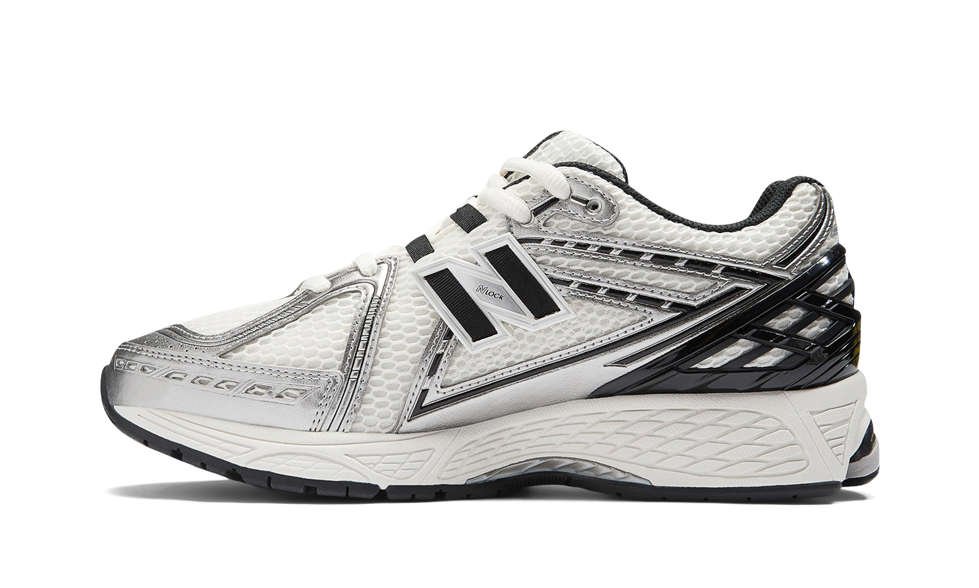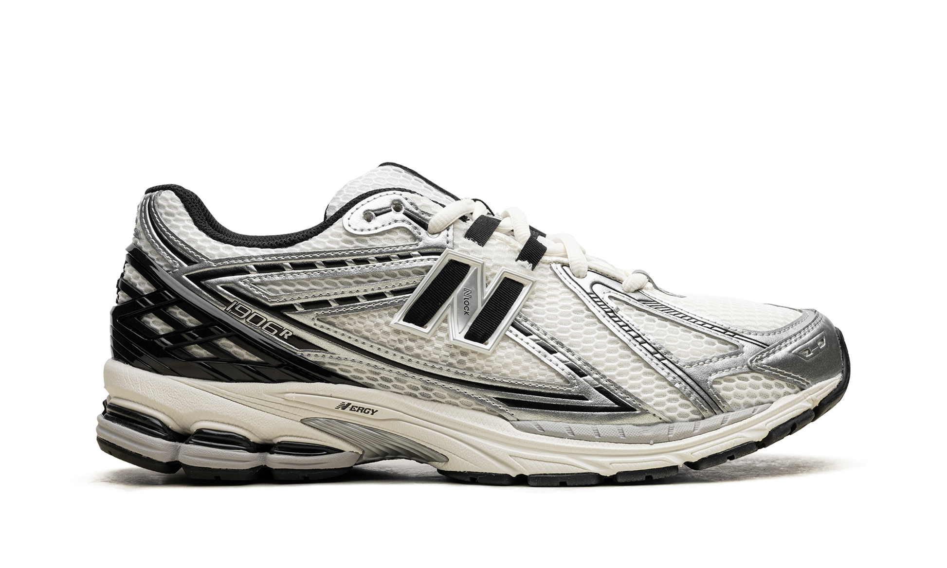 Discover the versatile New Balance 1906R "Metallic Silver/Black." a retro sneaker reimagined for today. Originally a performance running shoe. this style returned in the 2020s with a fresh appeal. It features a white mesh upper with striking Metallic Silver synthetic leather overlays accented in black. A black "N" logo adds a classic touch. while comfortable cushioning ensures all-day wear.