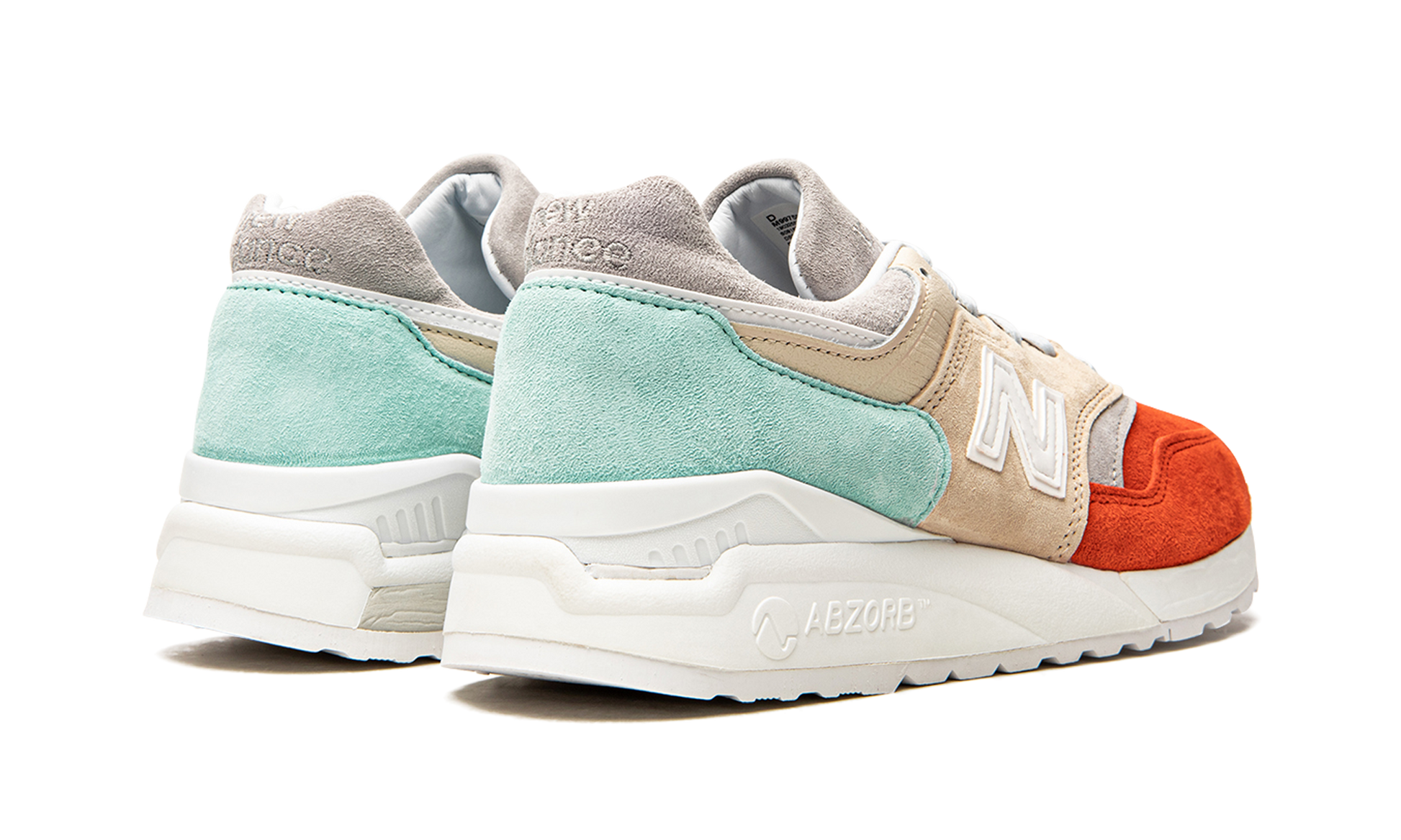 These sneakers from the Mykonos collection are a collaboration between New Balance and designer Ronnie Fieg. They utilize the Made in USA 997.5 silhouette with inspiration from the Nammos resort in Mykonos. Greece. The Cyclades tri-color design is inspired by the seafoam green water. orange beach umbrellas and beige sand at the beach-side haven. The upper is pigskin suede paired with a white 998 ABZORB midsole unit.
