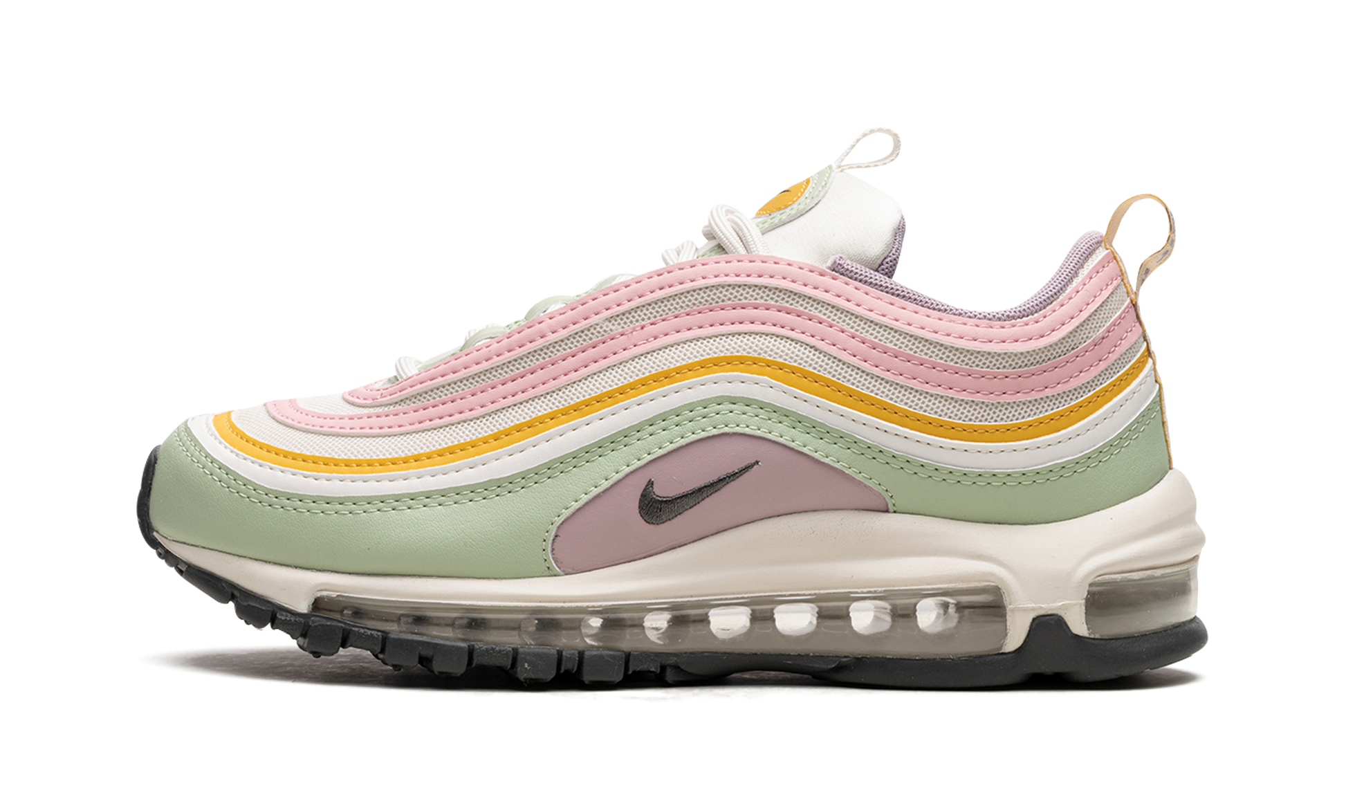 The Women's Nike Air Max 97 “Multi-Pastelâ€?is a women's-exclusive colorway of the retro running shoe with multiple pastel colors on its design. Ideal for warm weather wear. the Air Max 97 “Multi-Pastelâ€?features a white mesh base with pink. mustard. and mint green leather overlays. A black Swoosh appears within the lilac-colored overlay on the sides above the Sail foam midsole. Small Swoosh branding is also found on the tongue. Grey “Air Maxâ€?detailing appears on the pull tab on the heel. Full-length visible Max Air cushioning in the midsole completes the look.