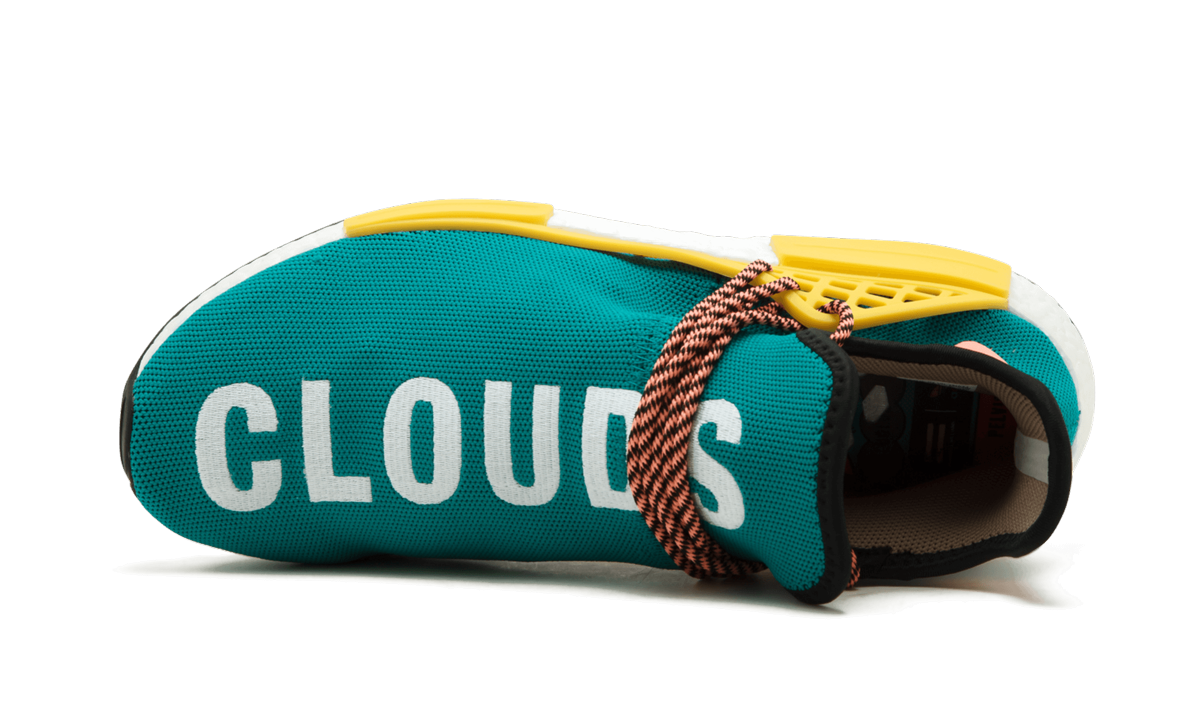 The Pharrell x adidas NMD Hu releases continued in fall 2017 with the debut of the new Trail edition of the coveted silhouette. featuring a rugged new tread on the outsoles for more grip. Dropping in four colorful options for the “Hiking Packâ€?inspired by the great outdoors. here we have the teal colorway with yellow cages and “MOONâ€?and “CLOUDSâ€?text running down the two shoes. The Pharrell x adidas NMD Human Race Trail was released in very limited quantities like the rest of his NMD's. so hike in and grab a pair before they vanish.