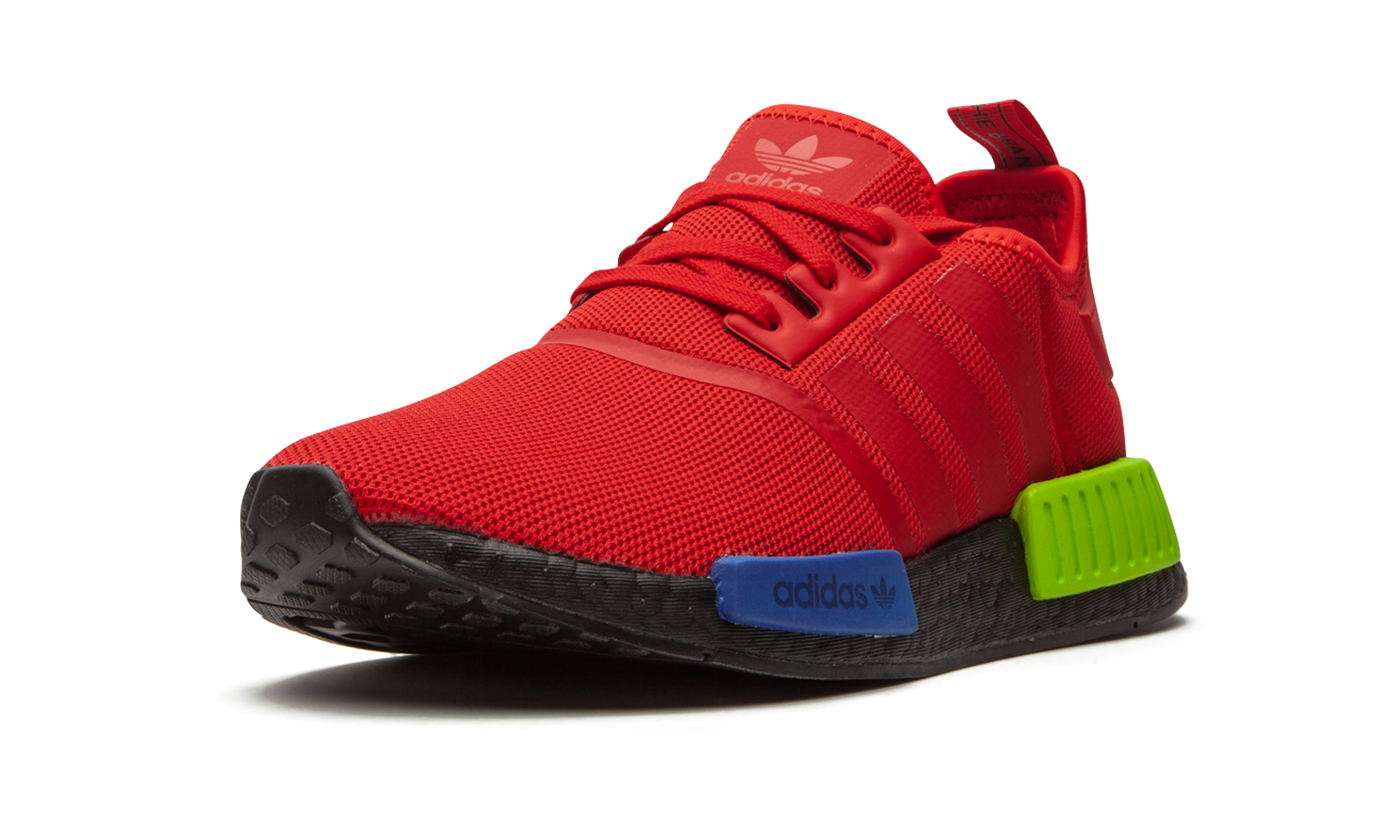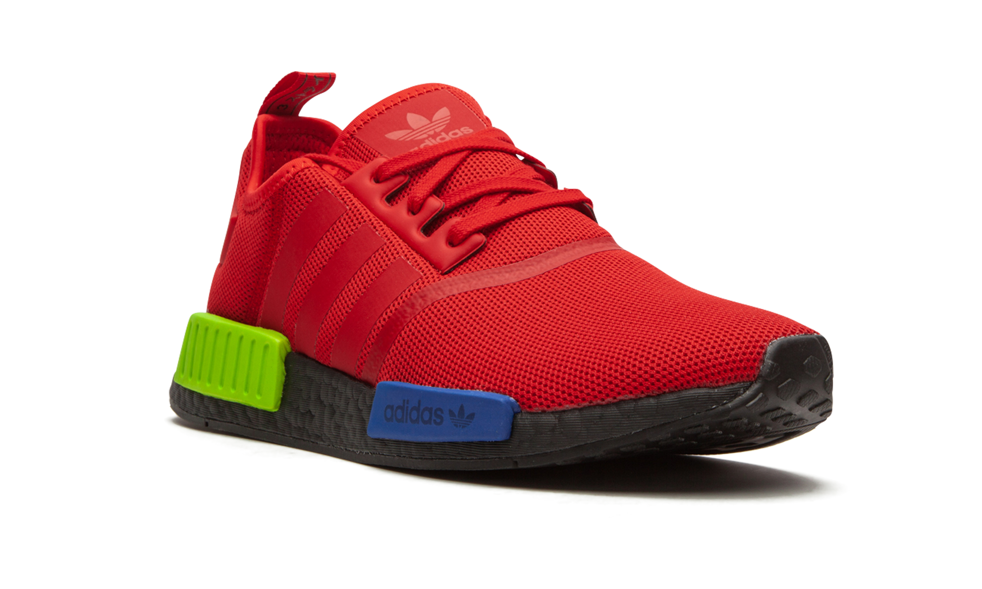 The adidas NMD_R1 has been making a splash since 2006 and this iteration of the modern silhouette is no different. Dubbed the "Red Multicolor." this colorway is outfitted with a completely tonal. red knit upper. A full-length Boost midsole contrasts the upper in black. and bright blue and green midsole blocks bring more color to the style. Access in and out of the shoe is easy with a pull-on. sock-like feature. while laces keep the foot in place.
