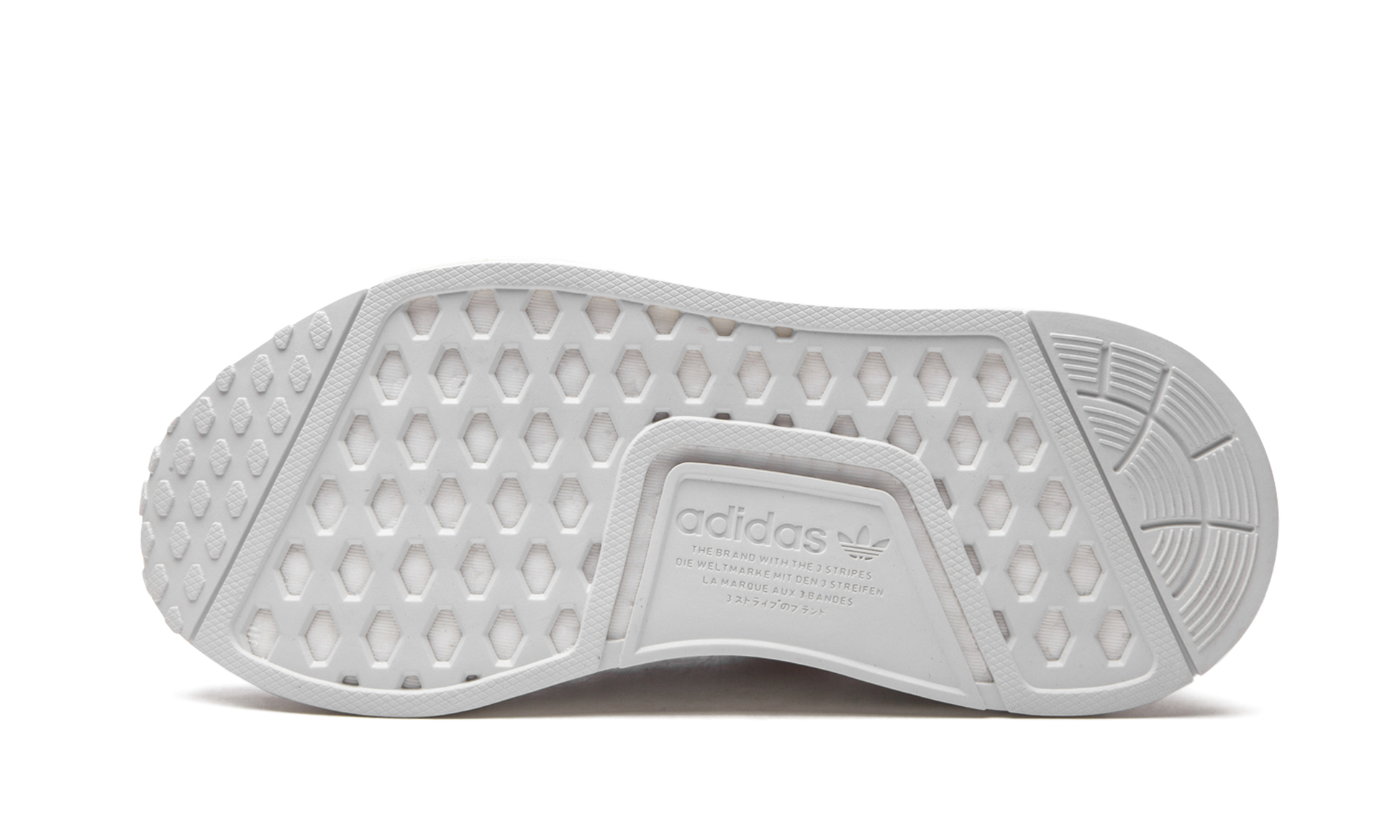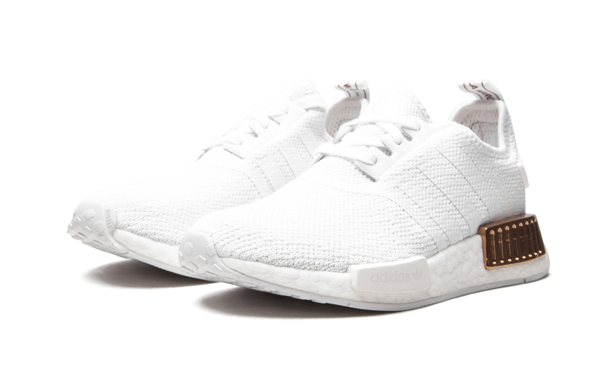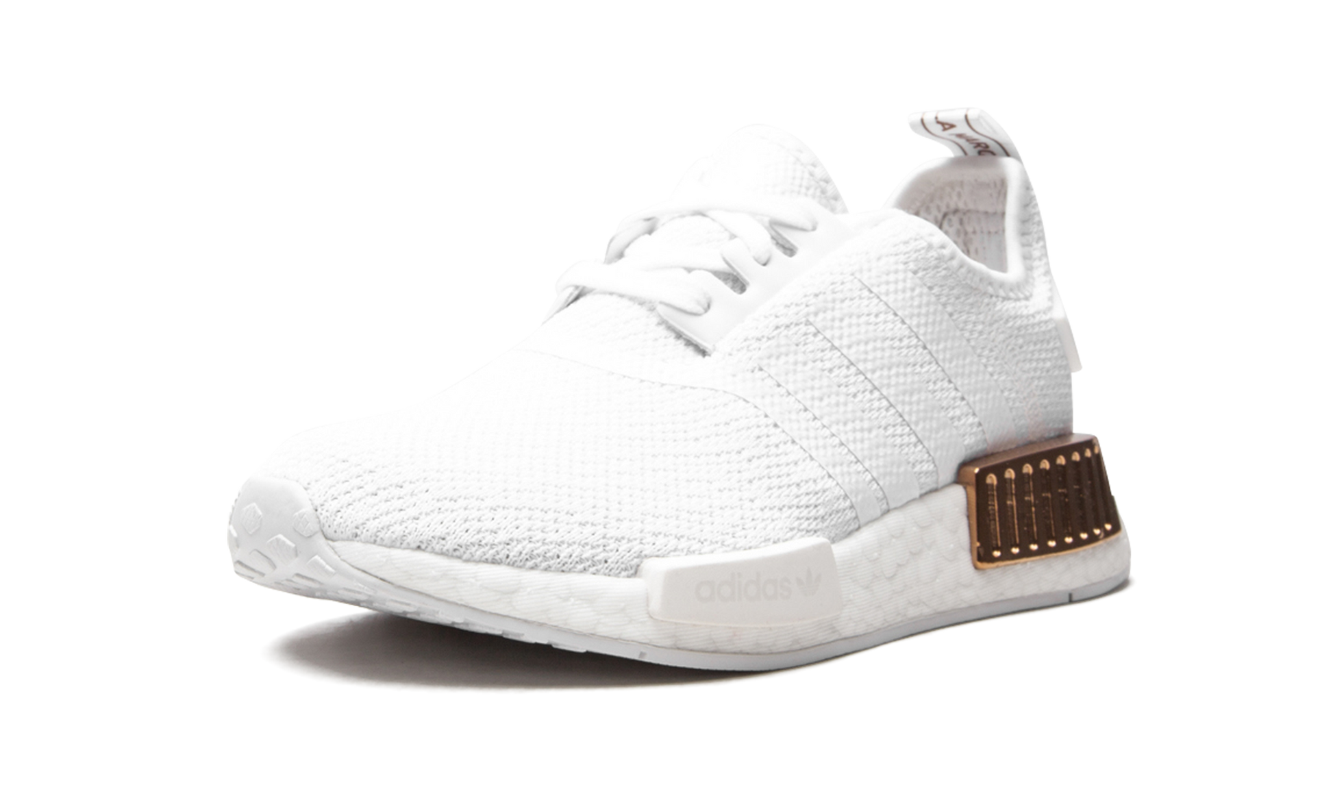 This adidas NMD_R1 is a women's exclusive style that plays up the "white sneaker" look in a sophisticated way. On the closely-weaved Primeknit upper. you see nothing but white with a completely monochrome look on the material. Three Stripes. laces. and heel detail. A white Boost midsole coordinates with the outsole and a front EVA plug of the same color. Then. without warning. copper metallic finish covers the back EVA plug and text on the wordmark heel stripe—giving the all-white look the oomph it needs to make it unique.