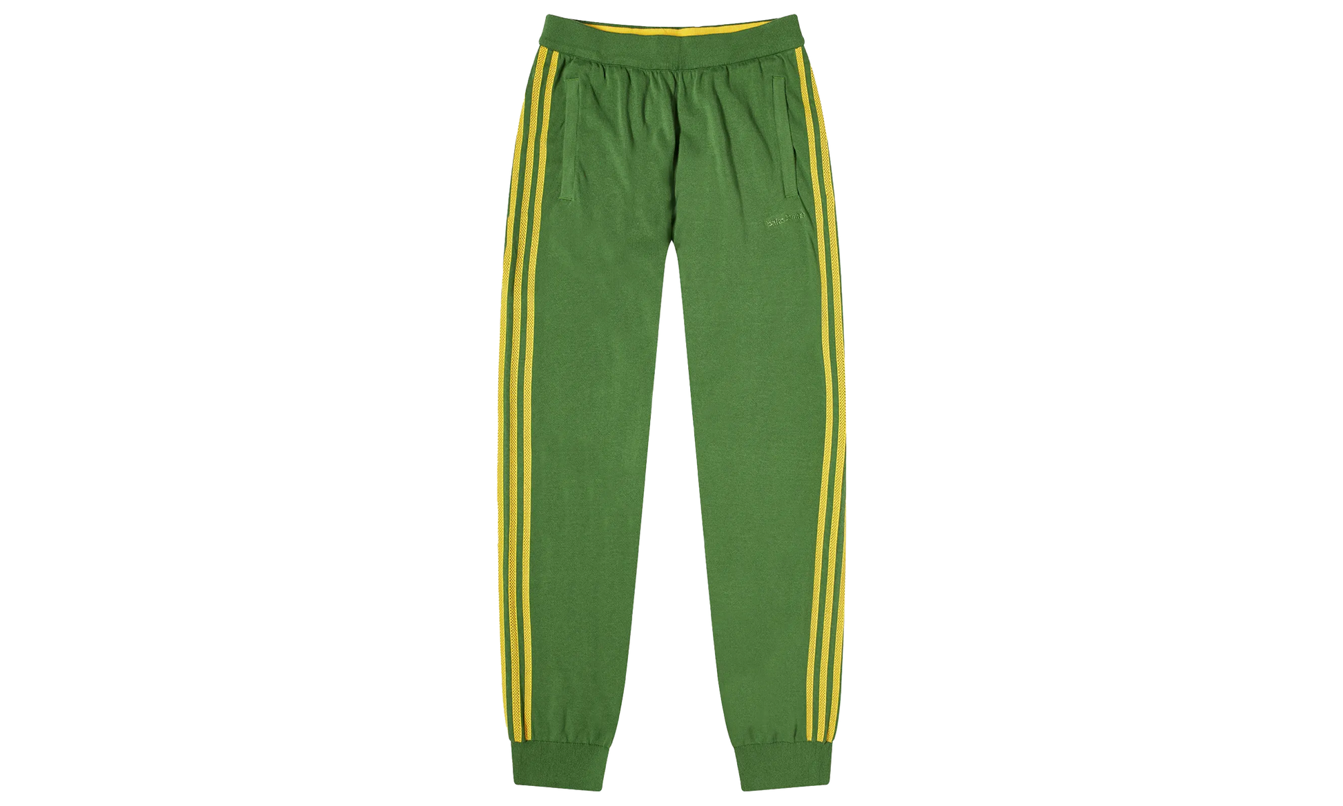 The Wales Bonner x Adidas Nylon Knit Track Pants in "Green" fuse high-fashion design with classic athletic wear. This collaborative piece elevates the track pant silhouette with a premium nylon knit construction. The striking green hue is contrasted by co-branded details. reflecting the unique aesthetic of Grace Wales Bonner that blends European tailoring with a celebration of Afro-Atlantic culture.