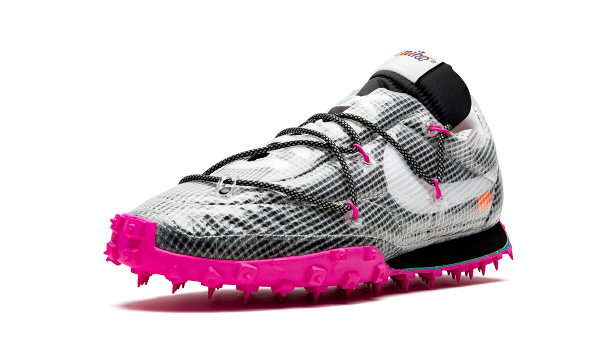The Off-White x Nike Waffle Racer SP “Black/Fuchsiaâ€?is the women's sizing of the Virgil Abloh's take on the legendary Waffle Racer design. The “Black/Fuchsiaâ€?colorway is one of three included in a fall 2019 collection between Abloh's Off-White fashion label and Nike. Like many of the archival Nike silhouettes that Abloh has reinterpreted. the Waffle Racer now features a drastic new appearance. A standard black nylon covers the upper with a film-like synthetic mesh layered on top of the nylon material. Contrast appears in the form of a white Swoosh branding hit on the mid-panel with speckled black and white rope laces and pink accented eyelets breaking up the shadowy vibe. A black nylon tongue with white-based Nike branding. along with a dark green hang tab complete the look of the upper. Pink rubber spikes placed on the outsole keep in line with the Waffle Racer's performance heritage. Release date: October 24th. 2019.