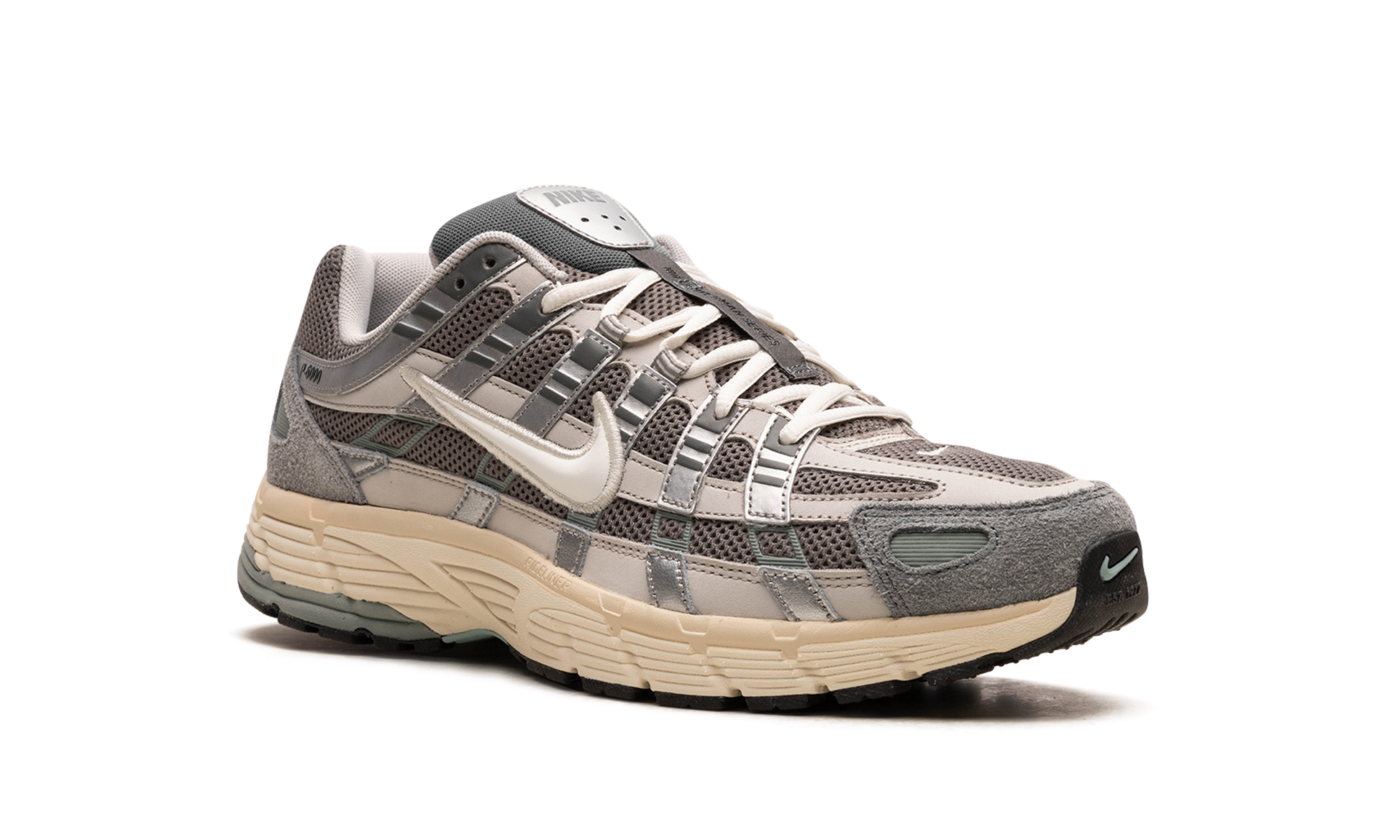 The Nike P-6000 "Flat Pewter" is a greyscale colorway of the shoe with a design inspired by the Nike Pegasus 25 and 2006. Inspired by the 2000s era of running shoes. the P-6000 has a retro-meets-modern appearance that's ideal for casual wear. The shoe's design features a light grey mesh base with tonal leather overlays. A white Swoosh logo is located on each side of the shoe. The cream foam midsole adds contrast to the predominantly grey upper. Release date: November 18. 2023