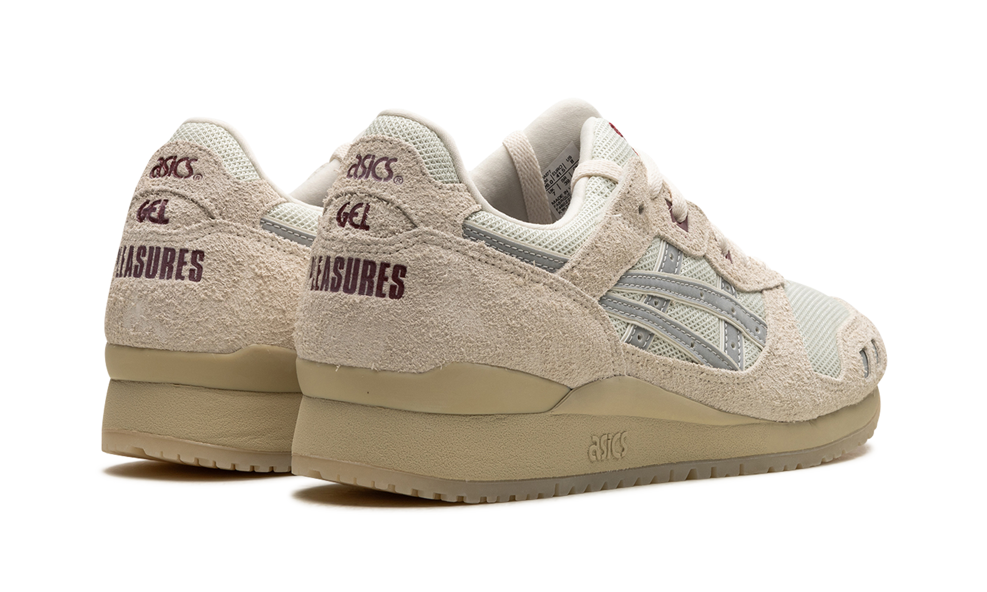 The Pleasures x ASICS Gel-Lyte 3 “Creamâ€?is the Los Angeles based streetwear brand's spin on the retro running shoe. An eye-catching look for the Gel-Lyte 3. the Pleasures co-designed “Creamâ€?colorway has a cream-colored mesh base with tonal hairy suede overlays and grey leather tiger stripes on the side. Contrasting burgundy detailing is seen on the eyelets and on the Pleasures logo on the heel. A Los Angeles skyline graphic can be found on the inside of the shoe on the sockliner. Mismatched ASICS and Pleasures branding is seen on the left and right shoe's tongue. respectively. Release date: September 17. 2023