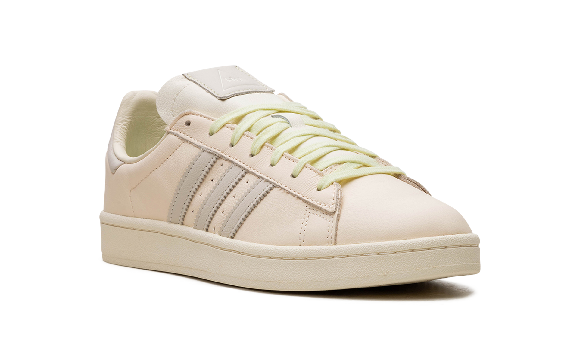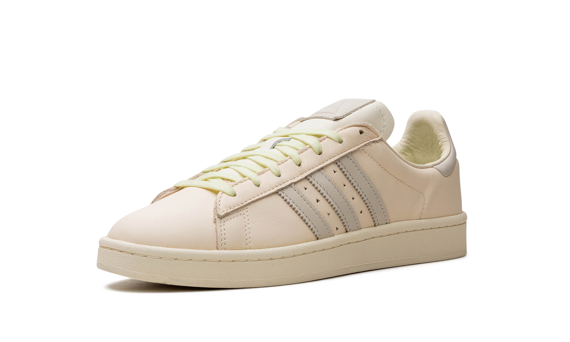 The Pharrell Williams x adidas Campus is an exclusive colorway included in the artist's “March Madnessâ€?collection of apparel and footwear options. Part of a sweeping range of classic adidas silhouettes reworked to fit within the context of the aforementioned capsule. this Campus displays an “Ecru Tintâ€?or pale pink leather upper. Subtly contrasting tan leather Three Stripes branding appears adjacent to a perforated diamond motif on the mid-panel. Additional styling includes dusty neon cotton laces. white “Huâ€?branding emblems on each tongue. and classic cream-colored adidas detailing on the heel. The Pharrell Williams x adidas Campus was released in March 2020.