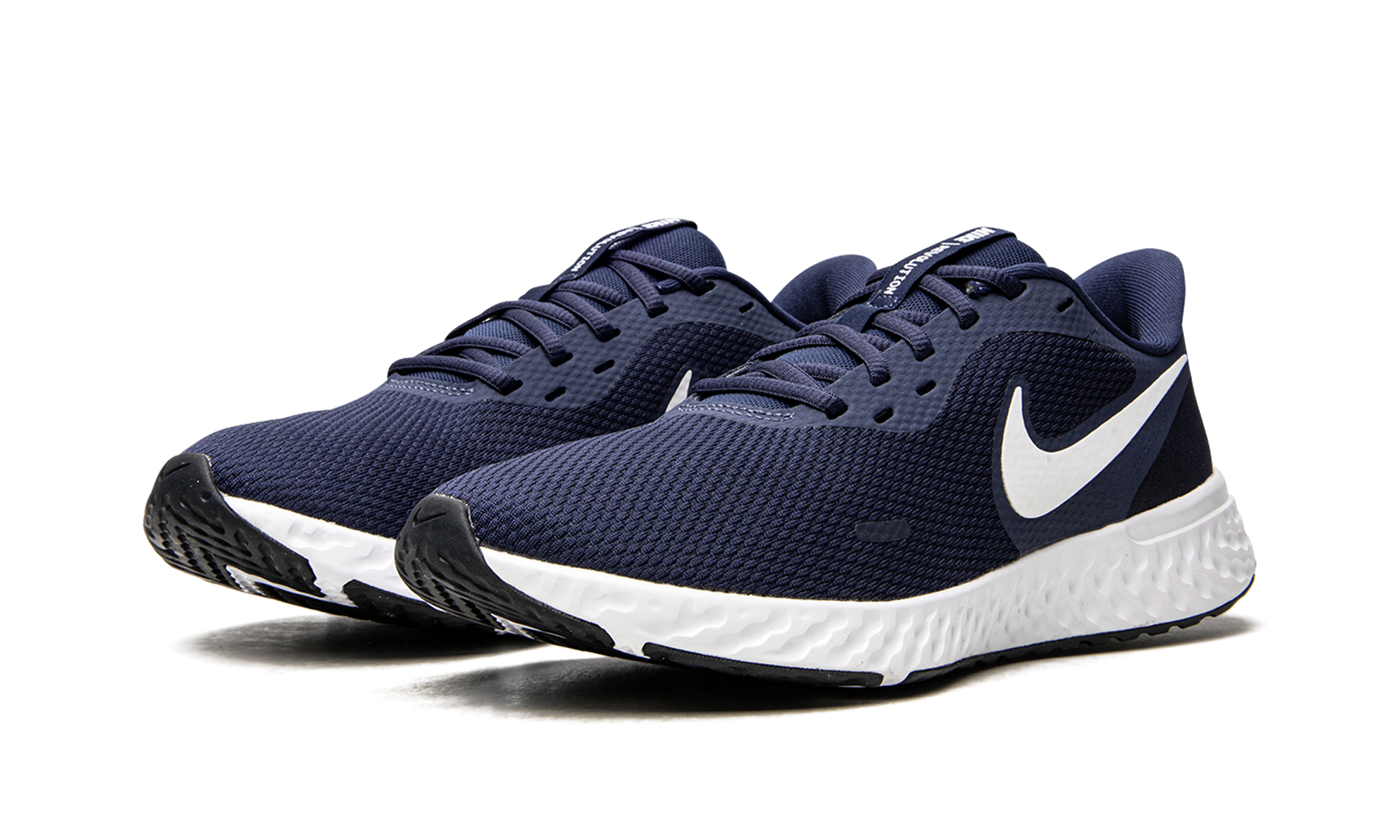 The Nike Revolution 5 is a performance running shoe that serves everyday runners with improved cushioning and stability. A step up from the Nike Revolution 4. this updated model features a lightweight knit material on the upper with a reinforced heel and outer details for added support. A soft. foam midsole delivers a smooth. even ride. while the rubber outsole offers durable traction on a variety of surfaces. It's built to last miles and miles and looks slick in a navy blue. white. and black color combination.