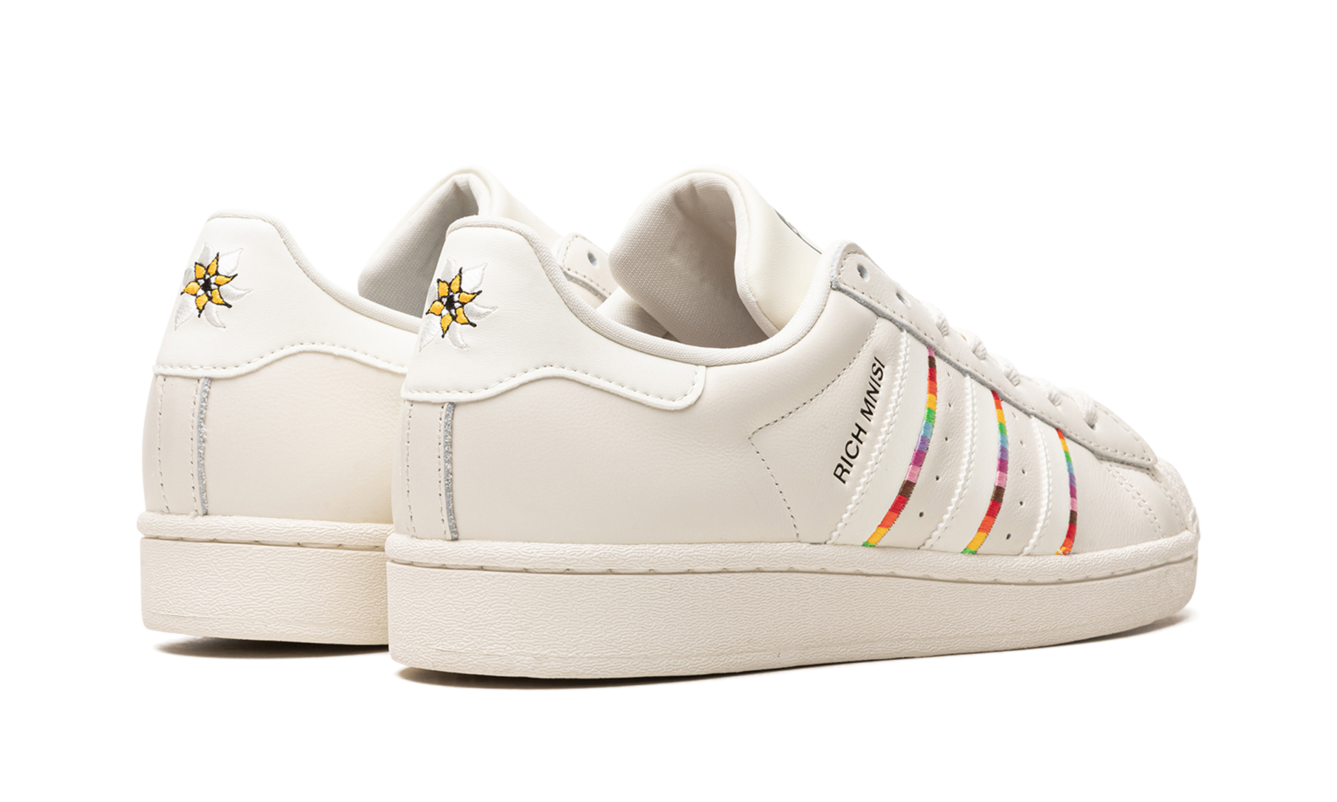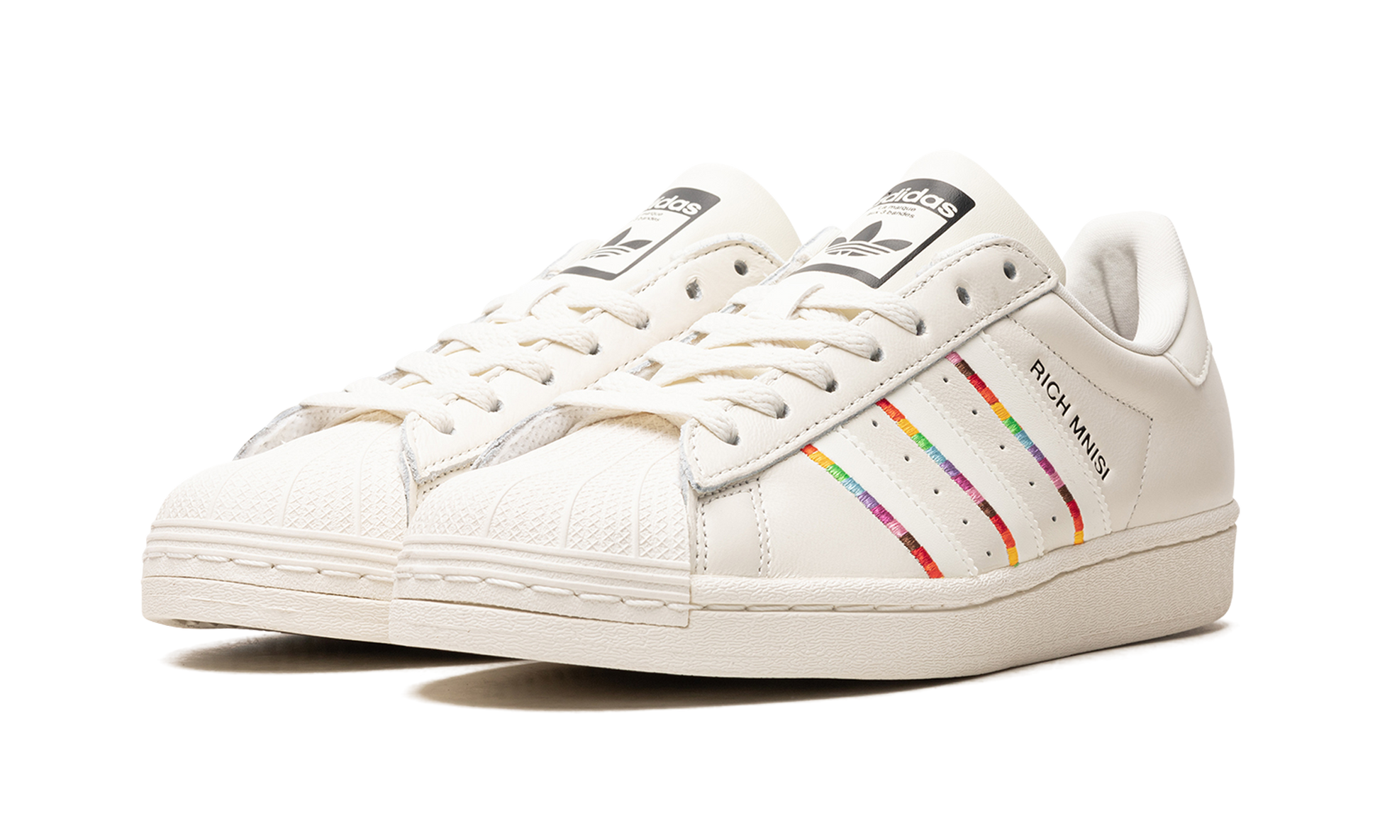 The RICH MNISI X Superstar 'Pride' shoe features a vibrant design that celebrates LGBTQ+ pride. blending classic Adidas Superstar style with Rich Mnisi's distinctive artistic flair.