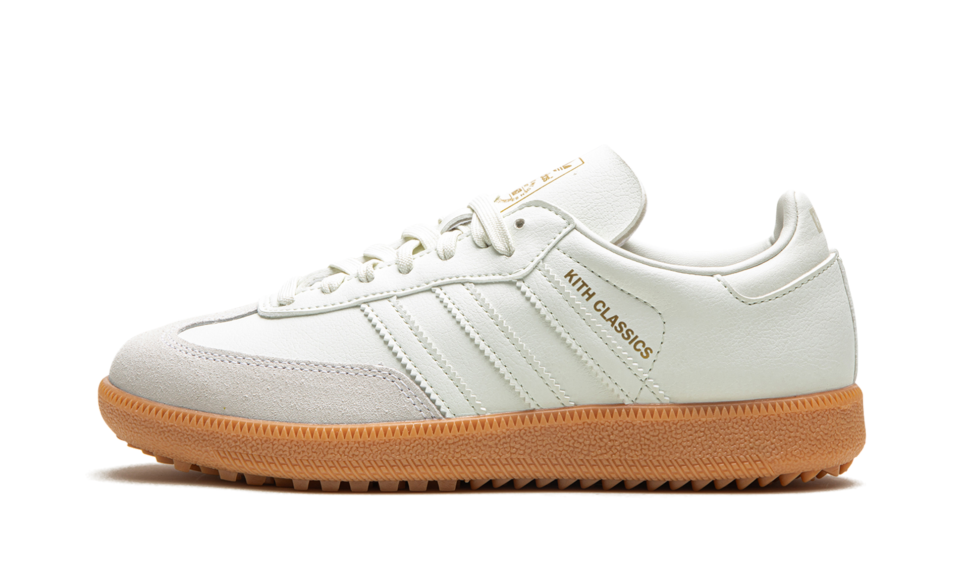 The Kith x adidas Samba Golf “White/Gumâ€?is a collaboration by the New York based retailer on a version of the retro indoor soccer shoe made for golf. Built for the golf course. the adidas Samba Golf features a spike-less rubber outsole for even more versatility off the fairway. The shoe has a white leather upper with tonal leather Three Stripes branding and a gold “Kith Classicsâ€?logo on the side. A grey suede overlay appears on the toe. “Kithâ€?and adidas Trefoil logos are found on the heel of the left and right shoe. respectively. A treaded rubber outsole ensures traction on or off a golf course. Release date: August 7. 2023
