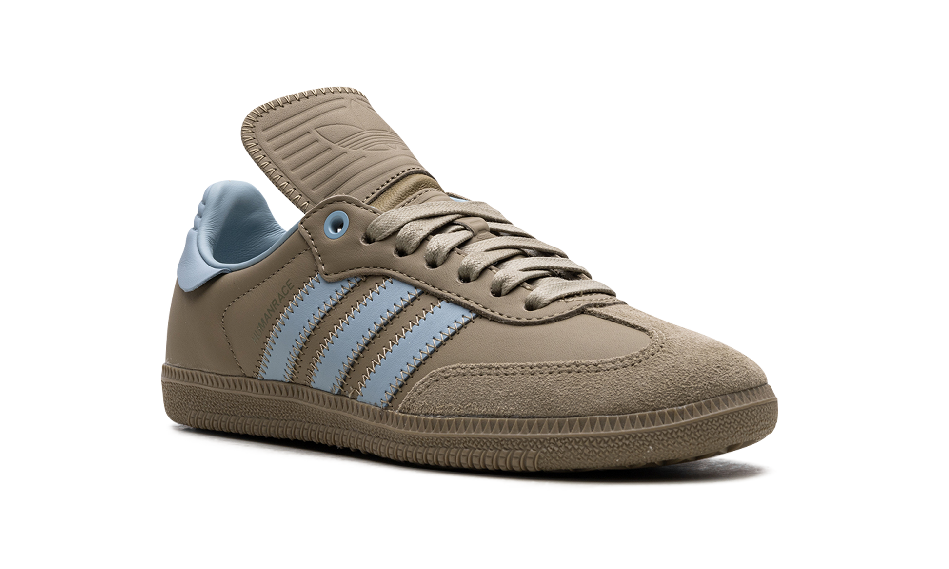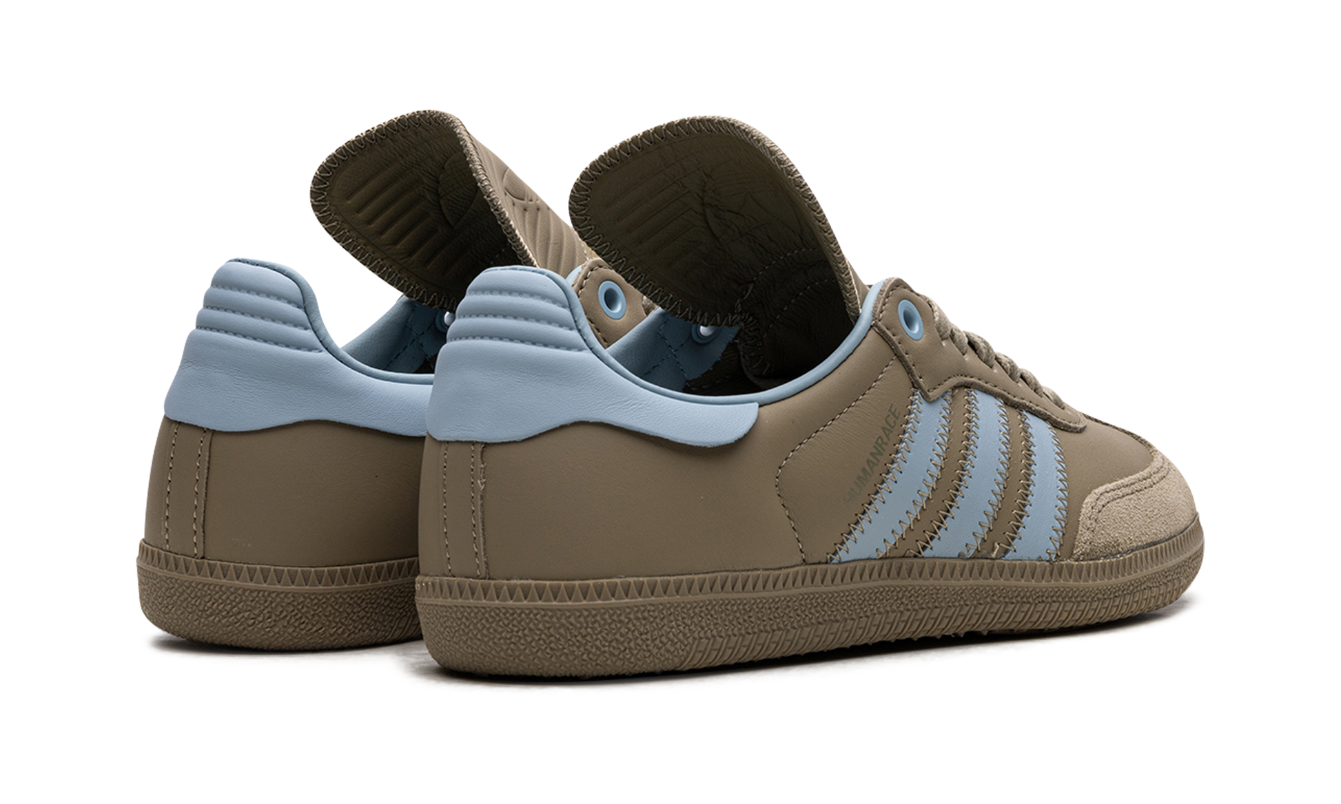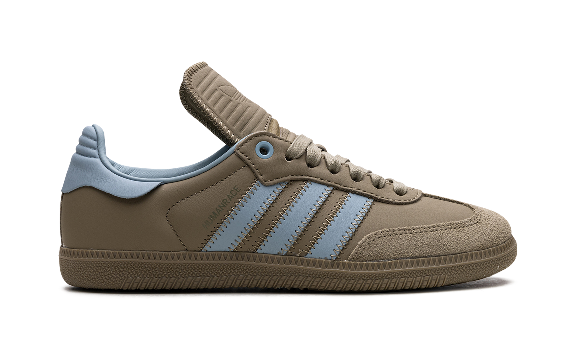 The Pharrell x adidas Samba Humanrace "Orbit Green" is a collaboration by Pharrell's lifestyle brand and adidas on an earth tone colorway of the retro soccer shoe. From a Fall 2023 collection between Humanrace's collaboration with adidas. the “Orbit Greenâ€?version of the Samba Humanrace features an muted olive green leather upper that has a tonal suede overlay on the toe. Contrasting light blue “Three Stripesâ€?branding is seen on either side of the shoe. More blue accenting can be seen on the leather heel tab on the back. Underfoot. an Orbit Green-colored rubber sole completes the look. Release date: November 3. 2023