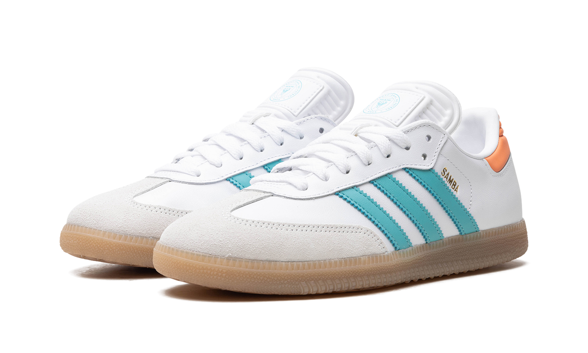 The adidas Samba “Inter Miami - Easy Mint/Pinkâ€?is a colorway of the popular sneaker inspired by the Major League Soccer team Inter Miami CF. Also said to be inspired by Inter Miami's star player Lionel Messi. the “Inter Miami - Easy Mint/Pinkâ€?features the colors of the Miami-based team on its design. The upper has a white leather construction with Easy Mint leather Three Stripes branding. A gold “Sambaâ€?logo appears on the lateral side of the mid-panel. while detailing inspired by Inter Miami is located on the tongue. A semi-translucent. smoky Gum rubber sole completes the look.