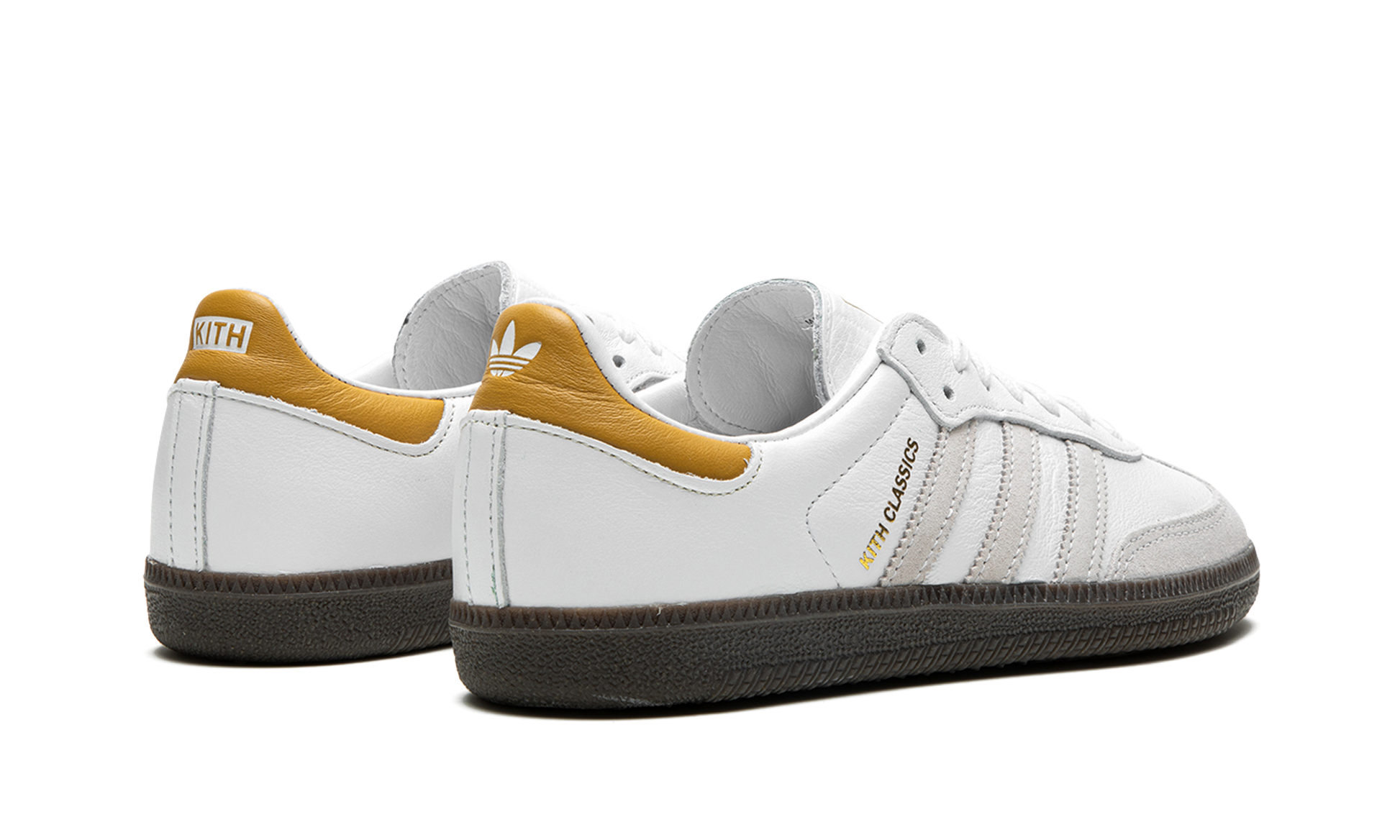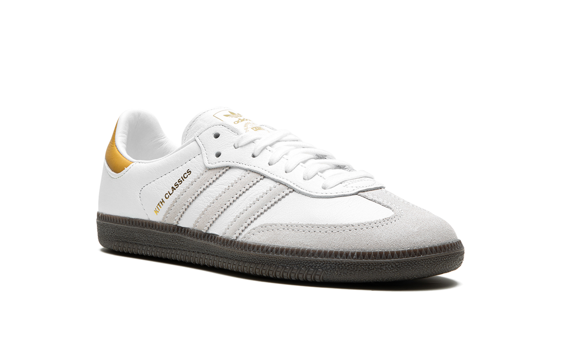 The Kith x adidas Samba “White/Grey/Goldâ€?is a collaboration between Ronnie Fieg's sneaker boutique and adidas on a premium colorway of the classic indoor soccer shoe. Keeping the shoe's timeless appearance mostly intact. Kith's adidas Samba features a white leather construction with contrasting grey suede Three Stripes branding on the sides and grey suede on the toe. Gold “Kith Classicsâ€?detailing is found along the side of the branding. Dual “Kithâ€?and adidas branding is found on the tongue. Gold accenting appears on the leather heel tab with adidas's signature logo. Underfoot. a black rubber sole completes the look.