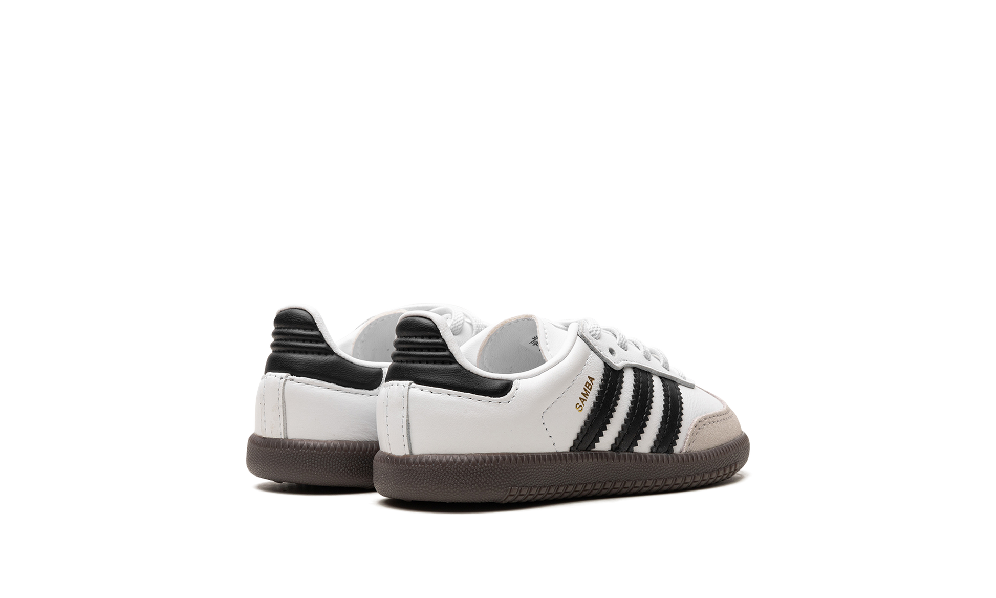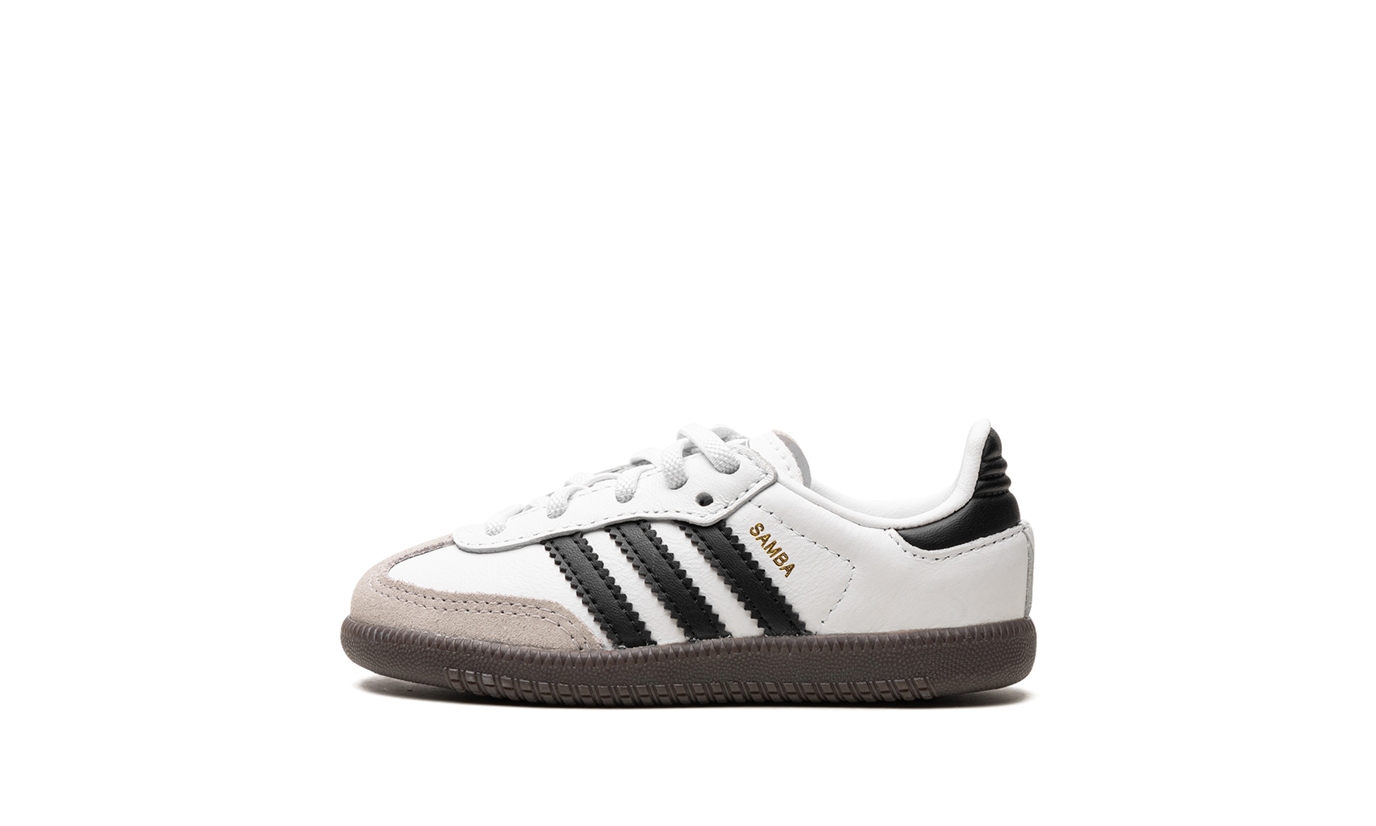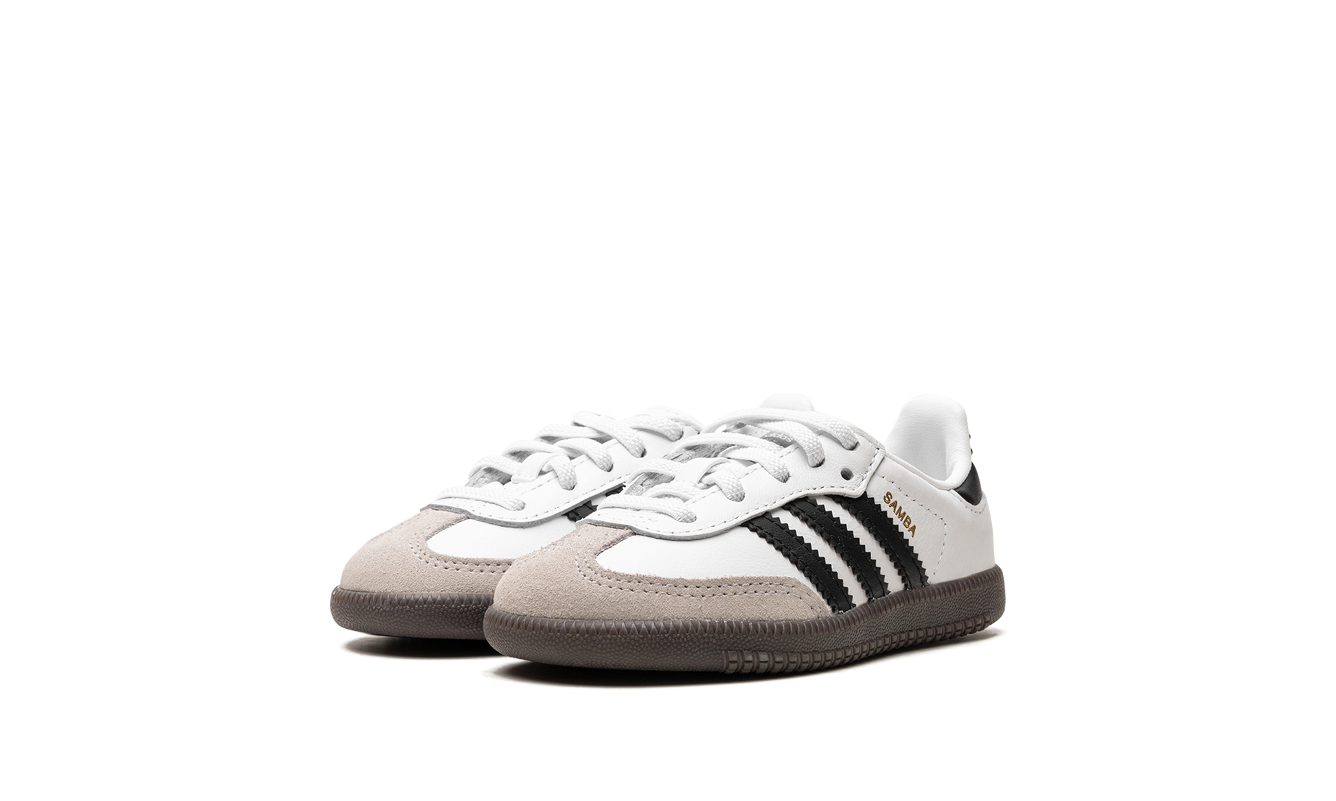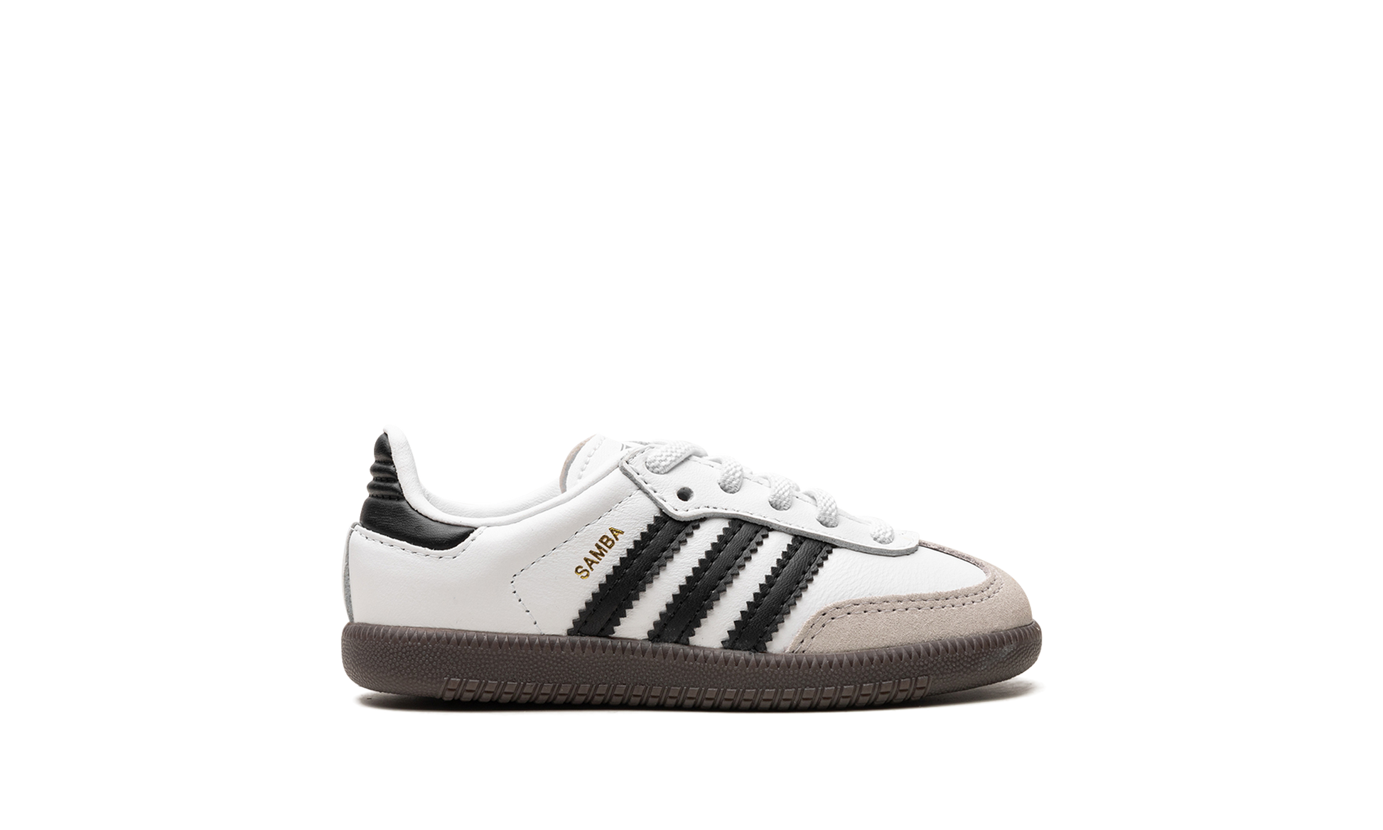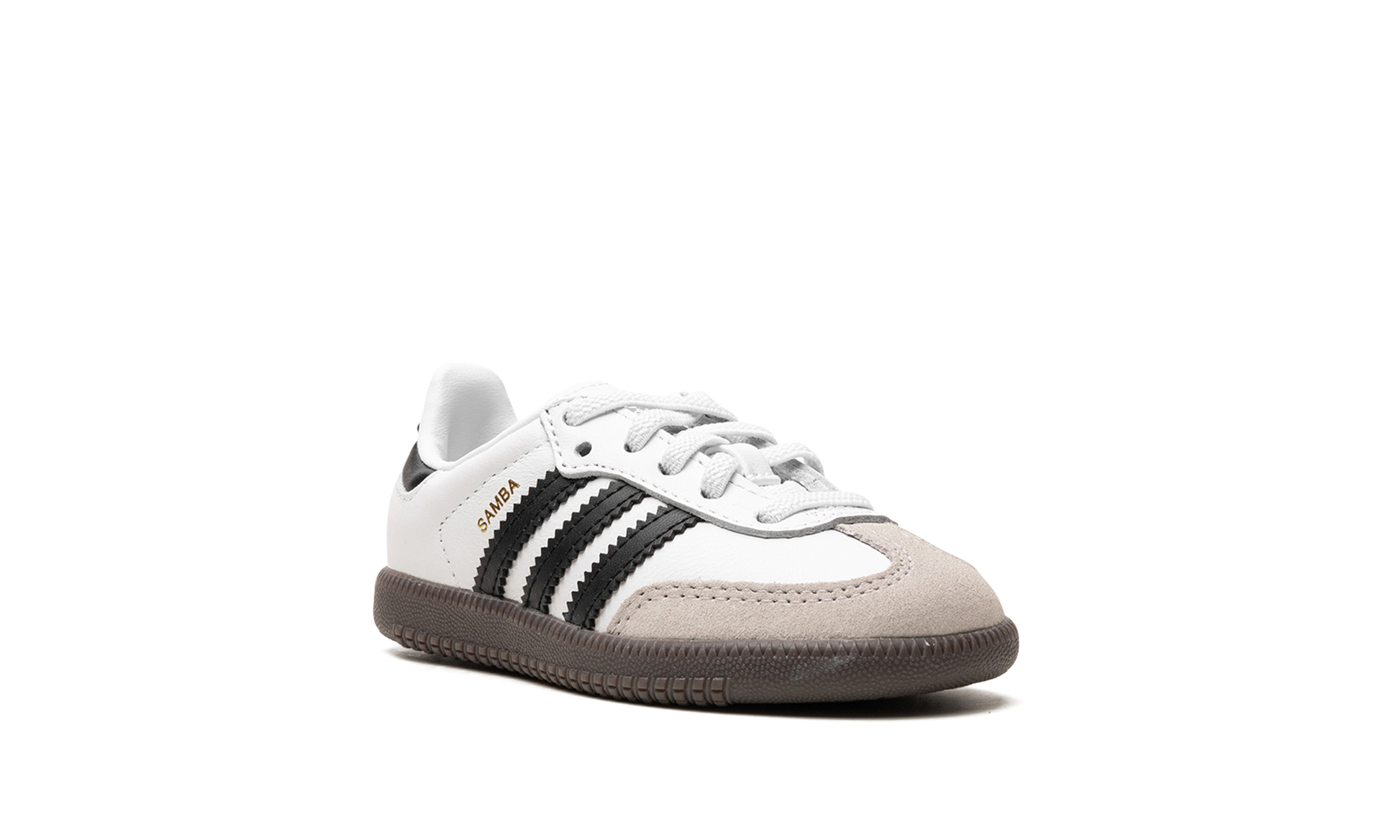 The adidas Samba OG TD “White/Black/Gumâ€?is the toddler sizing of the classic colorway of the retro indoor soccer shoe. The adidas Samba has enjoyed a resurgence in popularity in recent years. as the shoe's classic design has come to be appreciated by more and more people looking for a casual shoe that can be worn with anything. As for the design of the Samba's “White/Black/Gumâ€?colorway for toddlers. it features a white leather construction with tan suede overlays on the toe and forefoot. Black Three Stripes branding is found on the sides. “Sambaâ€?detailing appears in gold foil lettering on the lateral side of the shoe and an “adidas Sambaâ€?patch can be found on the tongue. A gum rubber sole completes the look.