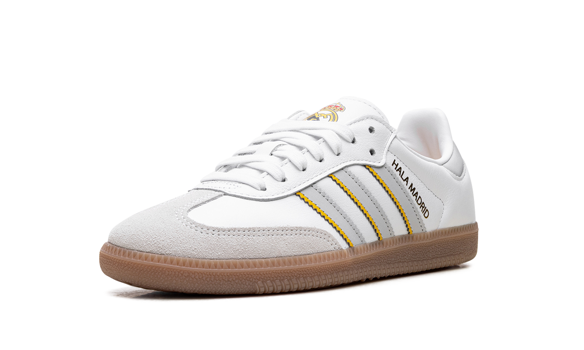 The adidas Samba "Real Madrid" pays tribute to the iconic Spanish football club. This version of the classic Samba silhouette is designed in the team's colors and features the Real Madrid crest. The sneaker maintains the traditional Samba look with a low-profile design. a premium leather upper. and the signature T-toe overlay. making it a stylish tribute to Los Blancos.