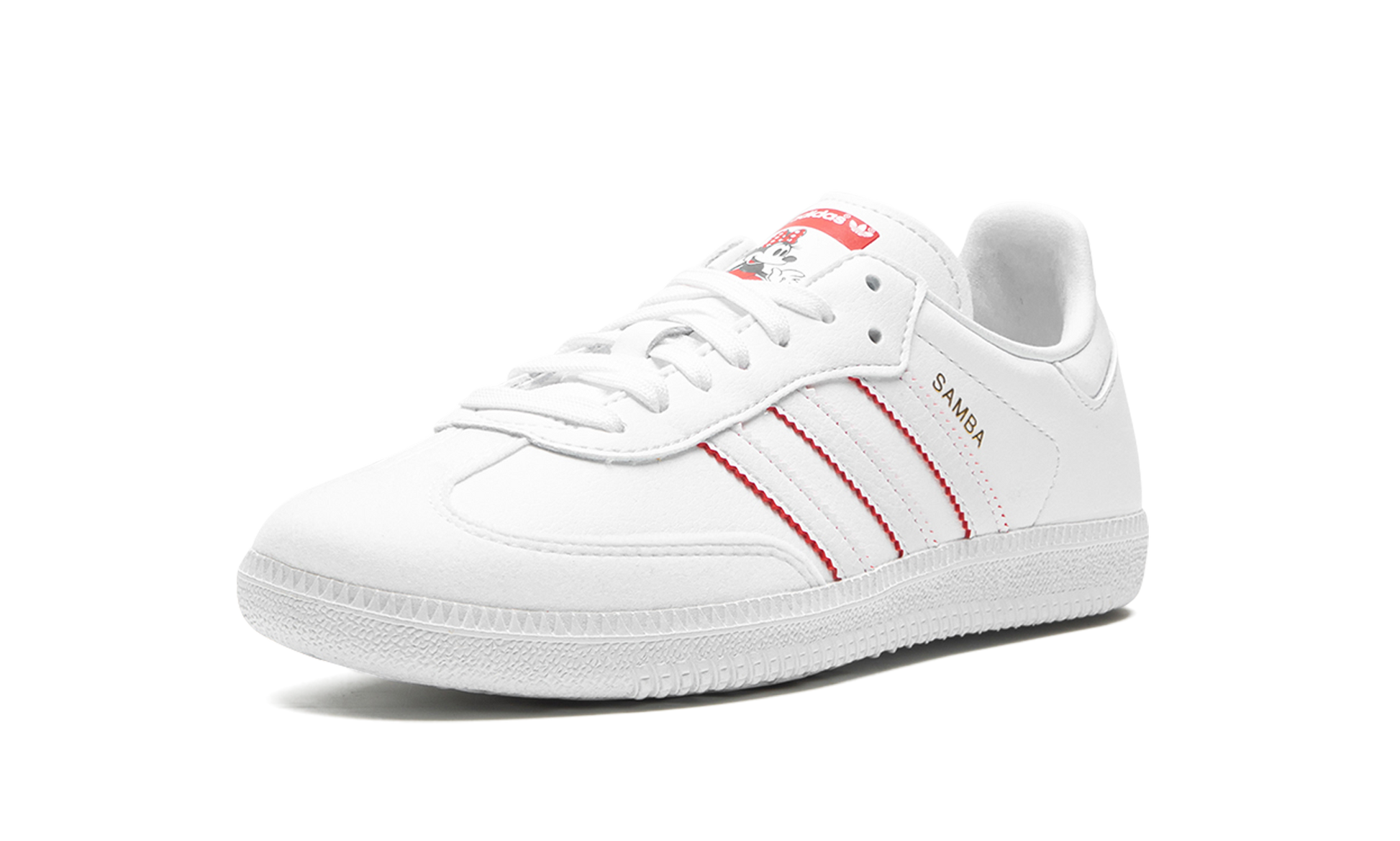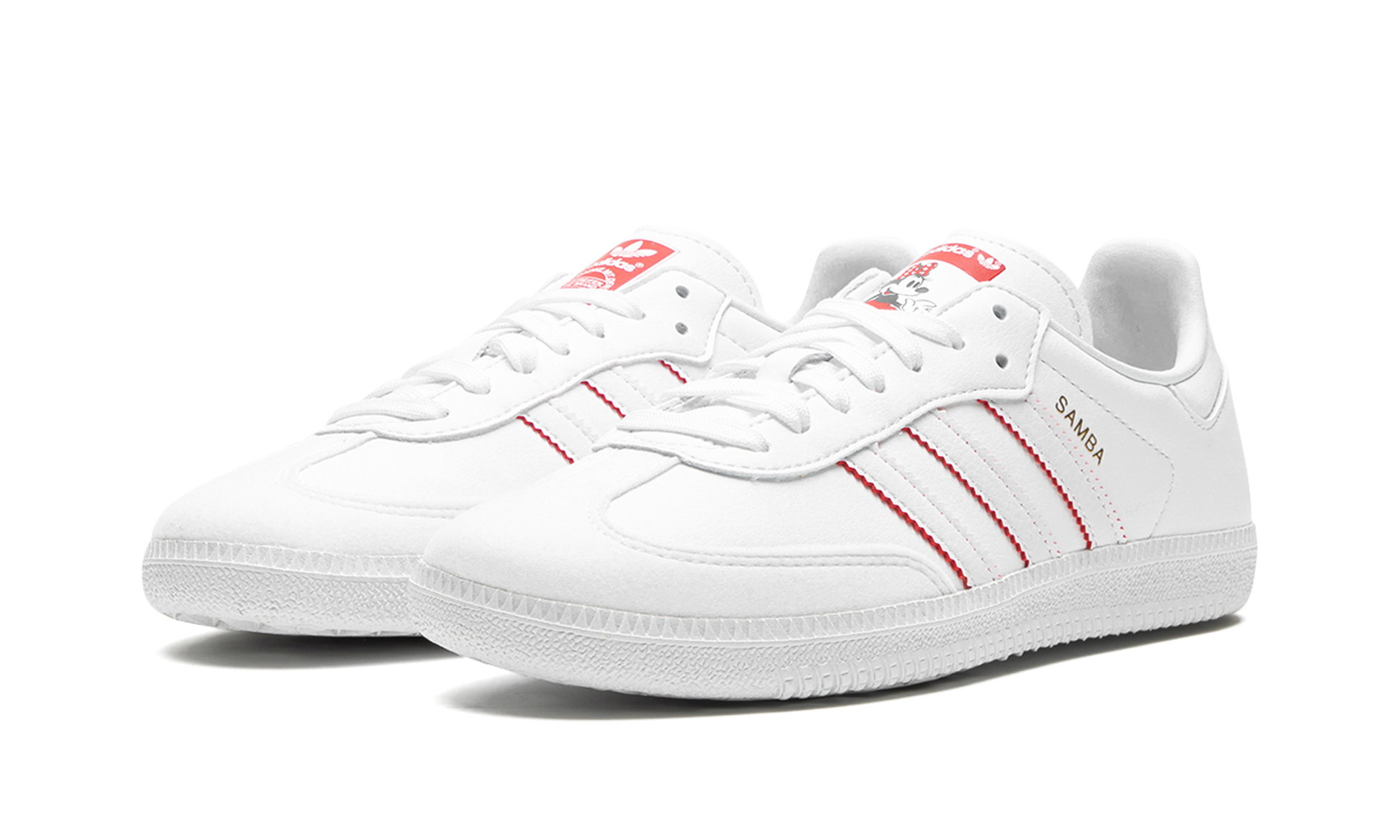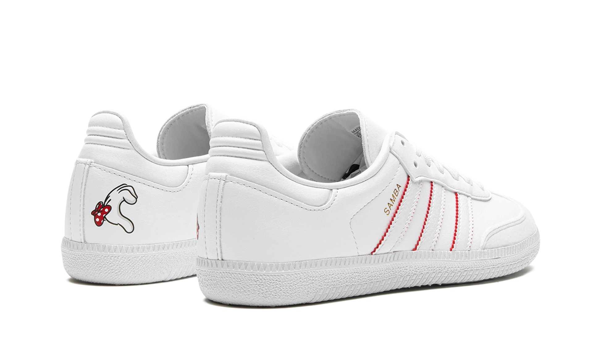 The adidas Samba Vegan "Minnie Mouseâ€?is a creative colorway of the eco-friendly version of the popular lifestyle shoe that is inspired by the iconic Disney character. The adidas Samba Vegan “Minnie Mouseâ€?joins the Samba's “Mickey Mouseâ€?colorway in celebrating Disney's 100th anniversary in 2023. The shoe features a white vegan leather design with “Sambaâ€?branding next to the classic Three Stripes detailing with red accents on the sides. Additional red accenting can be found on the tongue. which is inspired by Minnie's red outfit. Minnie's hands are found on the heel of the left and right shoe and form a heart design. Release date: April 27. 2023