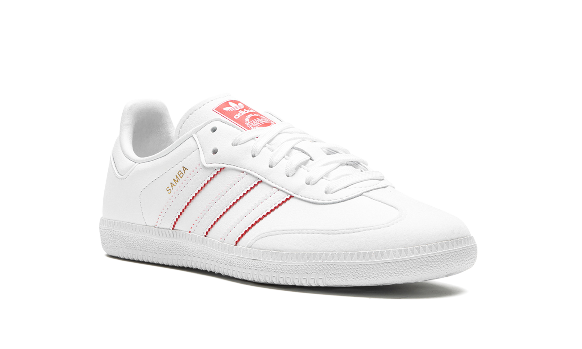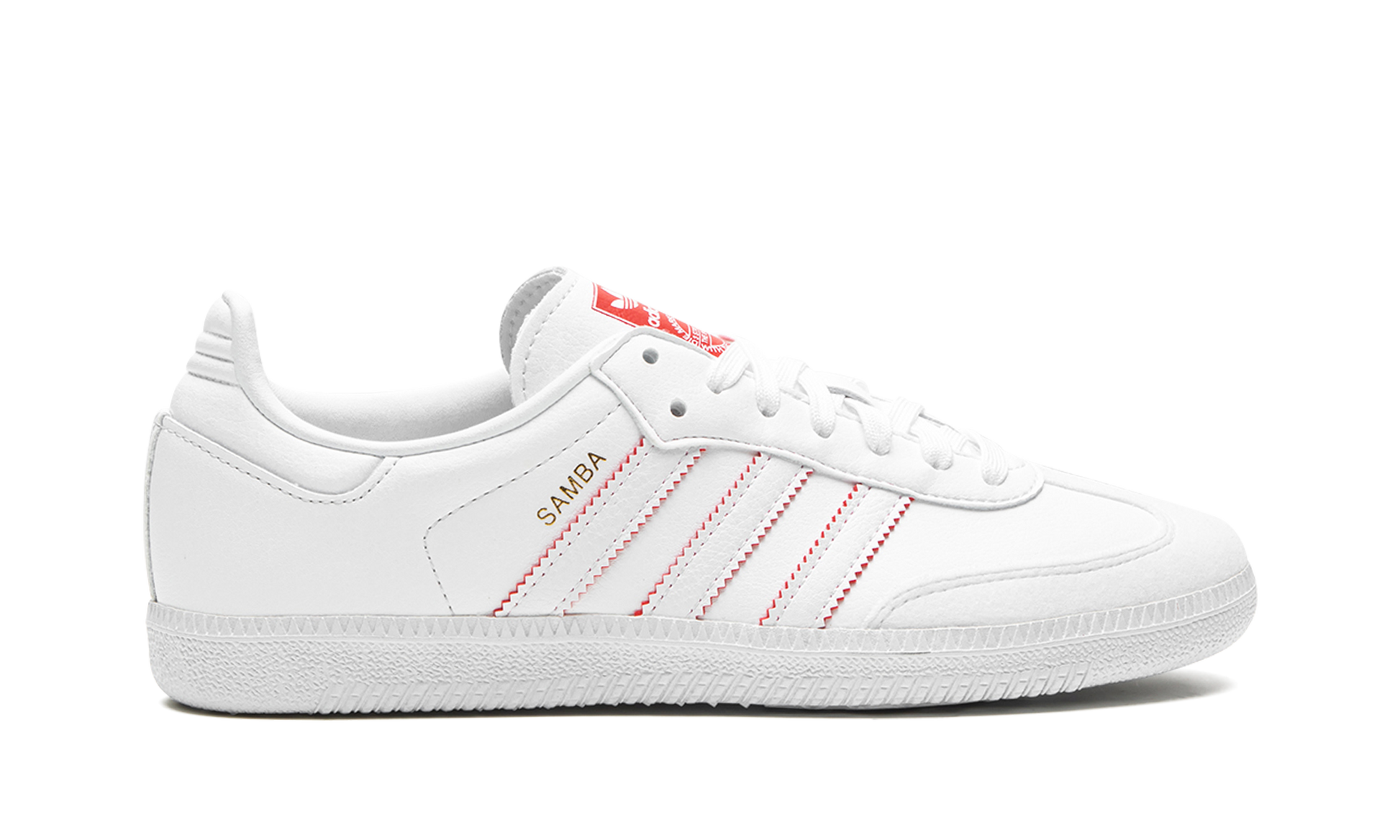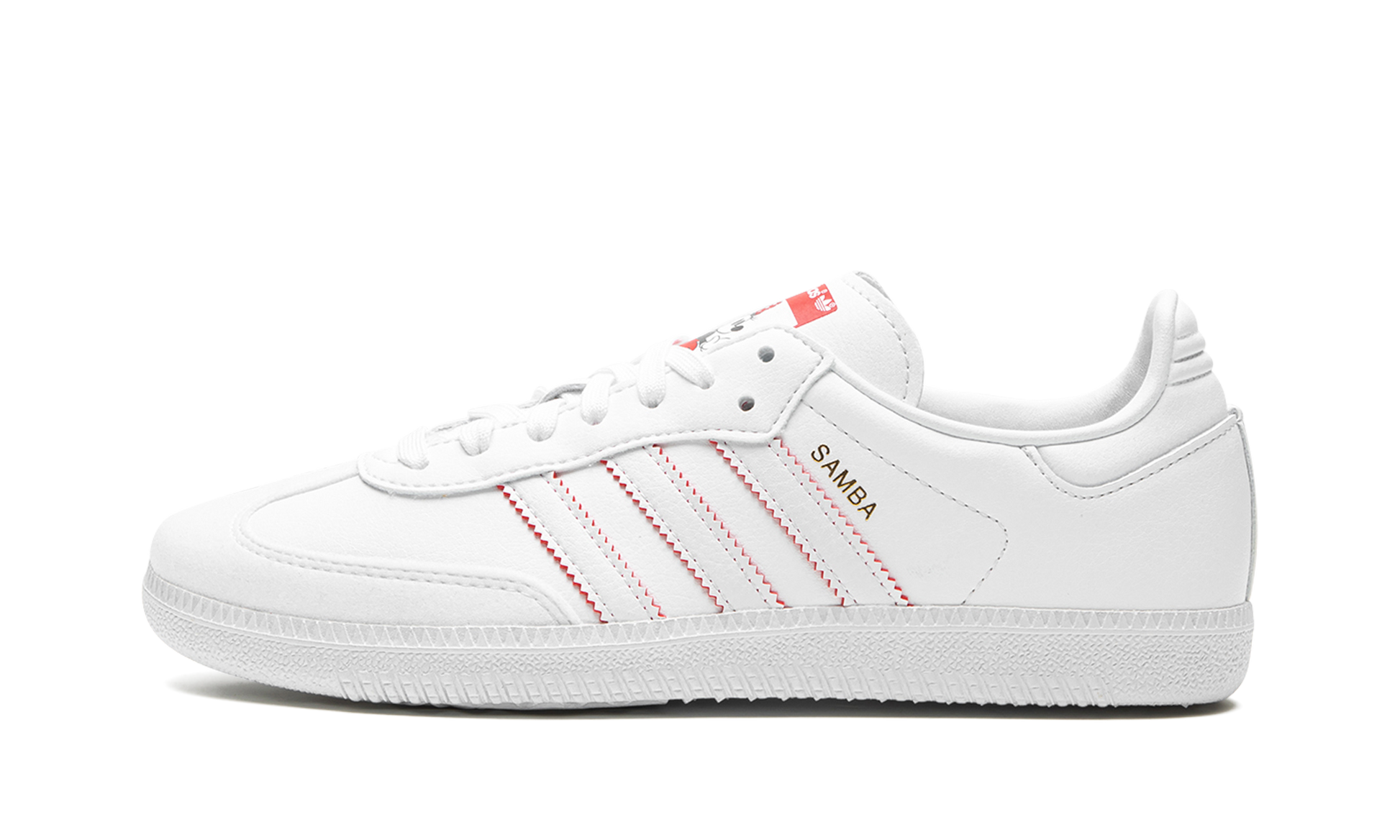 The adidas Samba Vegan "Minnie Mouseâ€?is a creative colorway of the eco-friendly version of the popular lifestyle shoe that is inspired by the iconic Disney character. The adidas Samba Vegan “Minnie Mouseâ€?joins the Samba's “Mickey Mouseâ€?colorway in celebrating Disney's 100th anniversary in 2023. The shoe features a white vegan leather design with “Sambaâ€?branding next to the classic Three Stripes detailing with red accents on the sides. Additional red accenting can be found on the tongue. which is inspired by Minnie's red outfit. Minnie's hands are found on the heel of the left and right shoe and form a heart design. Release date: April 27. 2023