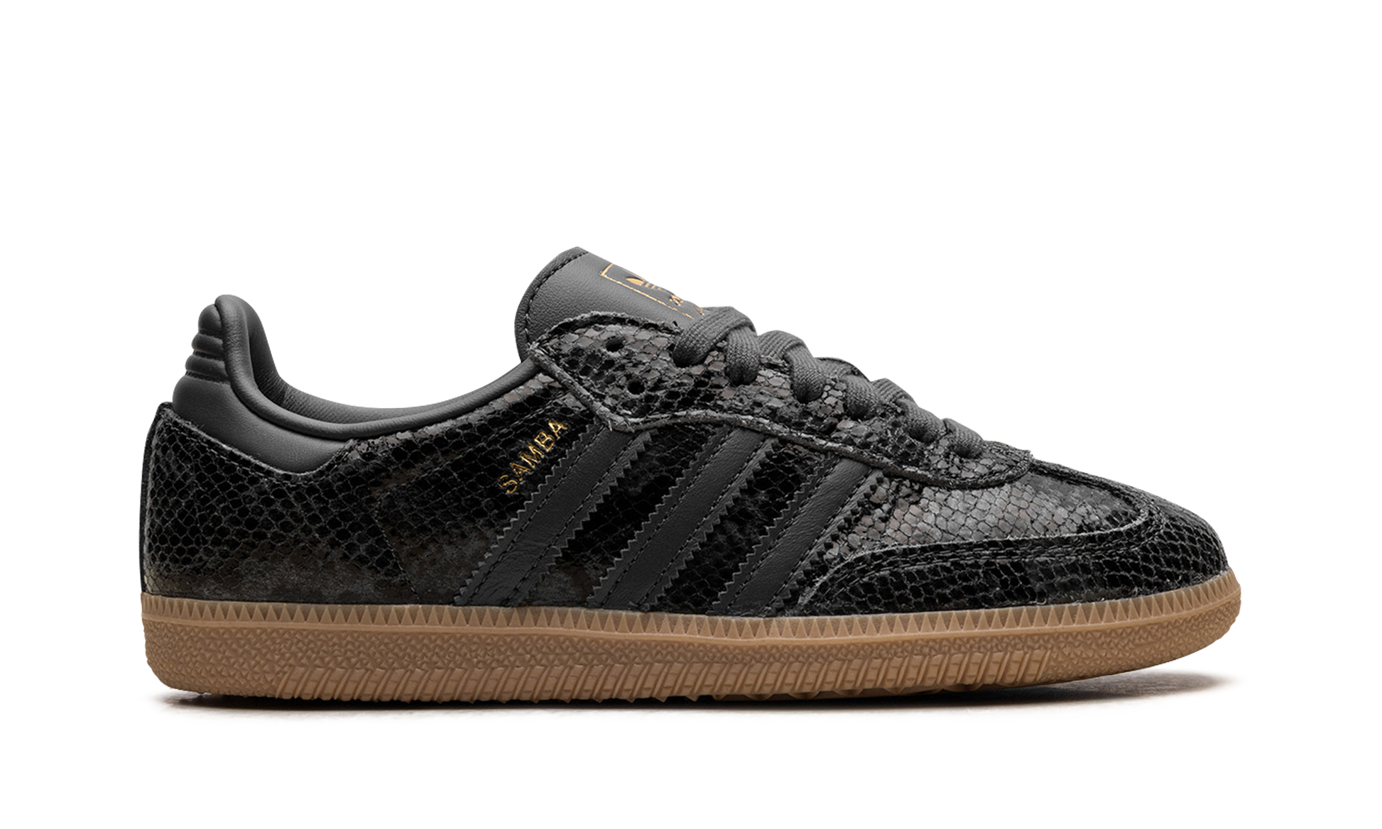 Dare to be bold with the Adidas Samba Wmns "Black Snakeskin" sneaker. This iconic silhouette gets a fierce. fashion-forward update with an eye-catching. snakeskin-like print covering the smooth black leather upper. The classic reinforced T-toe and serrated 3-Stripes maintain the legendary Samba DNA. while the gum rubber outsole adds a vintage. athletic finish. Confident. comfortable. and versatile. this women's shoe is the perfect way to add a sophisticated. wild edge to any outfit.