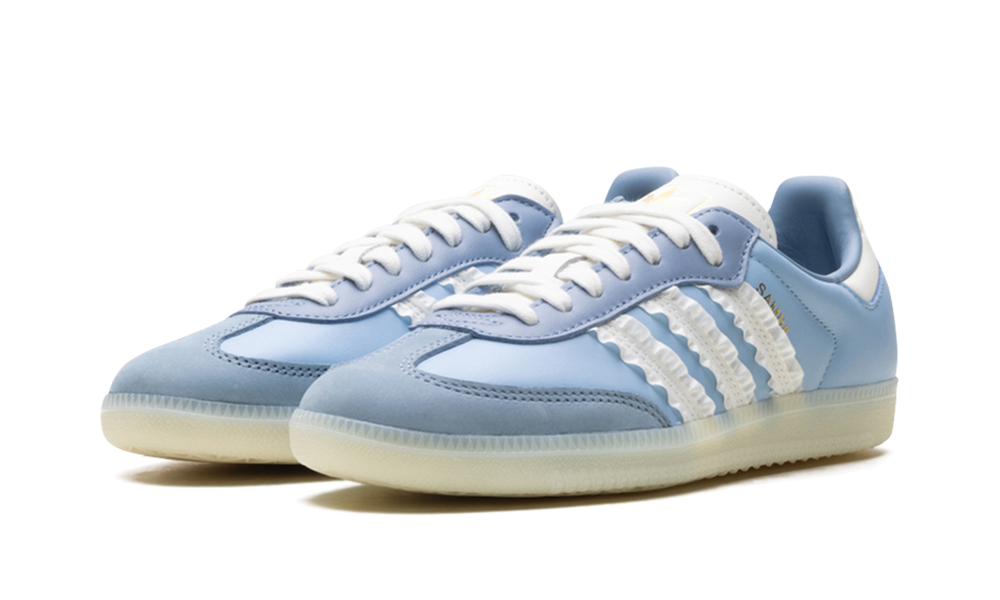 Get ready for a fresh take on a legend with the Adidas Samba Wmns Ruffle Stripes. the charming Clear Sky edition. This women's exclusive reinterprets the classic low-profile sneaker with soft. ruffled Three-Stripes on the sides. adding a delicate. chic detail. The pale blue leather pops beautifully against the white upper and iconic suede T-toe. Grounded by the signature durable gum sole. this fashion-forward Samba brings playful texture and color to your daily rotation.