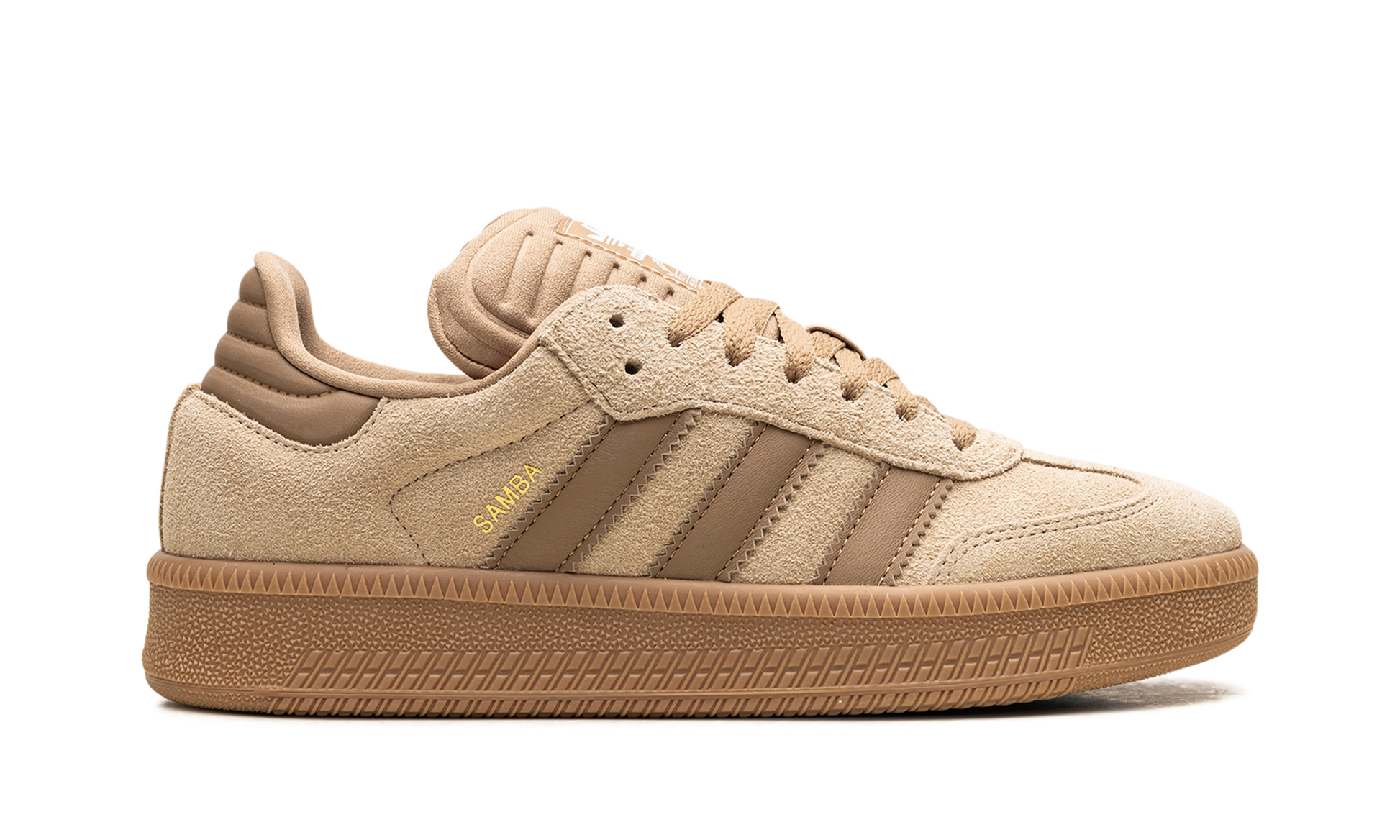 The adidas Samba XLG “Beige/Gumâ€?is a beige-based colorway of the alternate version of the popular retro shoe. The adidas Samba XLG is a modified take on the classic silhouette with a platform-style rubber sole and a thick padded tongue. Here. the shoe has a Beige suede upper with a tonal suede overlay on the toe. A darker shade of beige is used on the Three Stripes branding that appears on the side. A gold “Sambaâ€?stamp can be found on the lateral side of the mid-panel. Classic “adidasâ€?detailing is printed on the tongue. A chunky dark gum rubber sole completes the look.