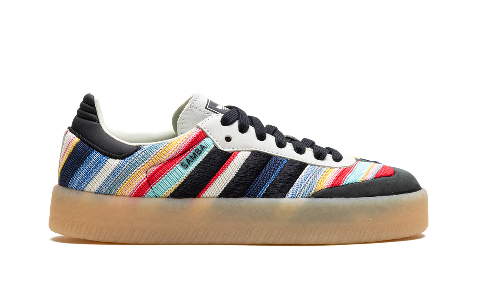 The KSENIASCHNAIDER x Women's adidas Sambae “Core Black/Ivoryâ€?is a collaboration by the clothing brand and adidas on the contemporary lifestyle shoe made with eco-friendly materials. Made with at least 20% recycled materials. the Women's adidas Sambae by KSENIASCHNAIDER features a multicolor textile upper with embroidered black Three Stripes on the sides. A “Sambaâ€?logo appears on the lateral side. while classic “adidasâ€?branding is seen on the tongue. Underfoot. a semi-translucent. platform-style rubber sole completes the look.