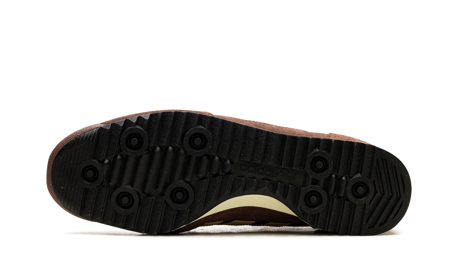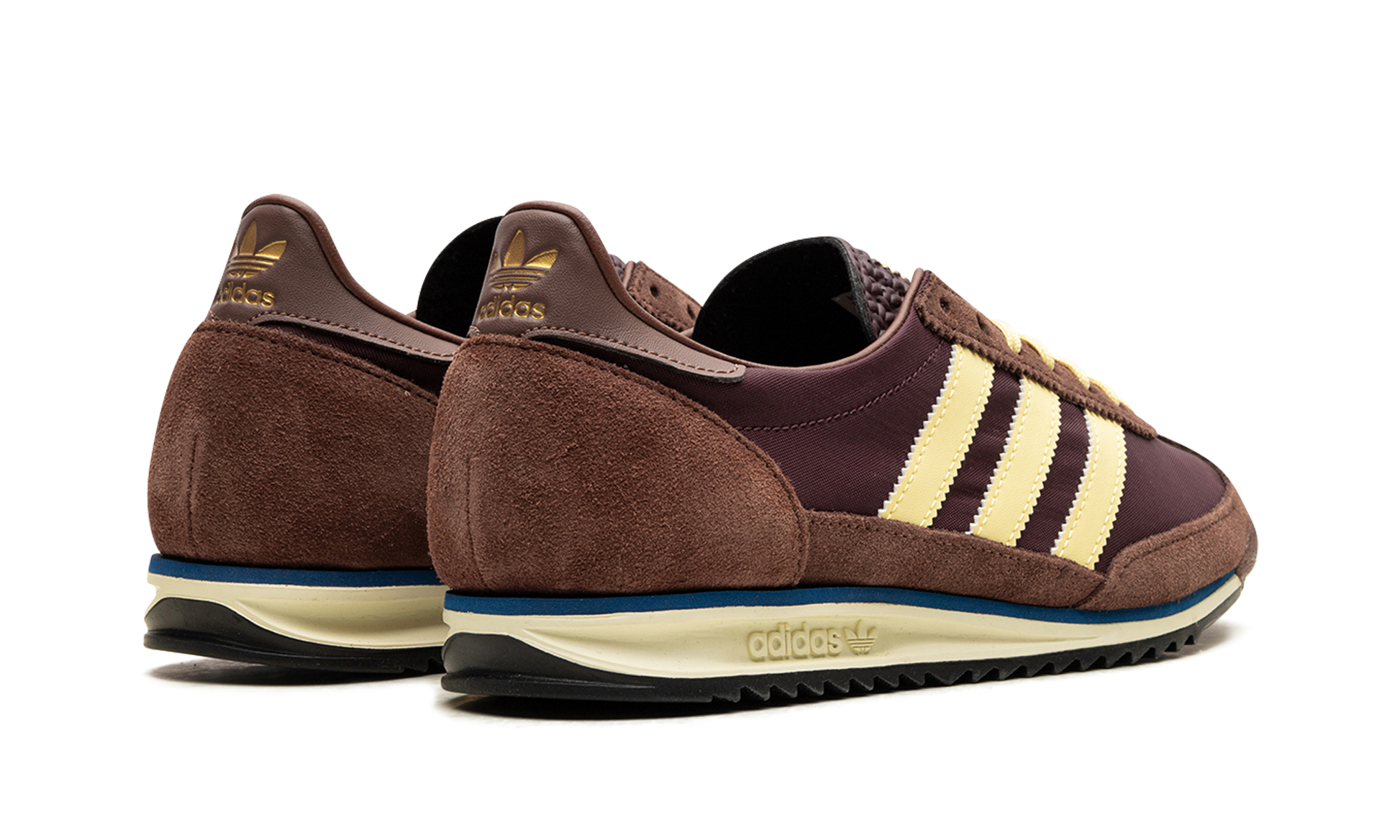 The adidas SL 72 OG Maroon Preloved Brown presents a classic. streamlined aesthetic. Dark brown textile meets light brown suede overlays. creating rich texture. Beige 3-Stripes offer subtle contrast. complemented by gold adidas logos on the heel and tongue. A slim rubber outsole. embossed with the brand's logo. honors its heritage. This sneaker balances retro style with everyday practicality. Its slim silhouette and refined details make it a versatile choice. combining timeless design with comfortable wearability.