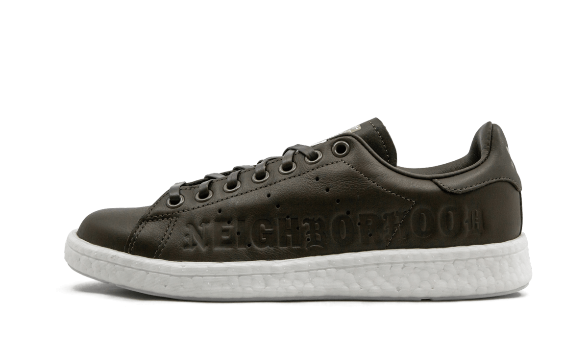The Neighborhood x adidas Stan Smith Boost brings a military-inspired design to the classic tennis shoe. The 2018 Neighborhood collaboration is swathed with various shades of olive. tan. and black. The Stan Smith Boost has a fully tonal aesthetic with an olive green leather upper. A debossed Neighborhood logo runs the length of the lateral side and leather laces accent the premium look. The shoe is finished with a cushy white Boost midsole.