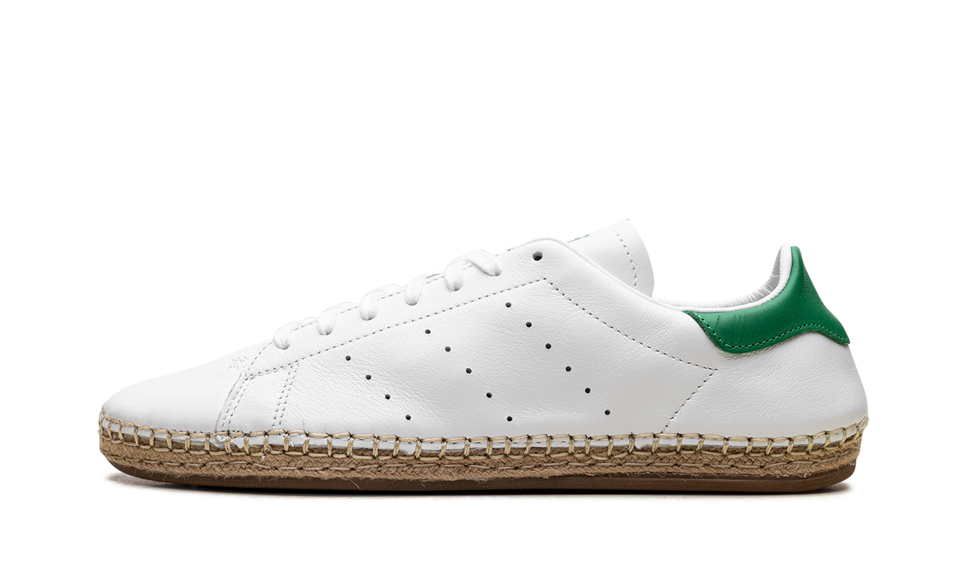 Step into summer with the fresh adidas Stan Smith Espadrille x CLOT sneaker. nicknamed "White Green." This inspired collaboration re-imagines the classic tennis silhouette by swapping the traditional sole for a laid-back woven jute espadrille. perfect for warm-weather style. The premium white leather upper retains the iconic green heel tab and perforated Three Stripes. with subtle CLOT branding on the sockliner. Its deconstructed. relaxed design and gum rubber outsole offer both sophisticated flair and easy comfort.