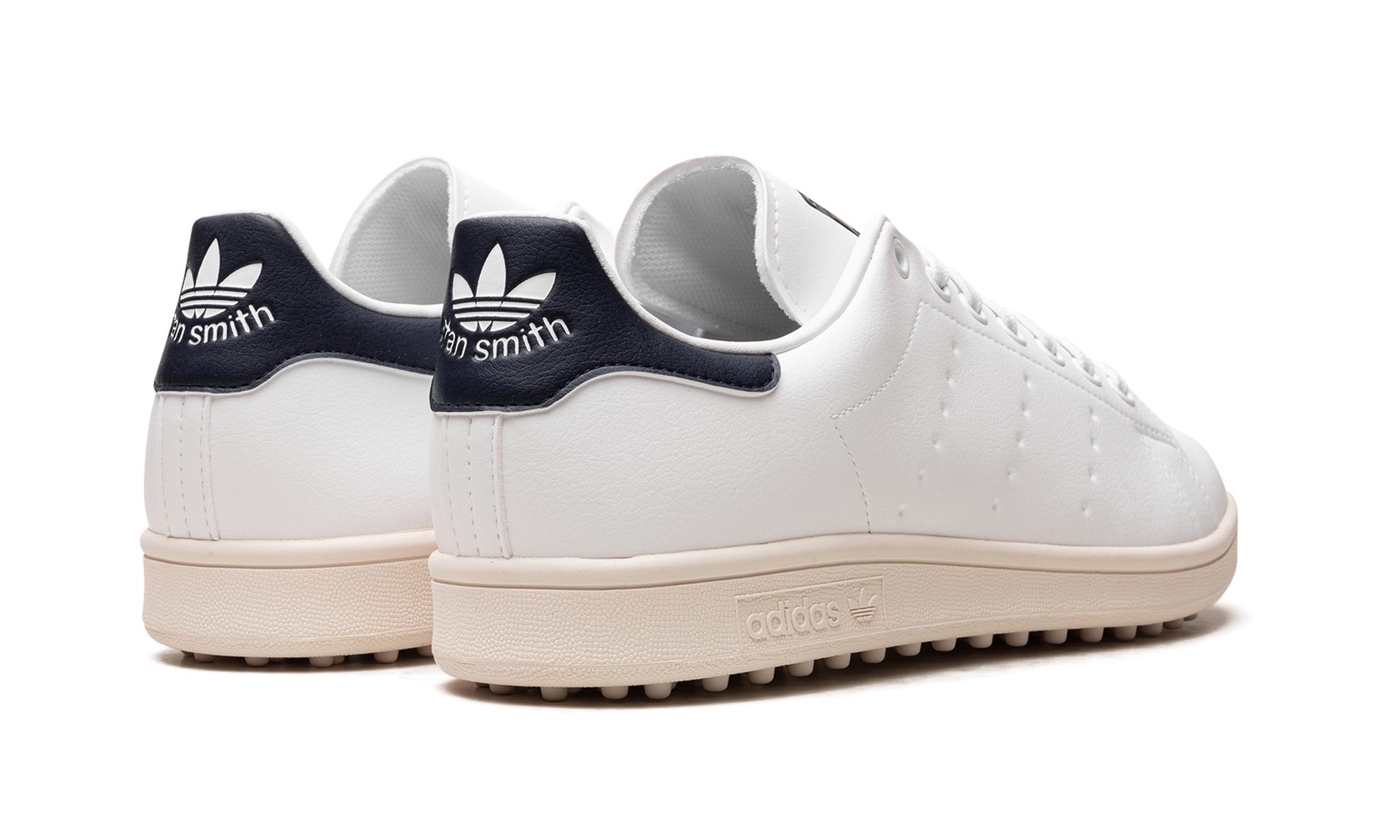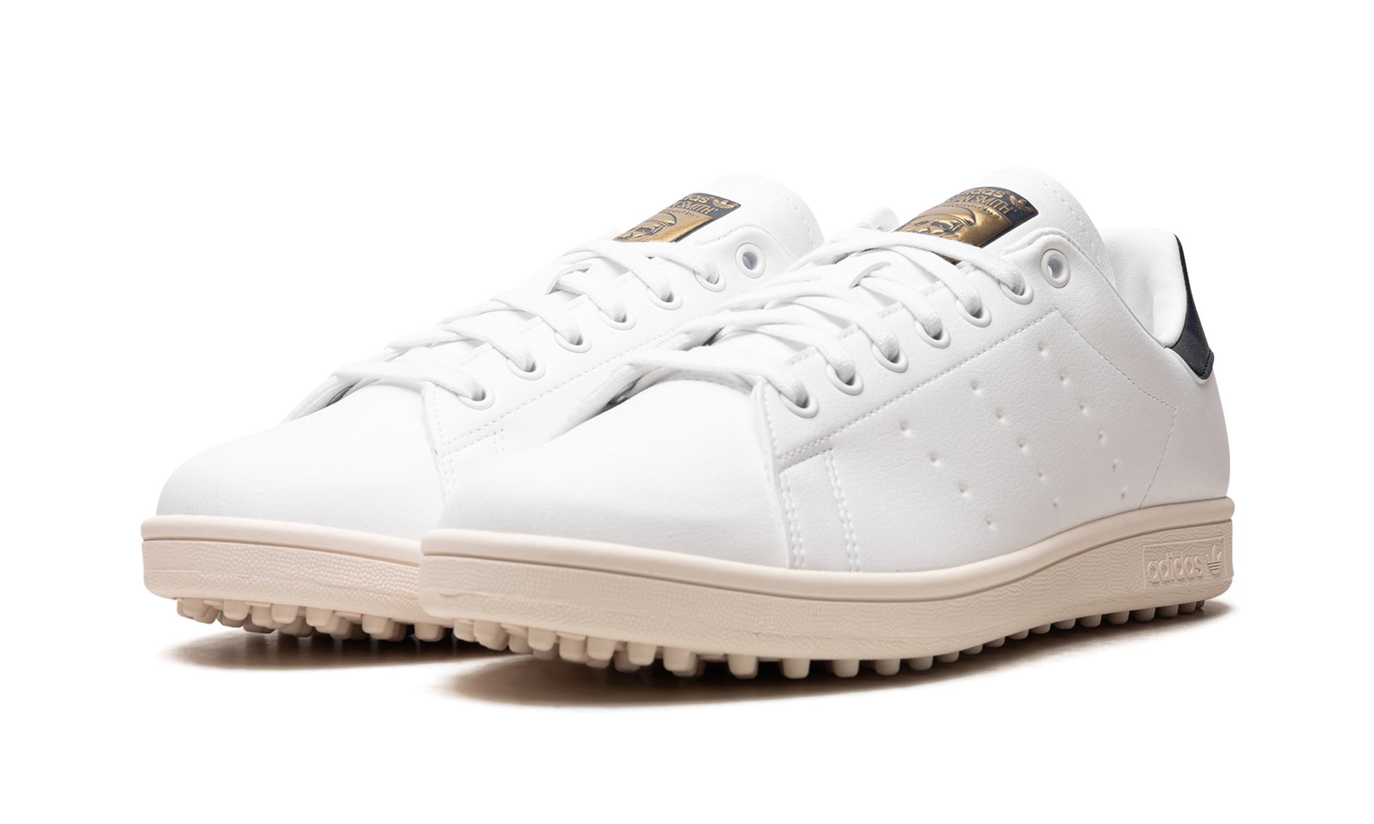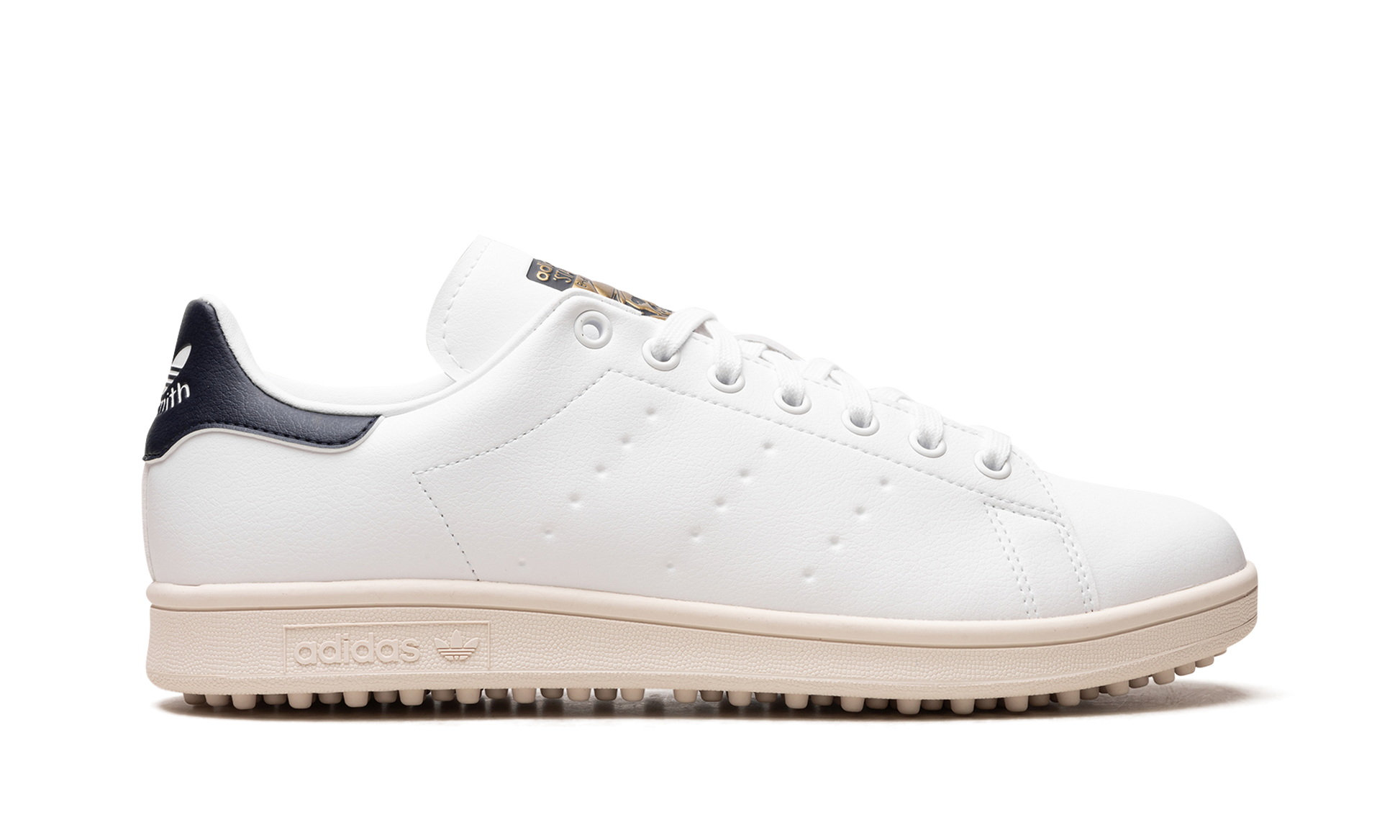 The adidas Stan Smith Golf “White/Navyâ€?is a modified version of the retro tennis shoe made for the fairway. Designed in a White/Navyâ€?colorway. the Stan Smith Golf features a white leather upper with dotted Three Stripes branding on each side of the shoe. A classic “adidas Stan Smithâ€?logo is found on the navy leather heel tab and a metallic gold “Endorsed by Stan Smithâ€?graphic is seen on the tongue. Rubber spikes on the outsole provide traction on the golf course.