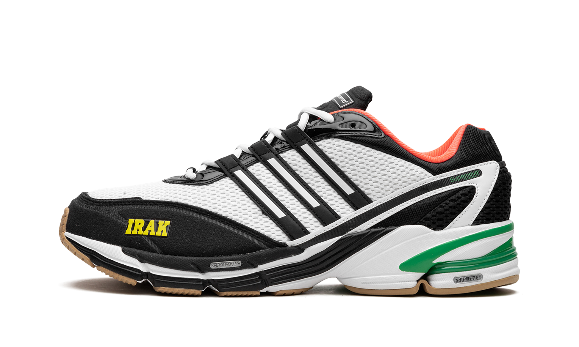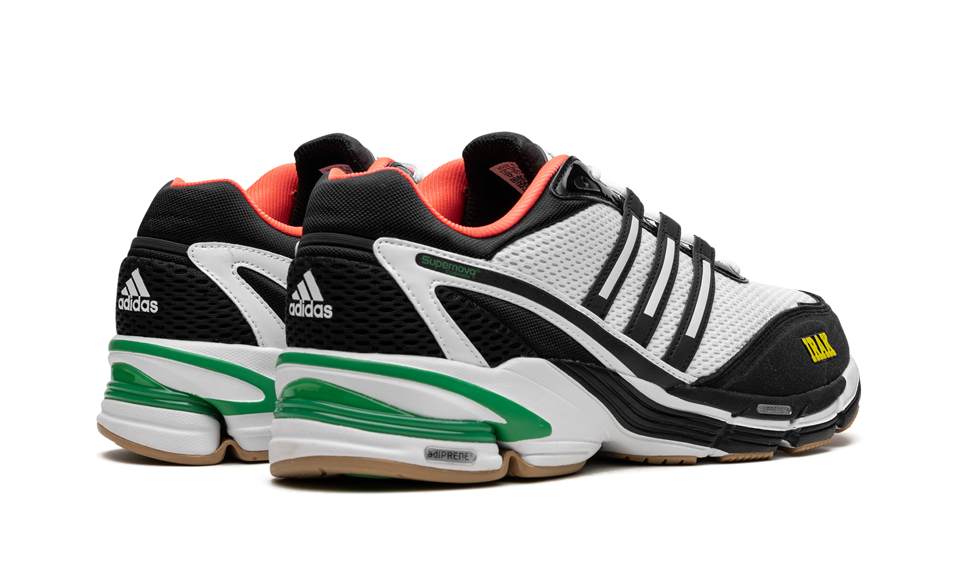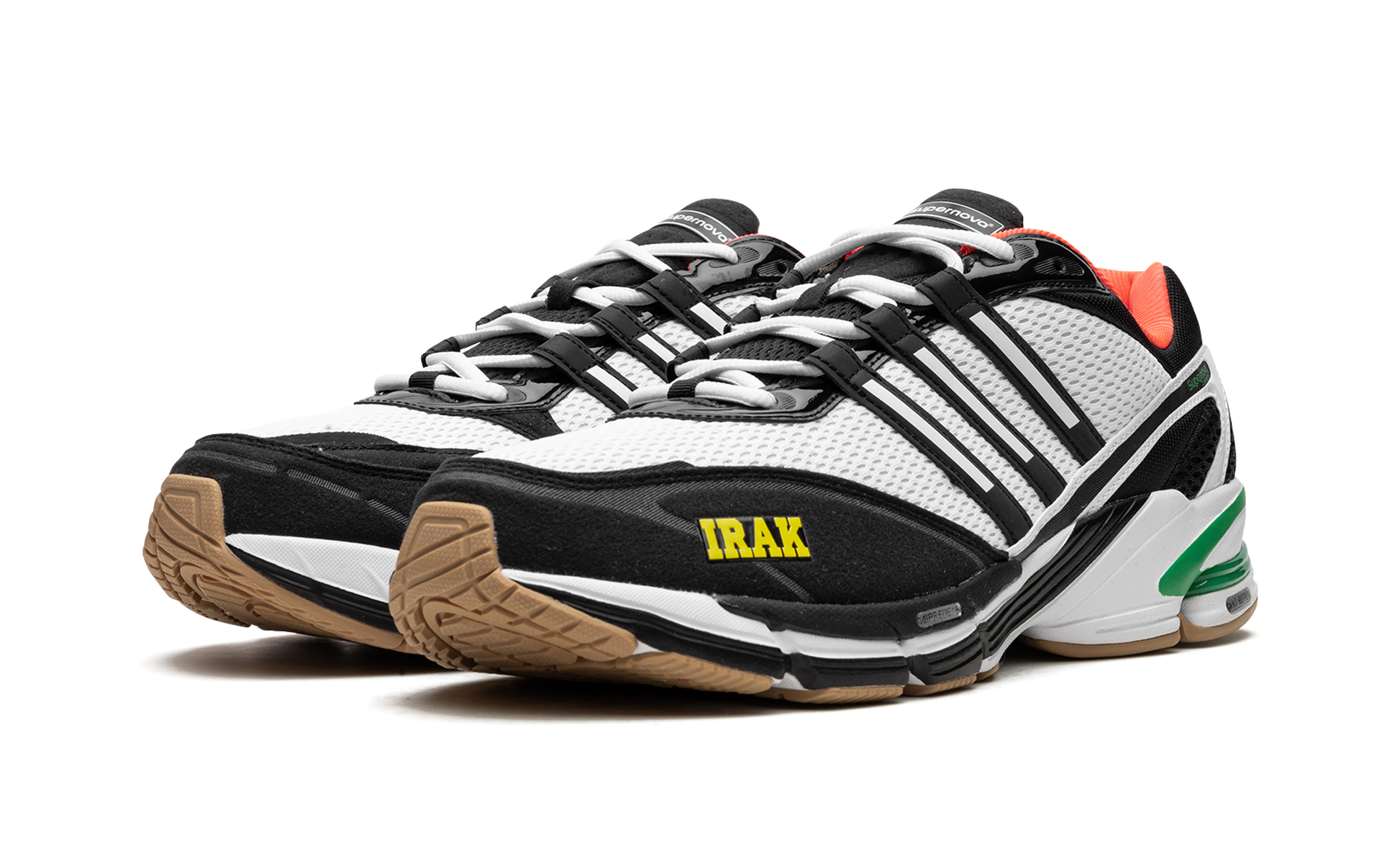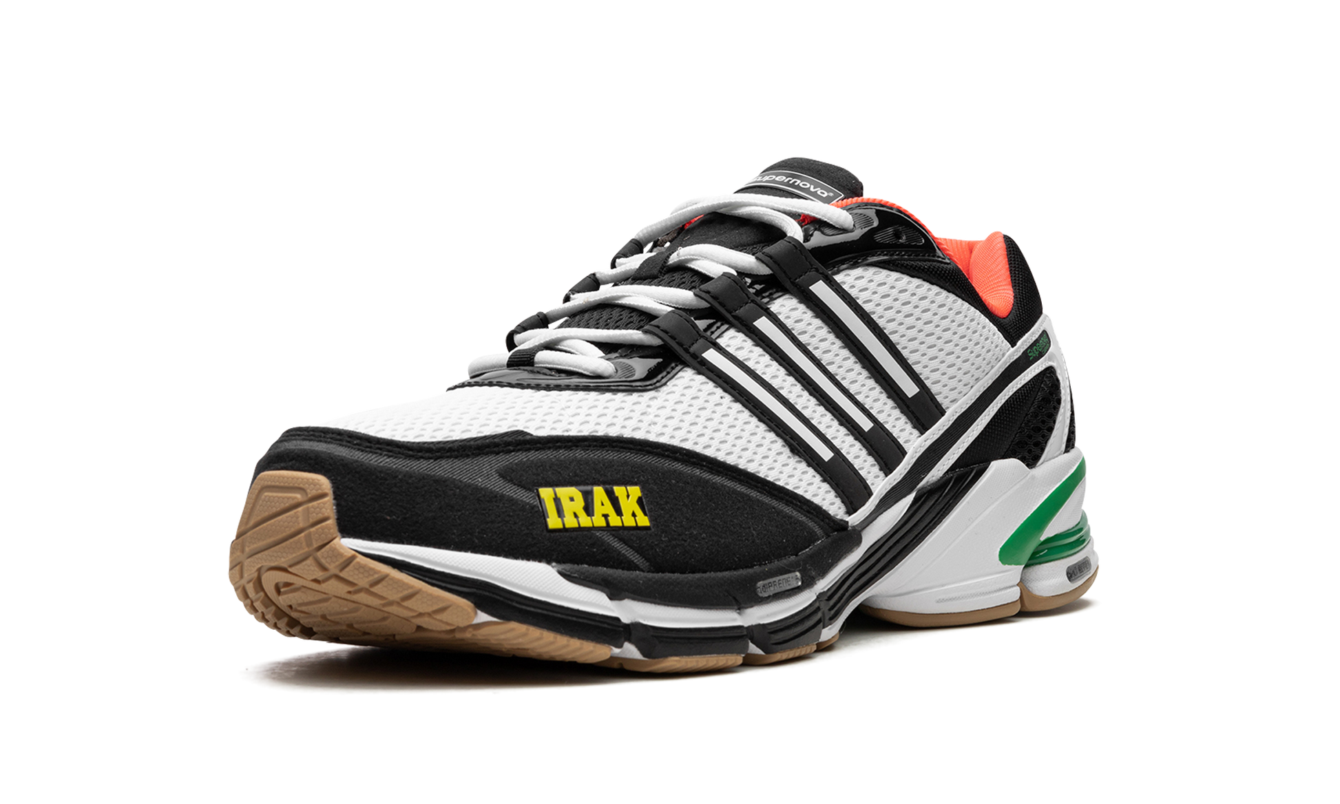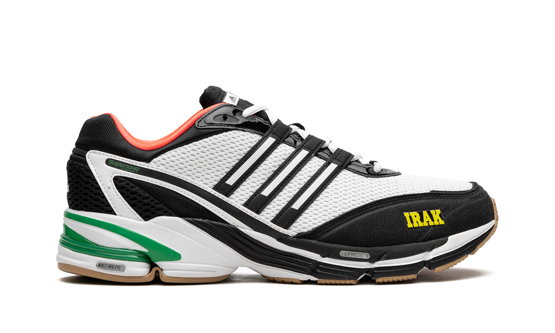 The IRAK x adidas Supernova Cushion 7 is a collaboration by Kunle “Earsnotâ€?Martin's legendary New York City graffiti crew and streetwear brand on the retro running shoe. Yet another popular collaboration between IRAK and adidas. the two brands bring a fresh new look to the adidas Supernova Cushion 7. The colorway features a white open-pore mesh construction with black foam padding with yellow “IRAKâ€?branding appearing on the toe. The Three Stripes detailing found on the side is seen in white-and-black. A coral-colored inner lining complements the design. Underfoot. the shoe is mounted on an adiPRENE and EVA foam cushioned midsole. Release date: January 28. 2023