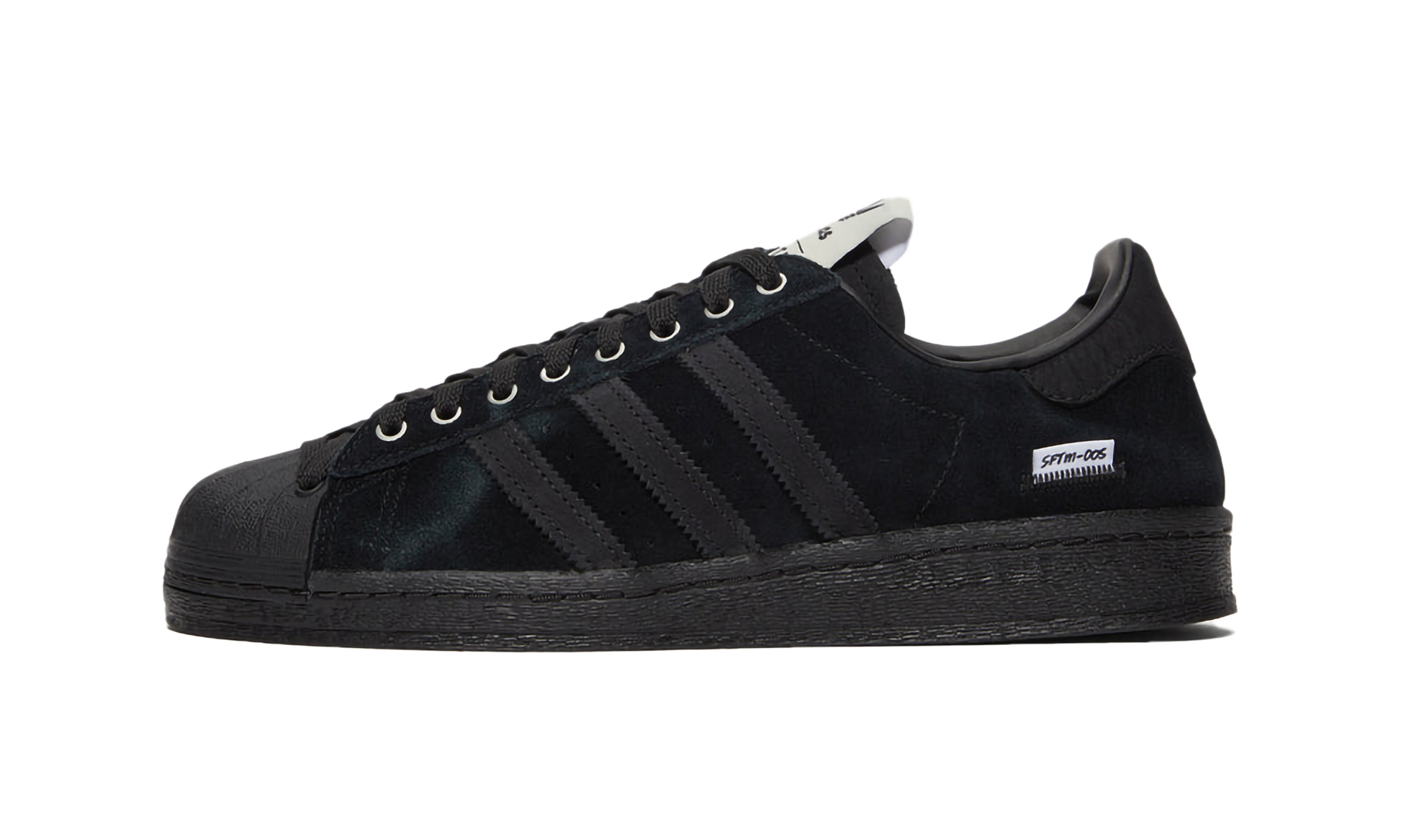 The Superstar 82 'Song For The Mute - Core Black' shoe blends classic Adidas Superstar style with a unique design inspired by the "Song For The Mute" collaboration. featuring a sleek core black aesthetic.