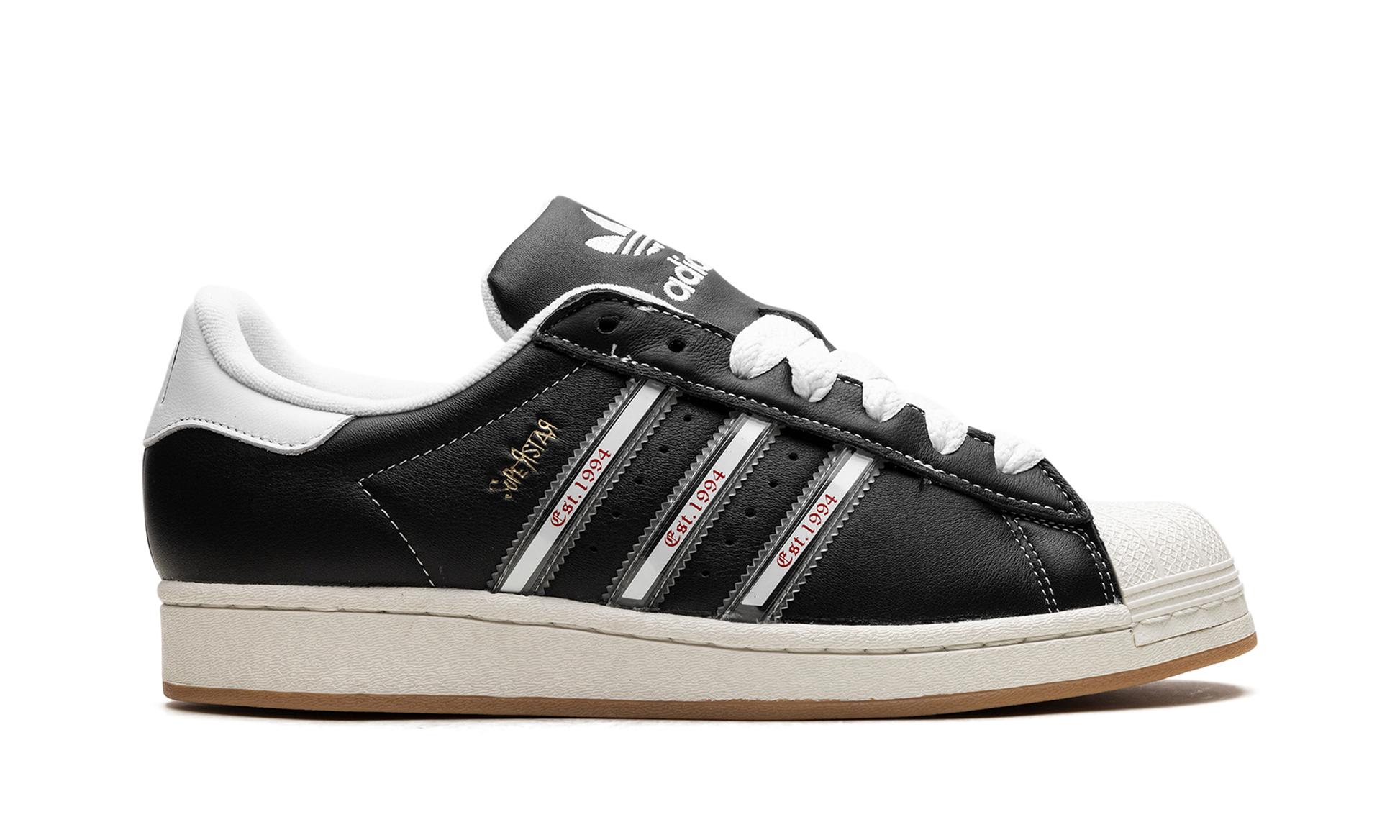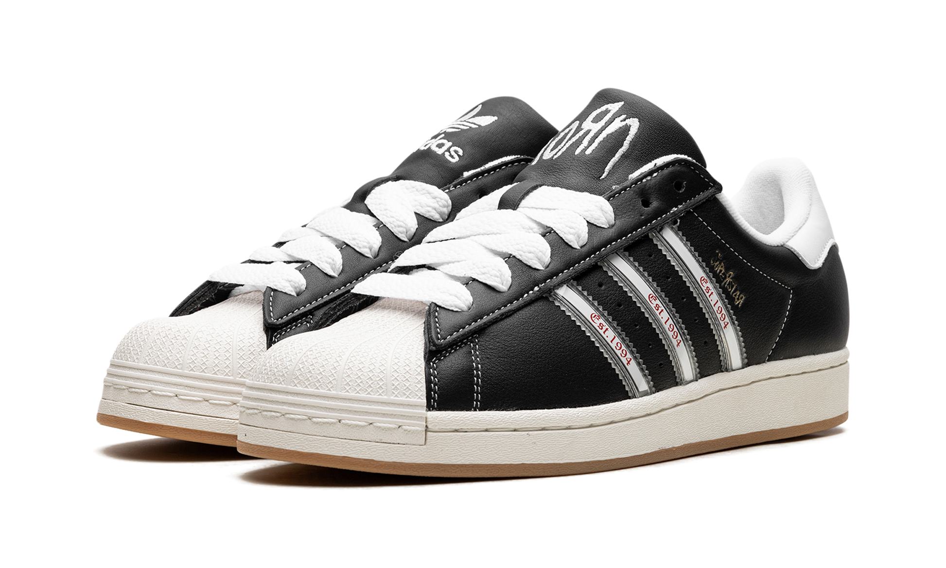 The Superstar 'Korn - 30th Anniversary' shoe celebrates three decades of the iconic band Korn. blending classic Adidas Superstar style with unique design elements inspired by their legacy.