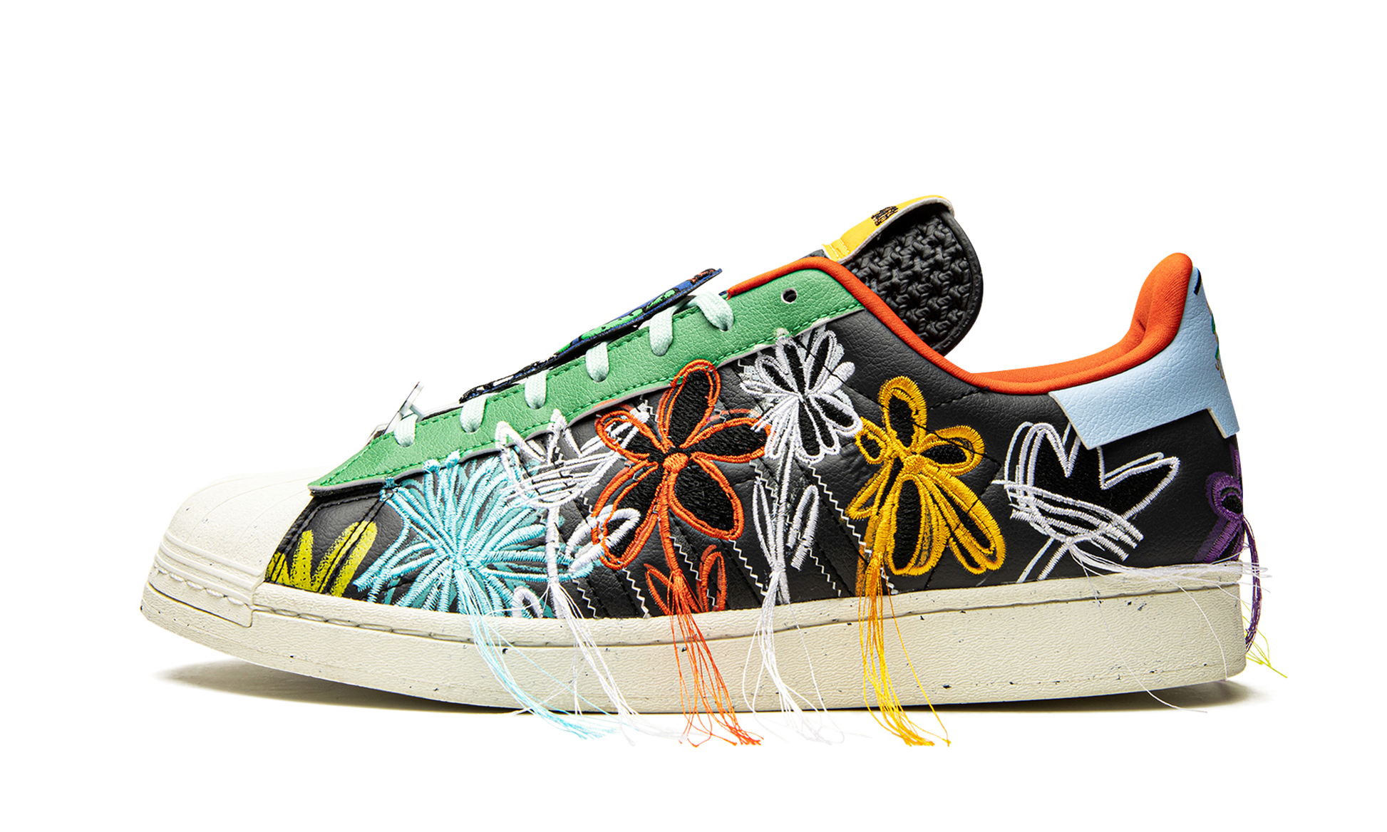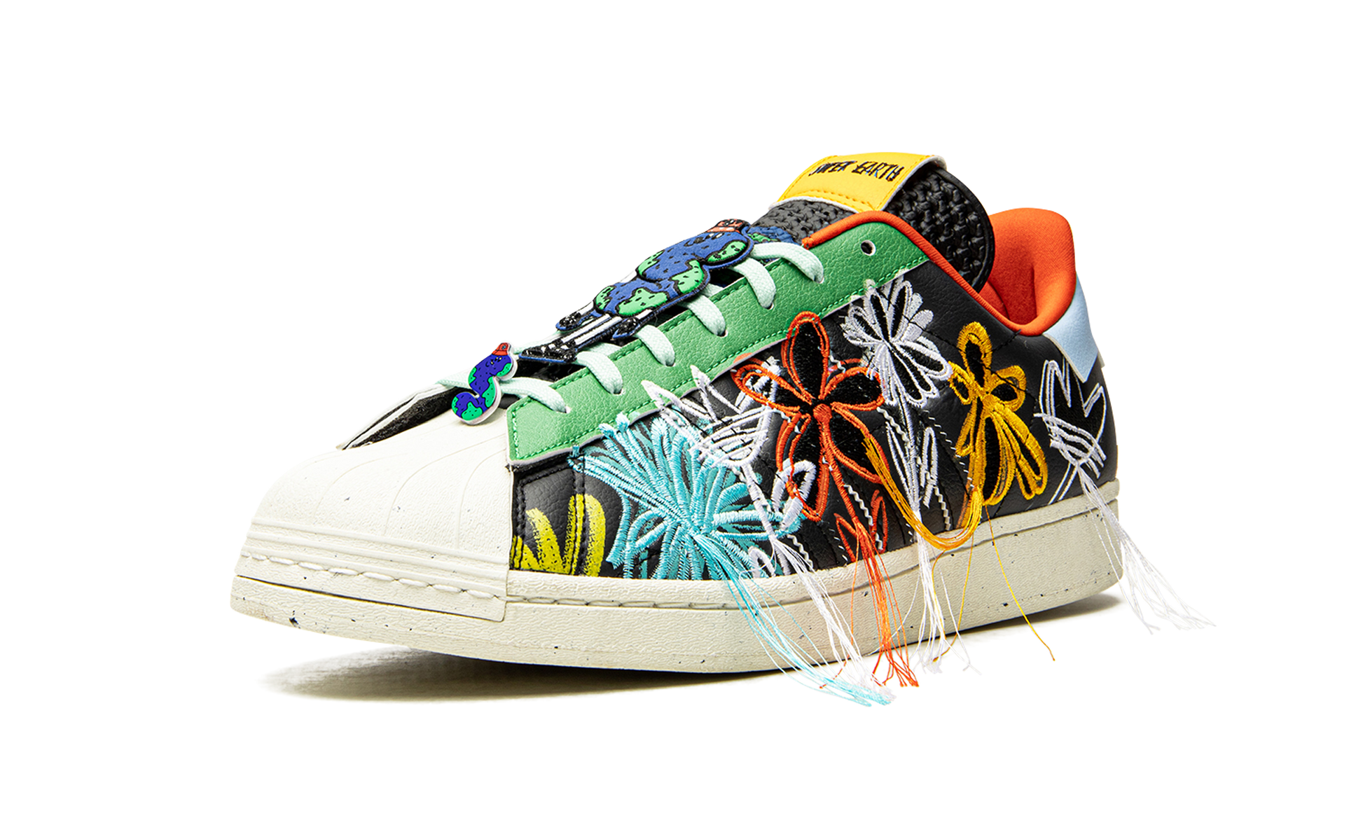 The Superstar 'Sean Wotherspoon - Superearth' shoe features a unique design by Sean Wotherspoon. incorporating sustainable materials and vibrant colors for a distinctive and eco-conscious take on the classic Superstar.