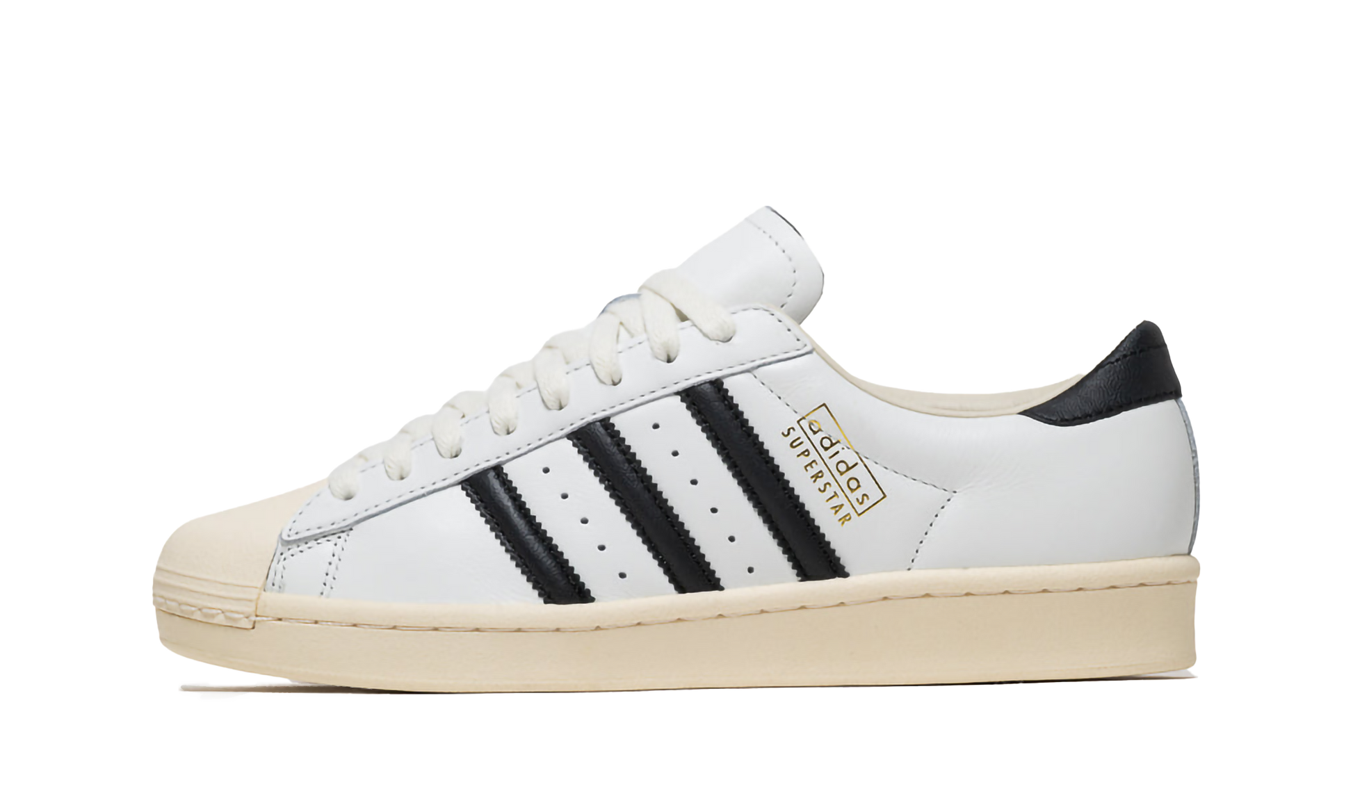 The Superstar Vintage 'White / Black / Antique' shoe features a classic design with a vintage aesthetic. offering a timeless addition to any sneaker collection.