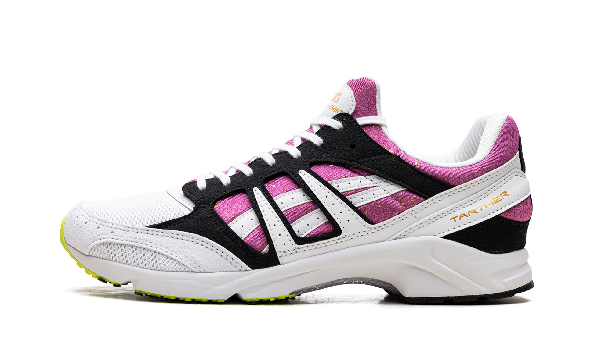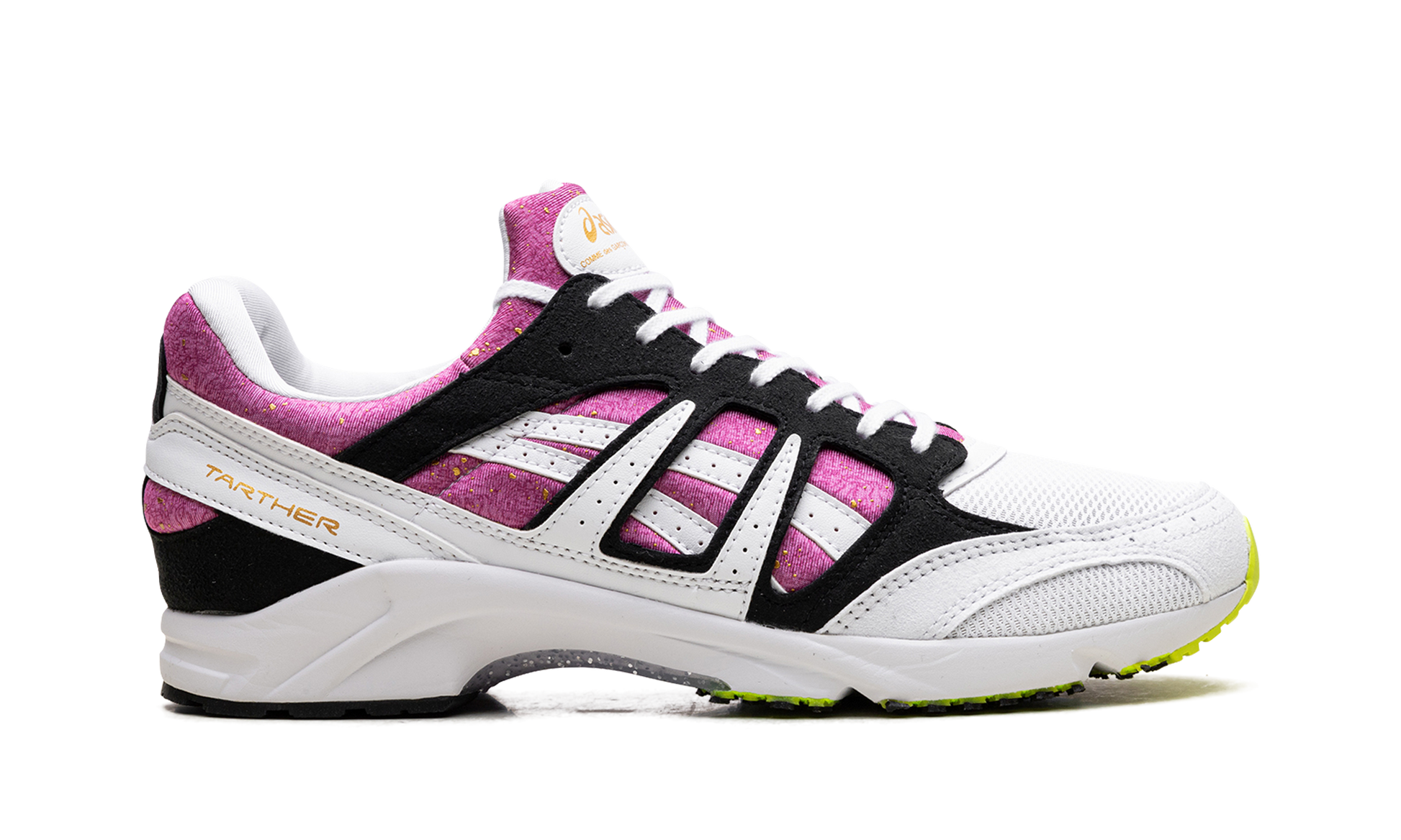 You've picked an absolute stunner with the ASICS x Comme des Garçons SHIRT Tarther SD 'Orchid' sneakers! Step out in high-fashion retro style with the exclusive ASICS x Comme des Garçons SHIRT Tarther SD 'Orchid'. This vibrant collaboration re-imagines the classic 1983 Tarther runner with a striking Orchid (purple/pink) base and luxurious metallic gold speckles. contrasting beautifully against white mesh and black suede. Experience premium comfort with an EVA-cushioned midsole. and enjoy high-end detailing like gold foil co-branding on the tongue and heel. These limited-edition sneakers are a must-have piece for any dedicated sneaker enthusiast.