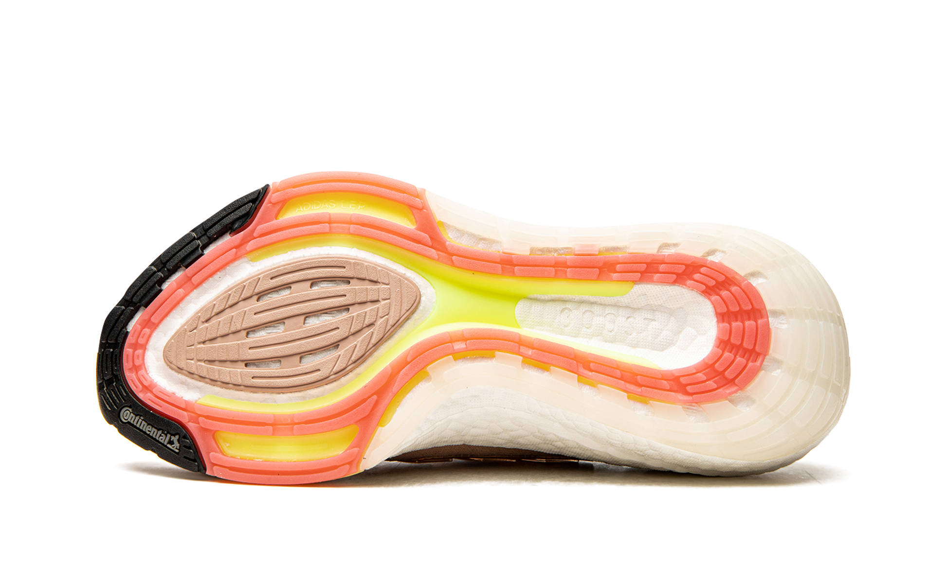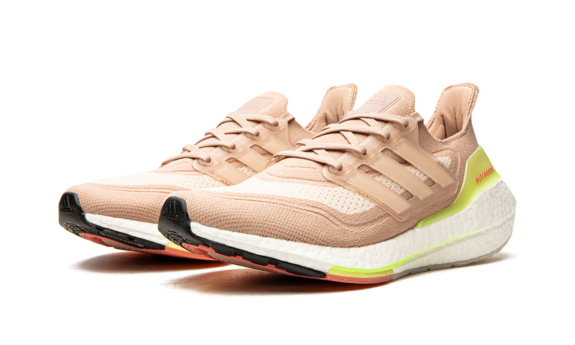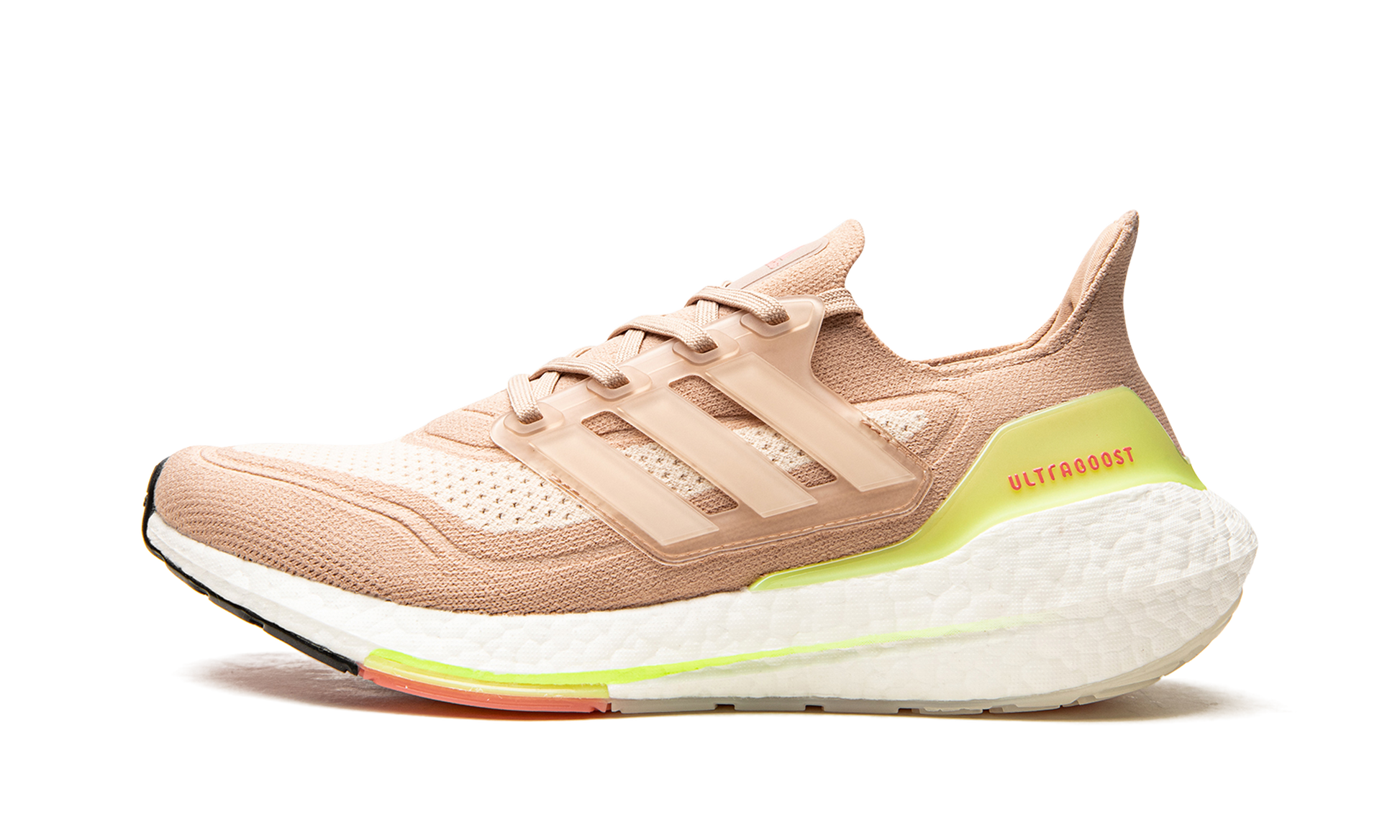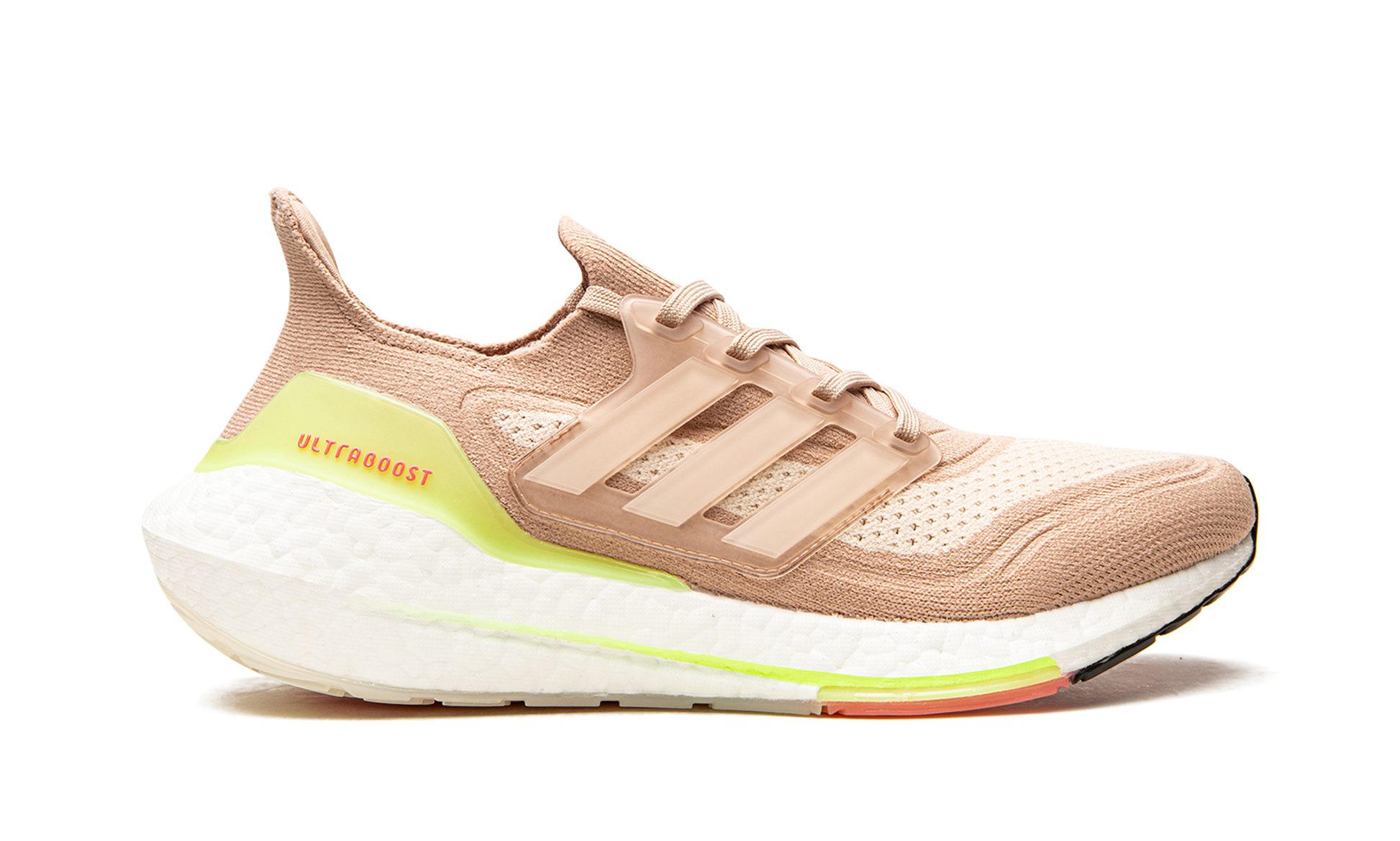 The adidas UltraBoost 21 brings weight. cushioning. and responsiveness to the next level. Updated with increased energy return. breathability. and sustainability. this women's running shoe claims more Boost capsules in the midsole and an upper constructed of Primeblue. a high-performance recycled material made in part with Parley Ocean Plastic. In terms of color. neutral tones of beige and ivory white are met with bright yellow and pink accenting.