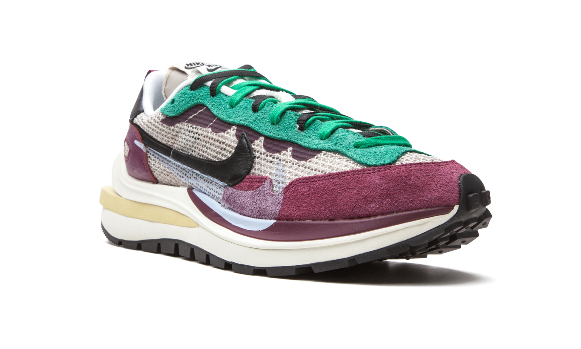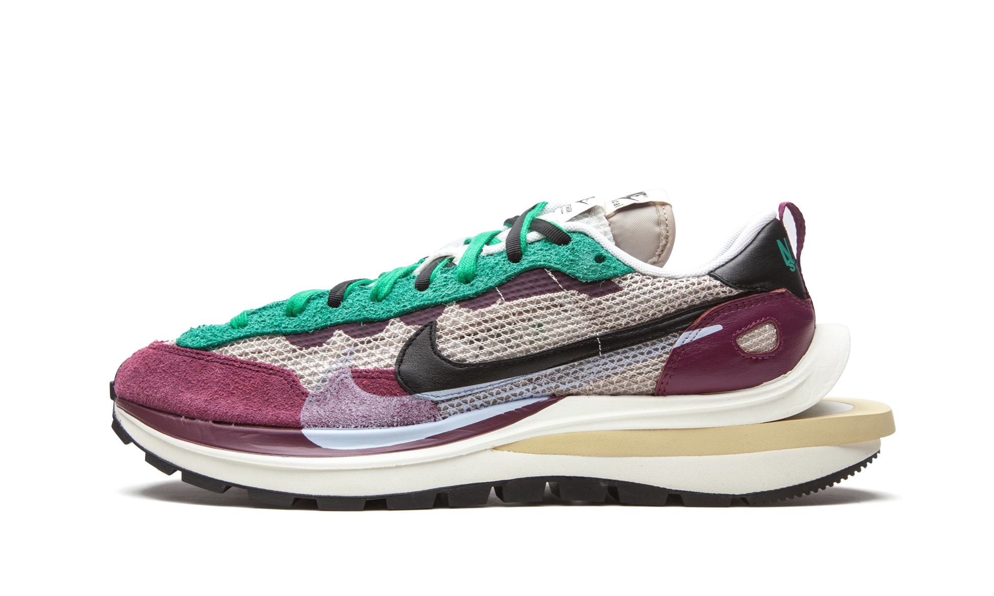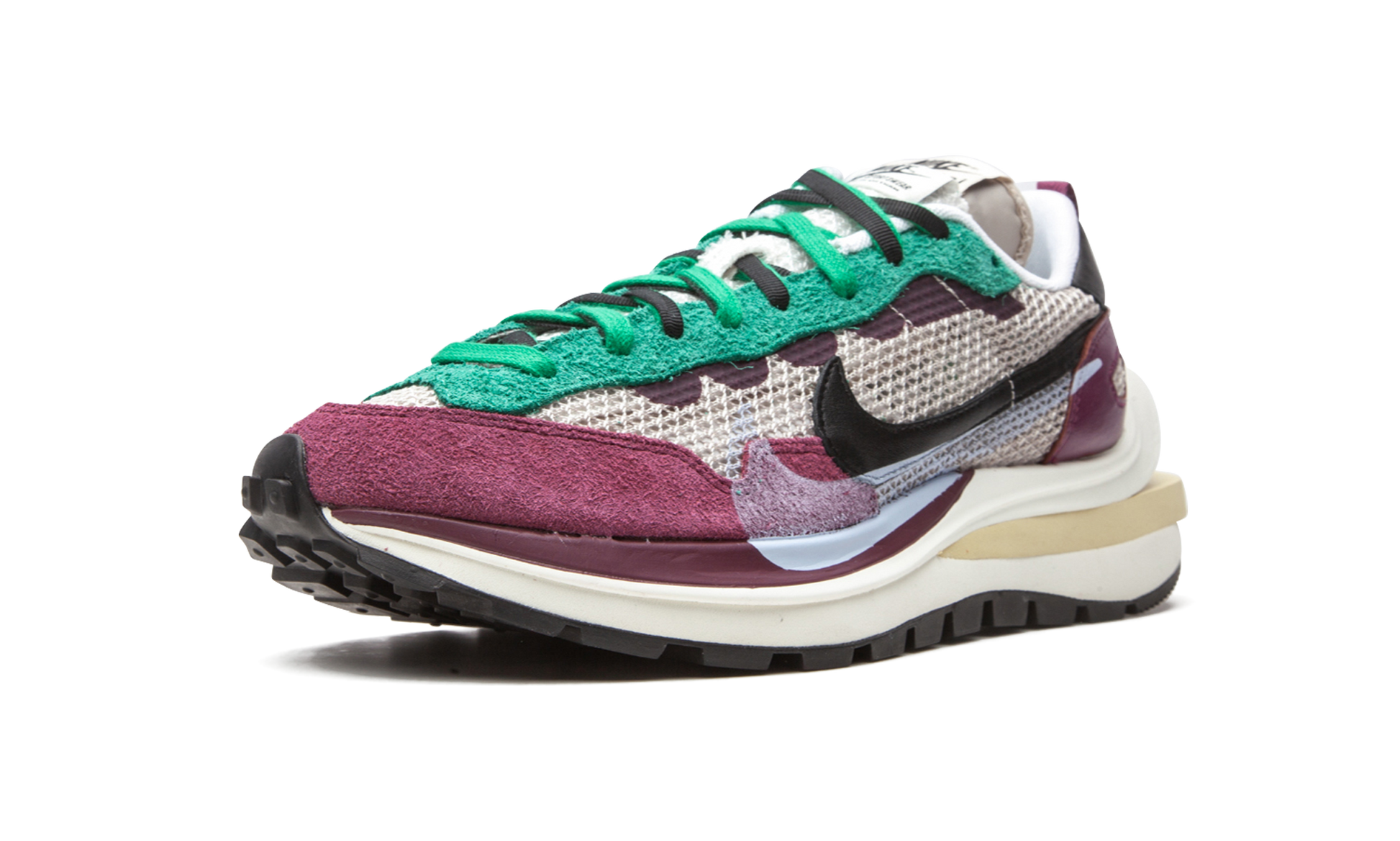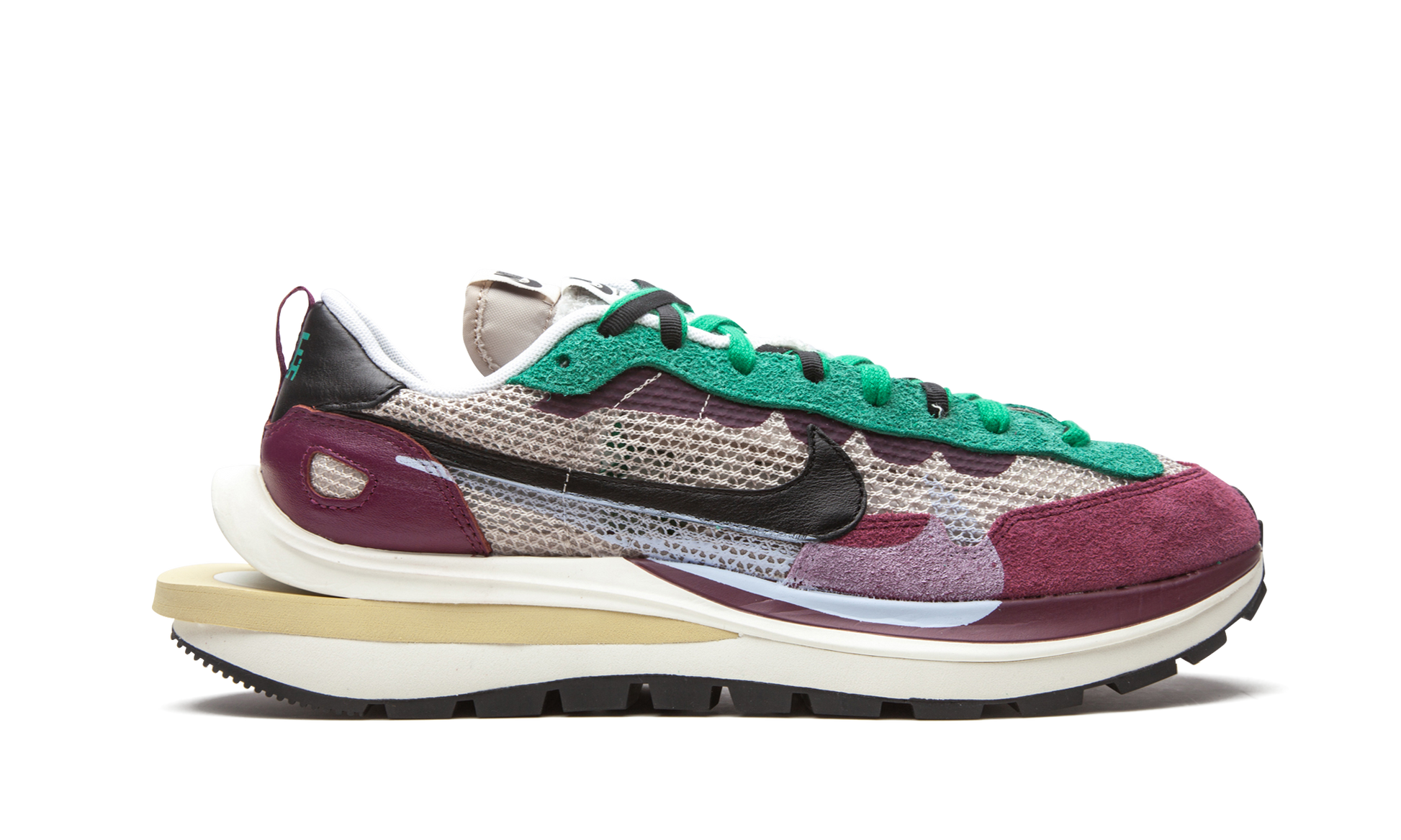 The sacai x Nike VaporWaffle “Villain Redâ€?is a one of several debut colorways of the silhouette that incorporates elements of Nike's modern Vaporfly and retro Air Pegasus '83 runners. The “Villain Redâ€?colorway of the avant-garde styled VaporWaffle follows the order of sacai's design preference of doing everything in “twosâ€?with its collections with Nike. Like sacai and Nike's LDWaffle model from 2019. the VaporWaffle has two Swooshes on either side of the mesh mid-panel—one on black leather and one in light blue paint slightly below it. Neptune Green suede overlays around the eyelets and on the laces contrasts the Villain Red hue of the hairy suede toe overlay. The same shade of red appears on the leather detailing on the back of the shoe beneath the black leather heel tab with dual green sacai and Nike branding. Layered white mesh and tan nylon tongues can be found beneath the black and green laces. The stacked midsole splits at the heel in a shape reminiscent of the Vaporfly to complete the bold and unique look. Release date: December 17. 2020.