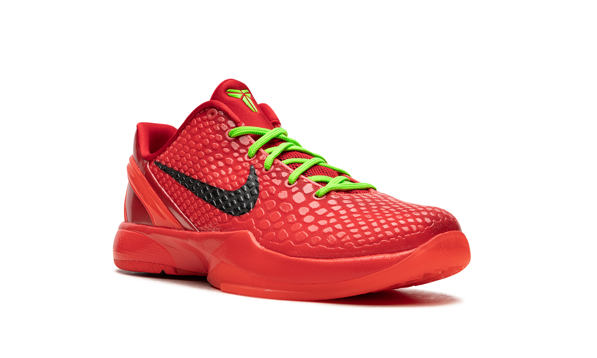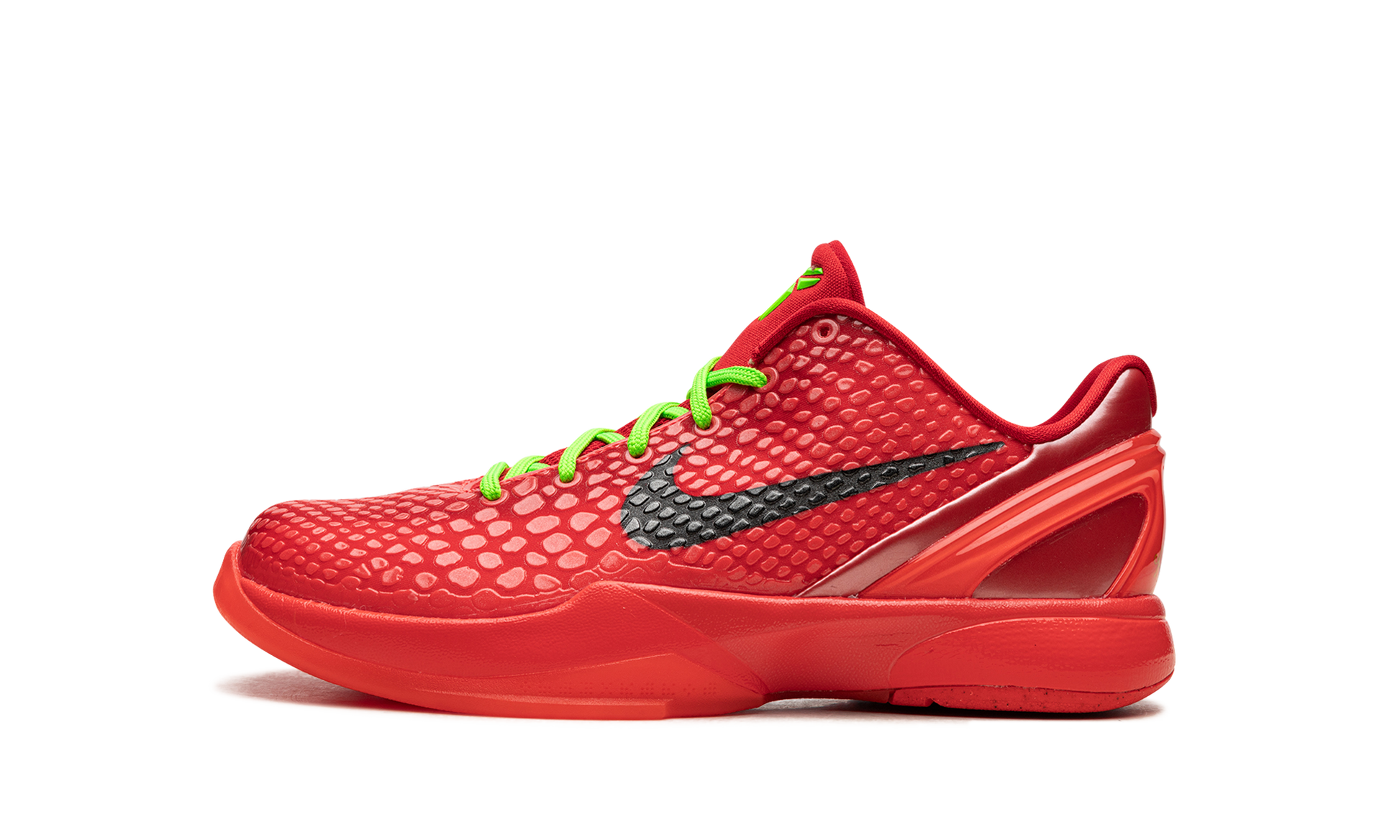 The Nike Zoom Kobe 6 Protro GS "Reverse Grinch" is the youth sizing of the alternate version of the popular. Christmas-inspired colorway of Kobe Bryant's sixth signature shoe. Inspired by the mostly all-green Kobe 6 “Grinchâ€?colorway. the “Reverse Grinchâ€?flips the original design's color block to feature a red upper with green laces. The shoe is complete with a Bright Crimson snakeskin-textured upper with black Swooshes on the sides. Both the laces and Kobe's “Sheathâ€?logo are designed in Electric Green. A Bright Crimson rubber sole completes the look. Release date: December 16. 2023