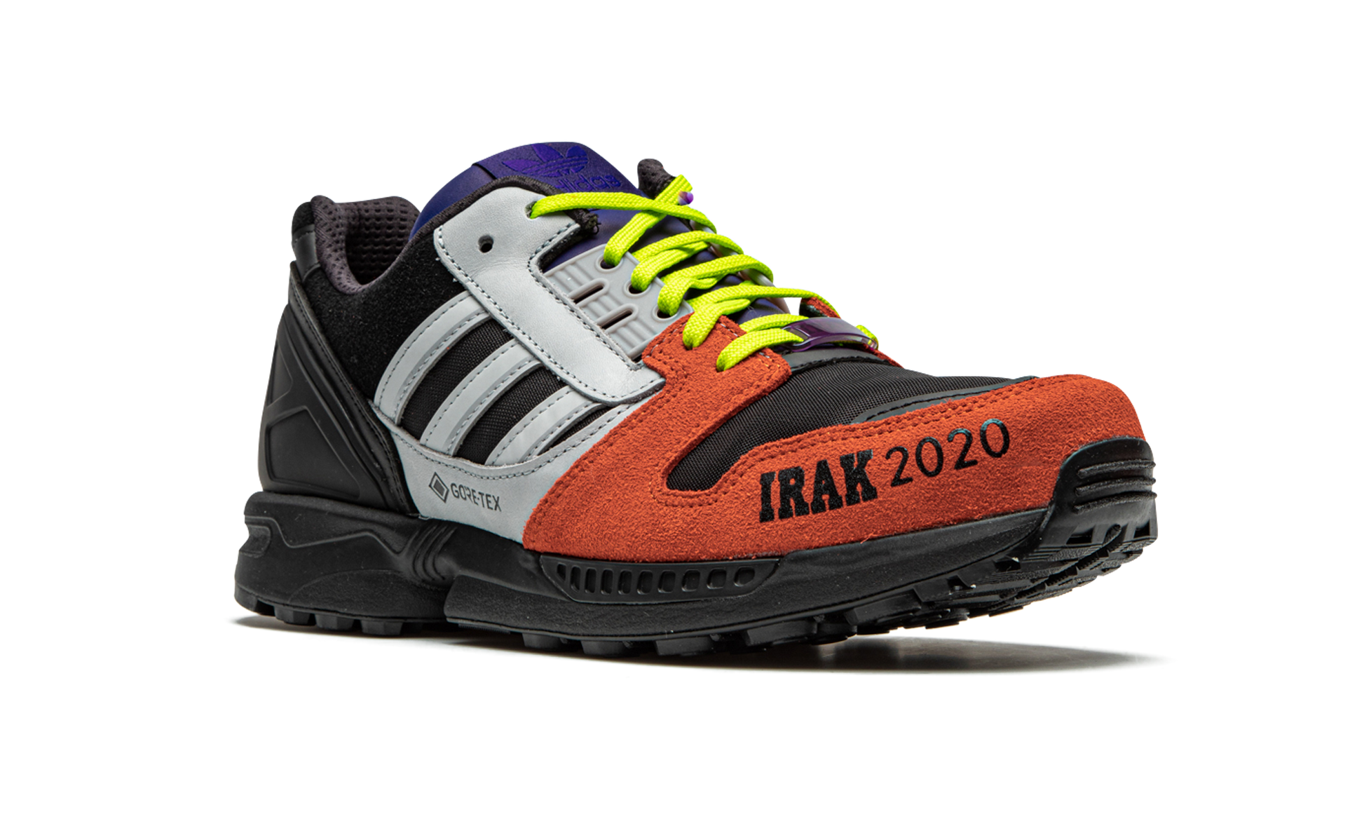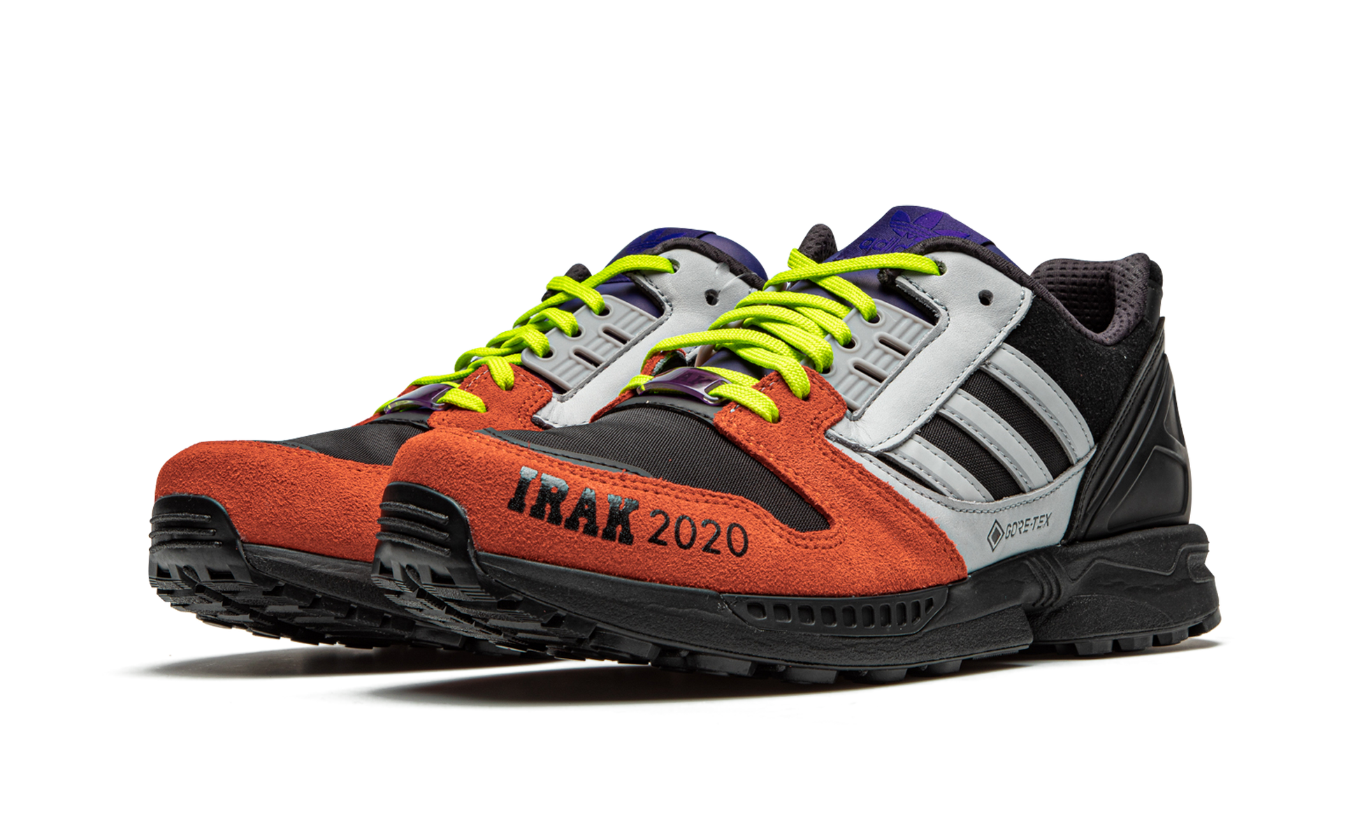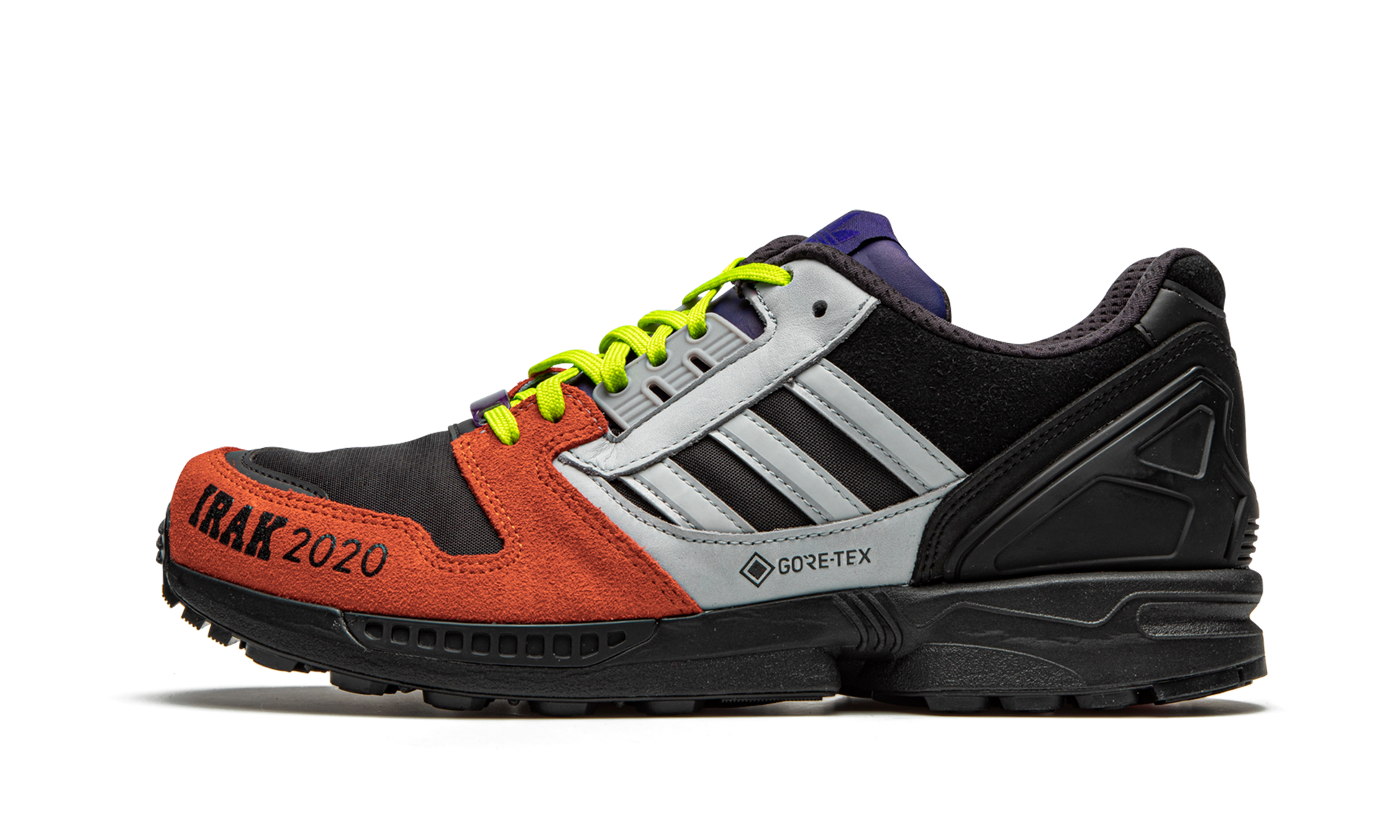 The IRAK x adidas ZX 8000 GTX “Orange/Blackâ€?is one of two colorways created by the New York City graffiti crew in collaboration with adidas. Back in 2007 and 2008. adidas enlisted Kunle “Earsnotâ€?Martins and members of the IRAK graffiti collection to apply their artistry to the brand's ZX 8000 GTX silhouette. Featuring a vibrant color scheme that matches the personalities of each member of IRAK. the two late-aughts releases are considered some of the best collaborations under adidas's umbrella. Here. this “Orange/Blackâ€?look is a return to form. Hairy burnt orange suede dots the toe cap. Silver “IRAK 2020â€?branding is printed onto the material as a salute to the styling of the original IRAK x adidas collection. Weather resistant GORE-TEX insulation keeps your feet protected against the elements. Silver leather Three Stripes detailing dots either side. Bold lime green cotton laces. a blue nylon tongue. and black synthetic overlays on the heel completes the look. Release date: August 28. 2020.